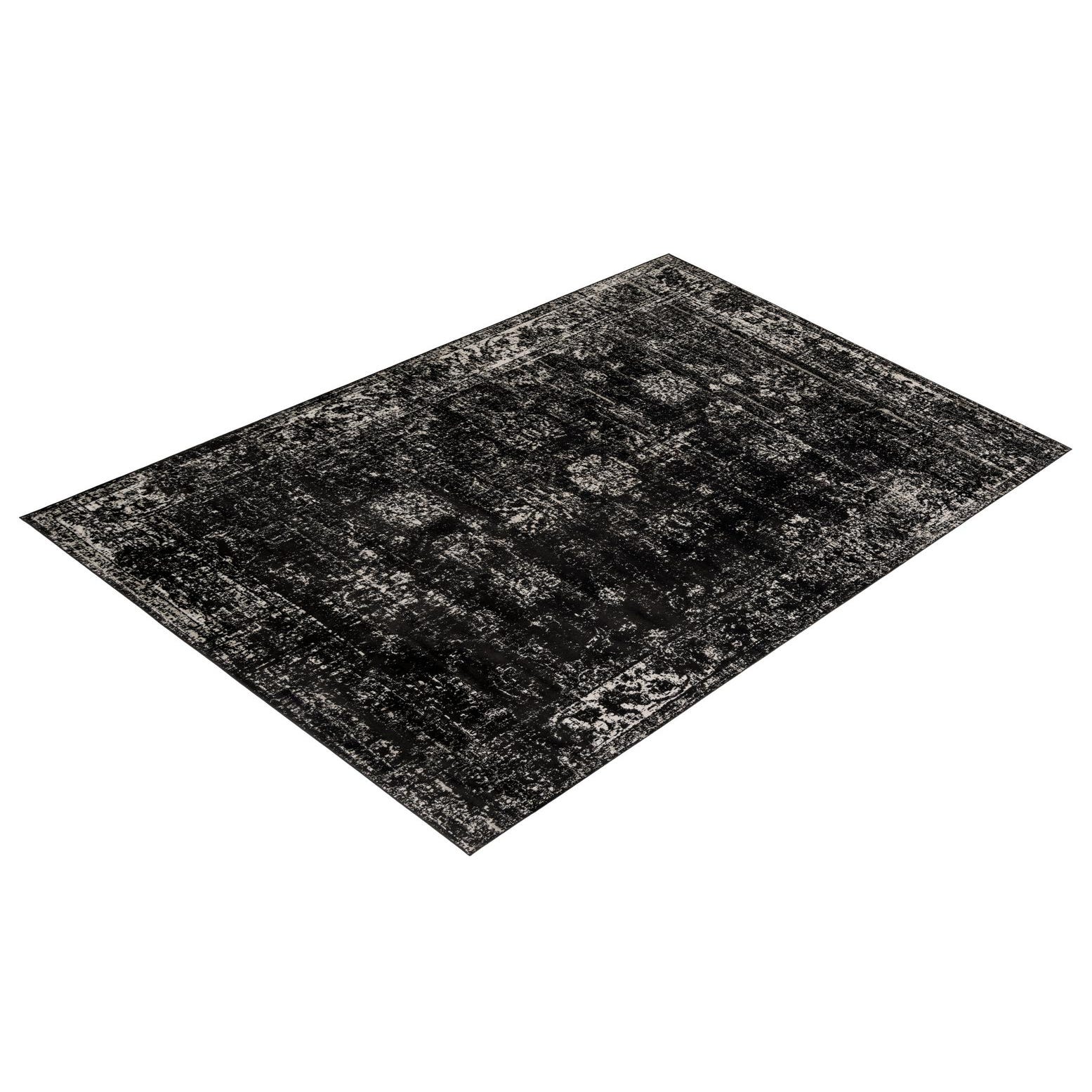 A distressed, vintage-inspired medallion pattern unfolds across a rich black background, with gray and ivory highlights forming worn ornamental motifs that soften the overall look. The design balances classic rug elements with a muted, lived-in aesthetic that adds depth without high contrast. Constructed from 100% polypropylene, the surface has a dense, low-pile hand that feels smooth underfoot and lays flat to showcase the pattern’s subtle variations.