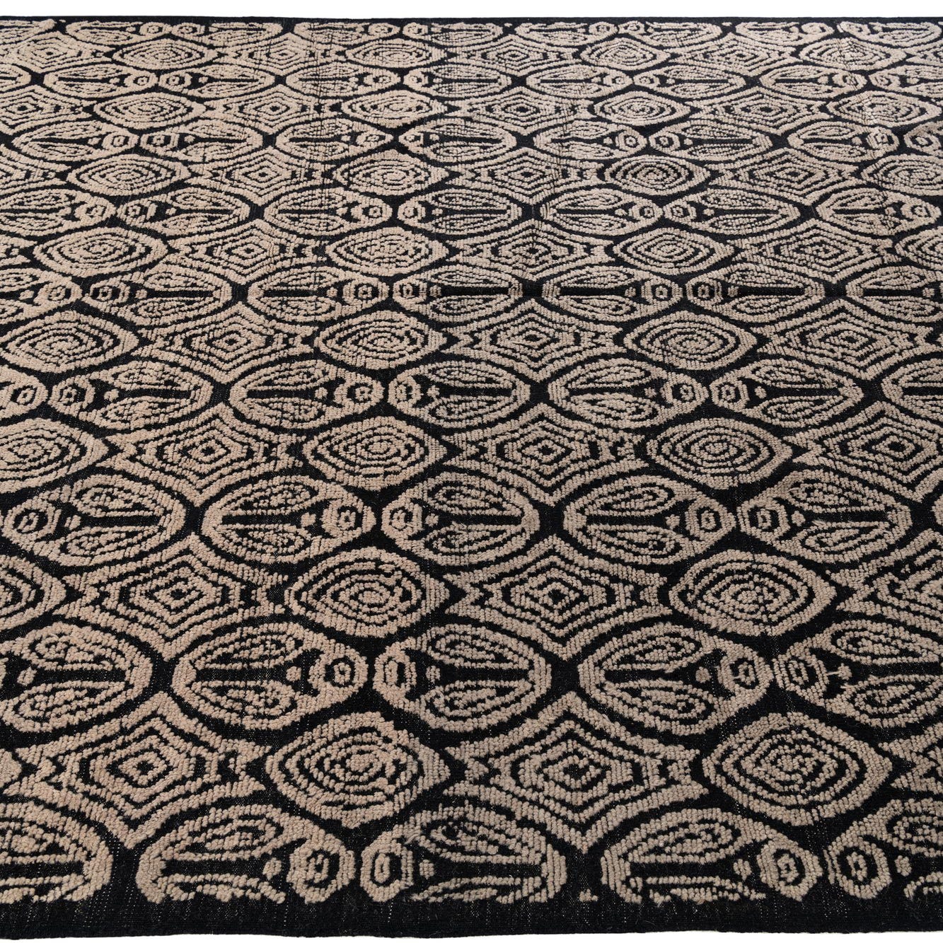A 10x14 rectangular black wool shag rug with a repeating tribal and modern pattern in a lighter contrasting tone.