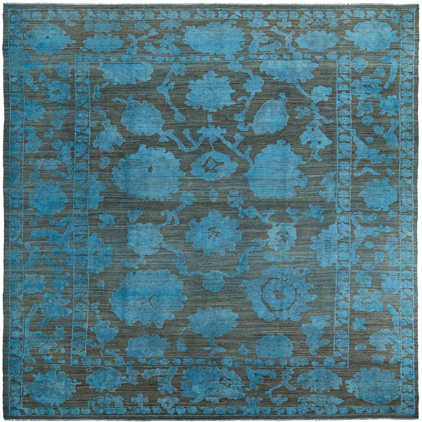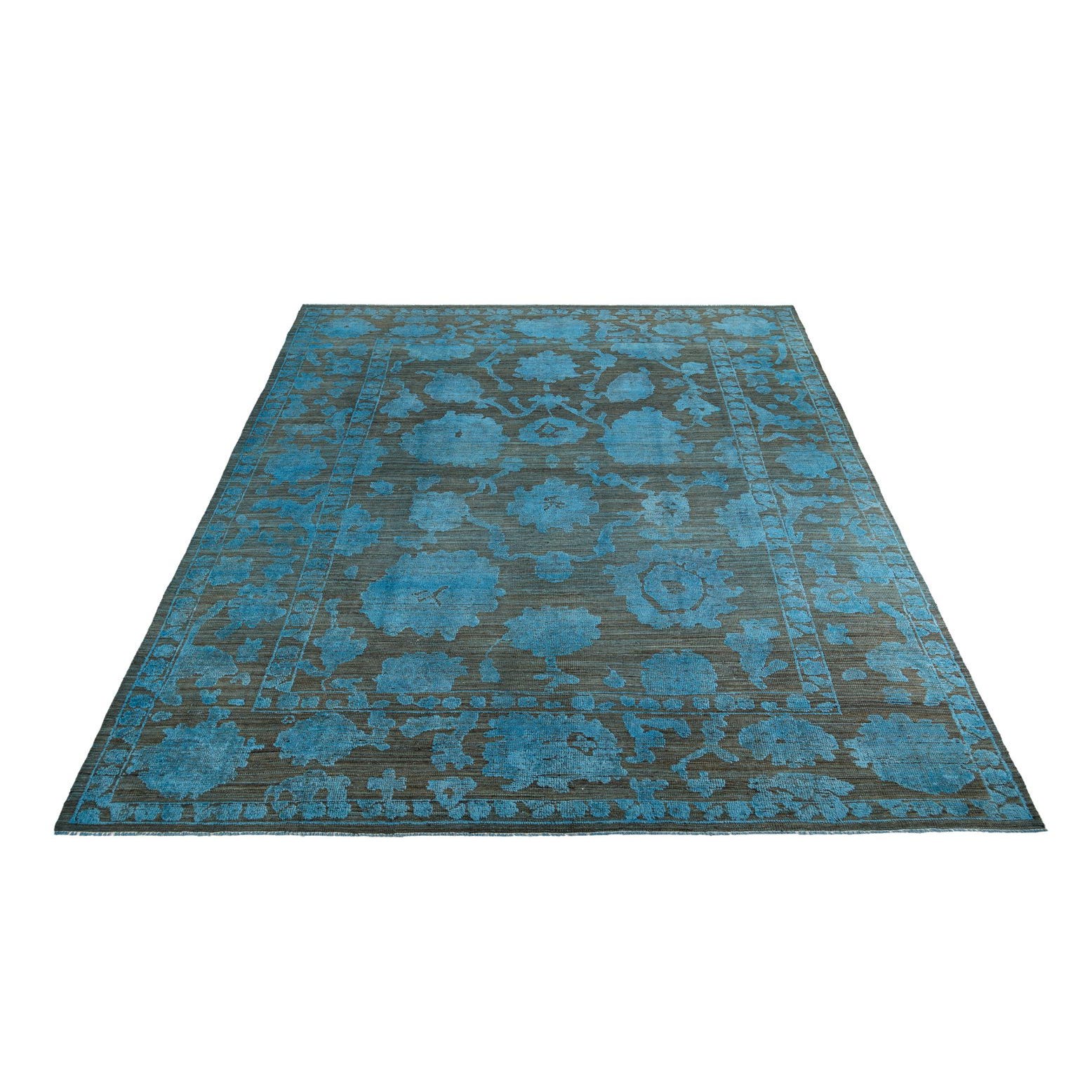 A 10x14 rectangular Oushak rug featuring a modern abstract floral pattern in vibrant blue against a dark black background.