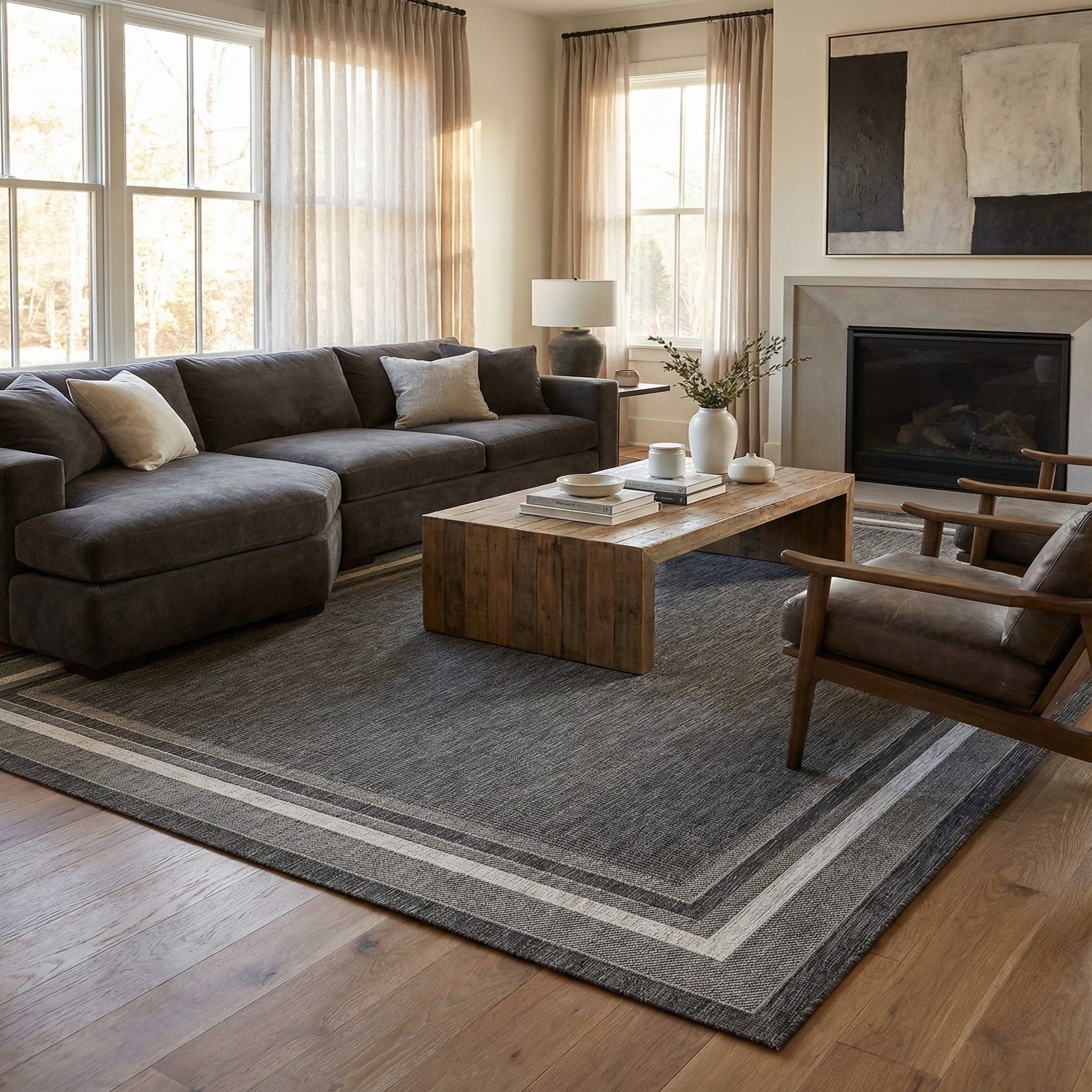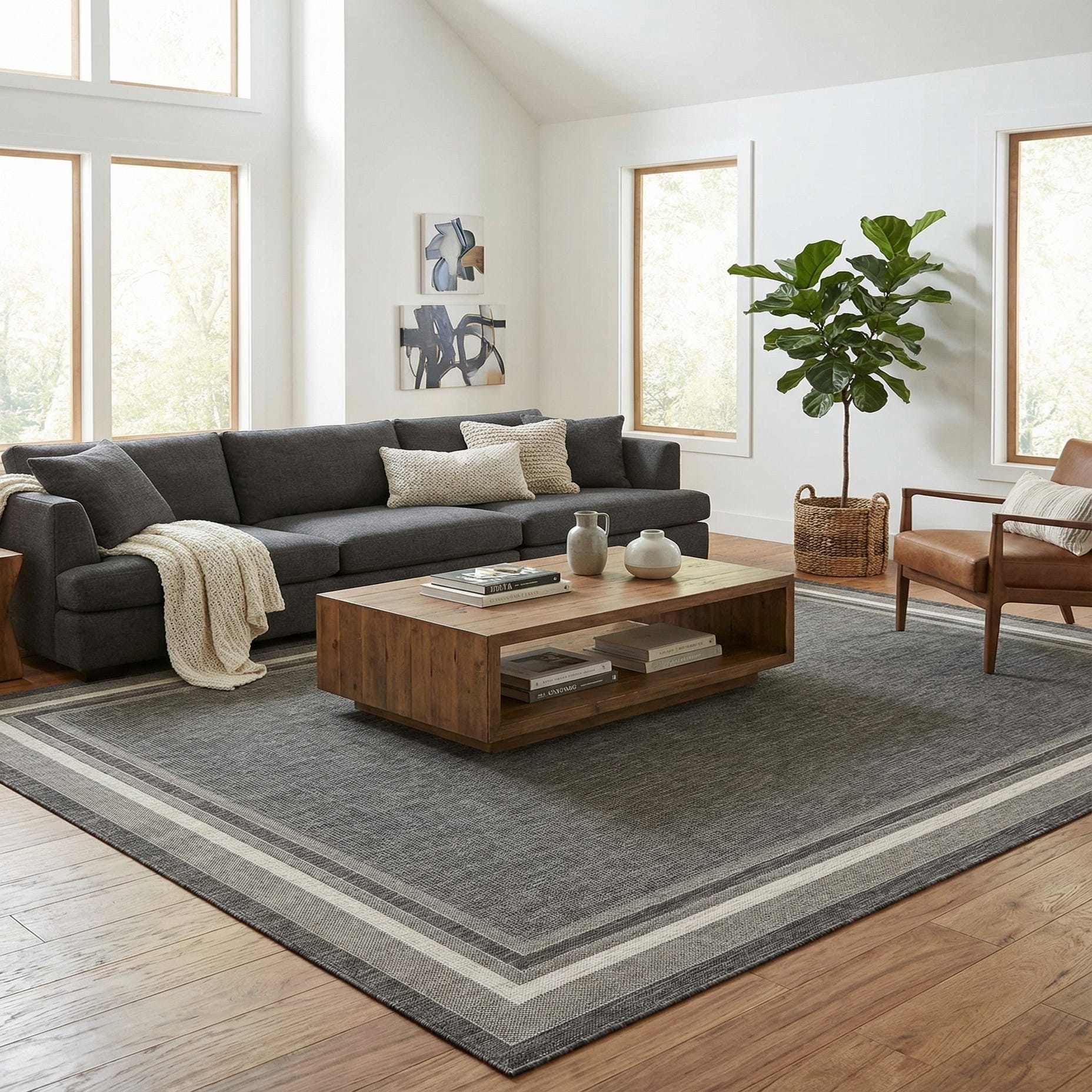 A 10x14 rectangular black modern outdoor rug with a subtle border in varying shades of gray, ideal for a patio.