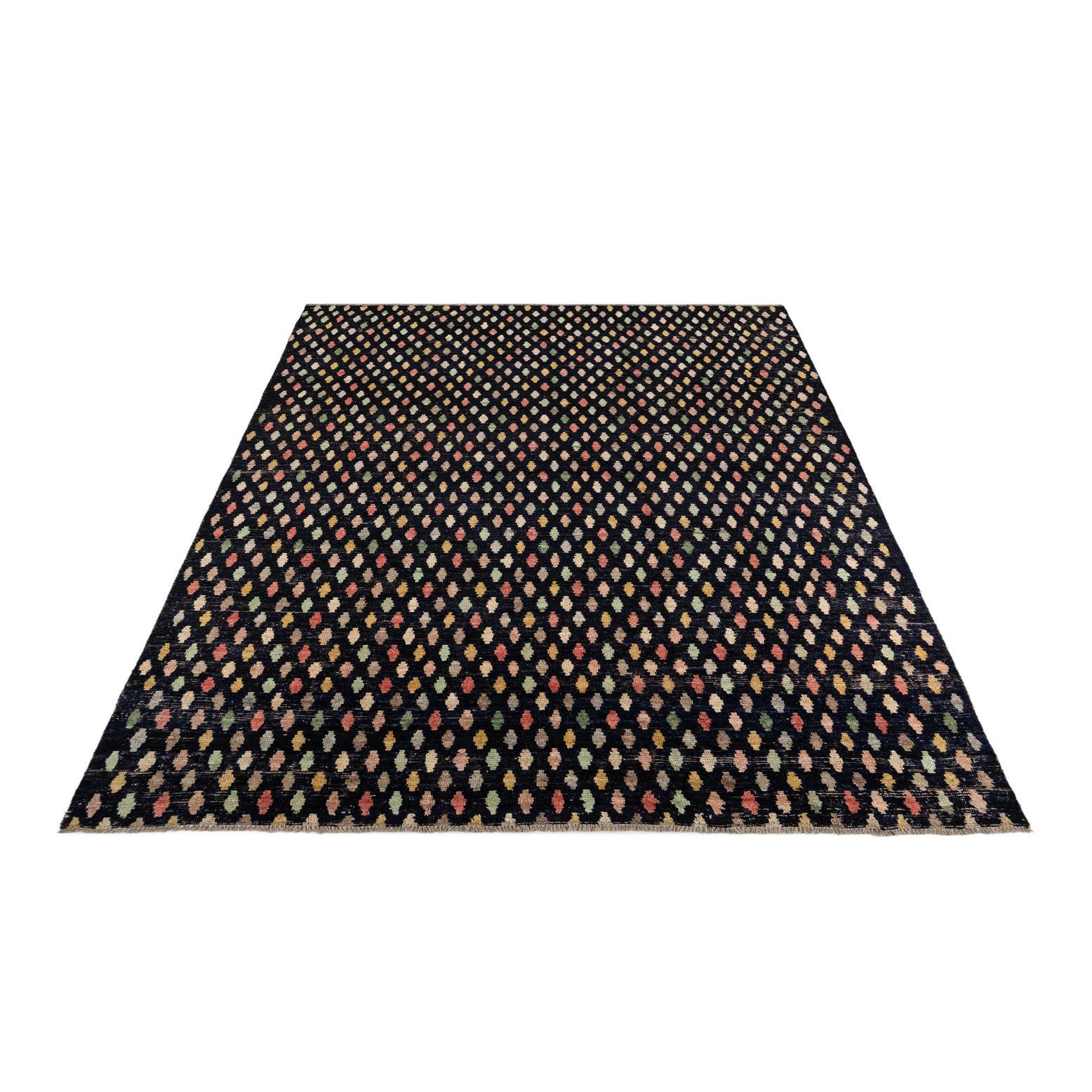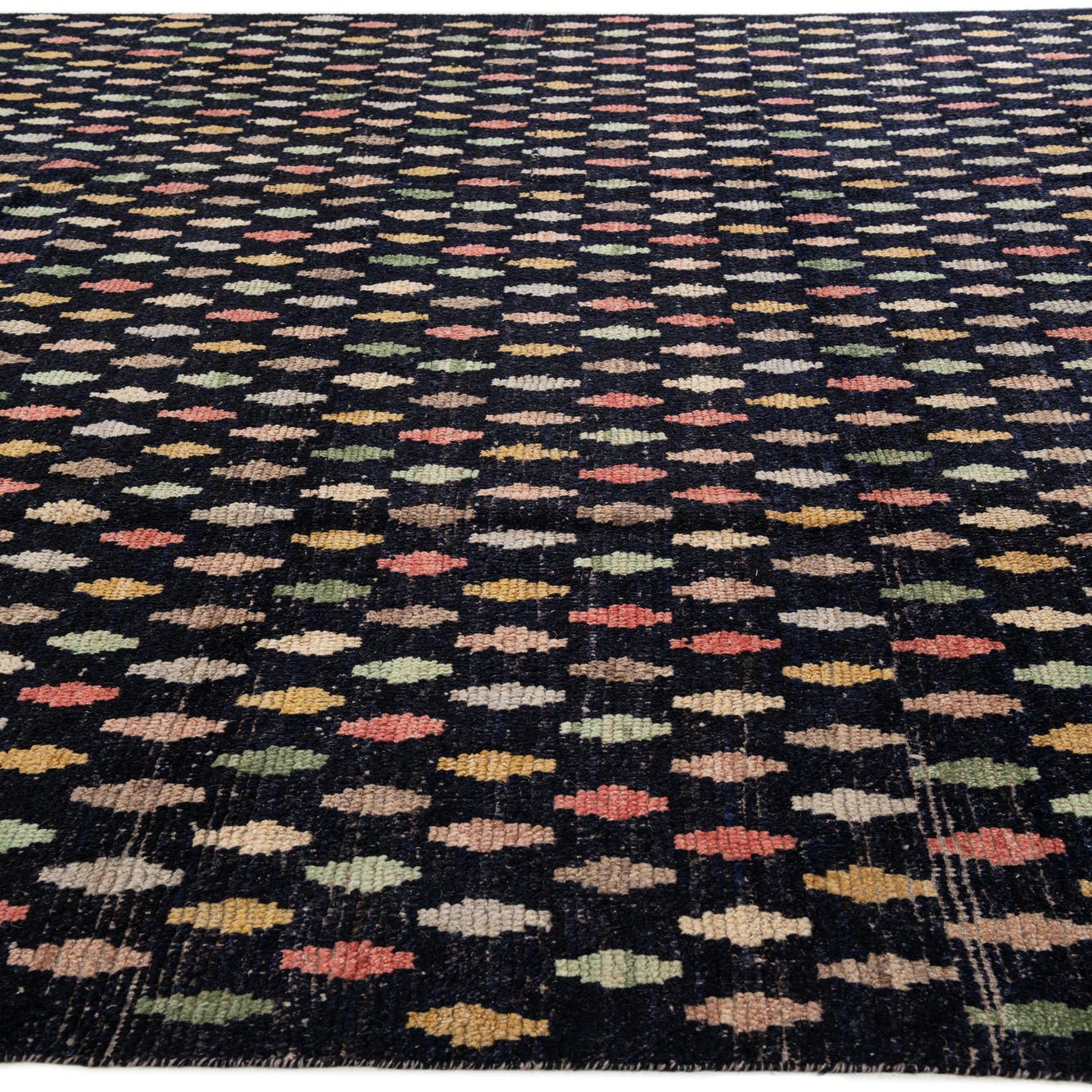 A 10x16 rectangular black wool area rug with a modern abstract pattern of colorful elongated dots.