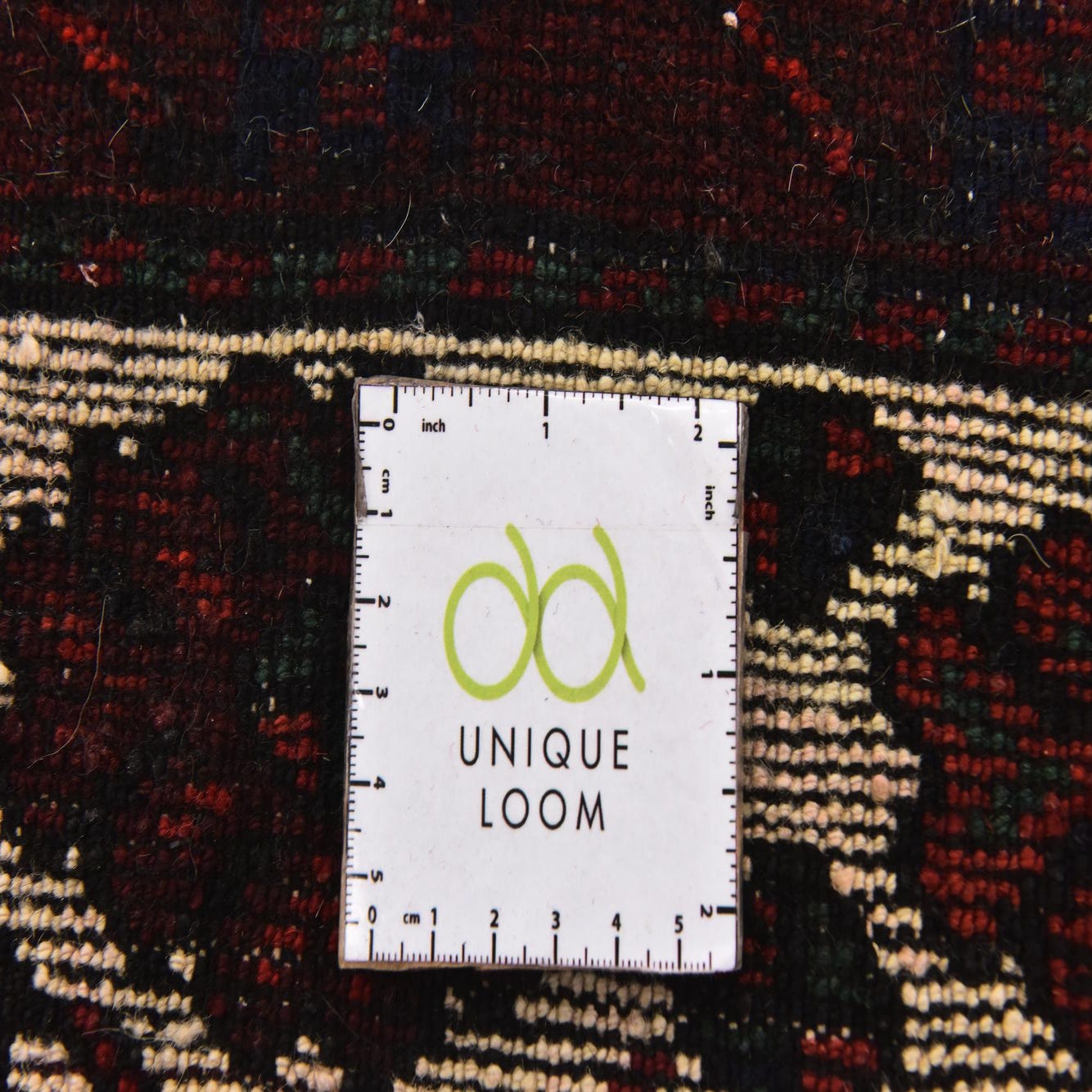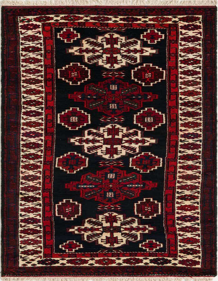 Primary color is Black. Colors in this rug include: Black, Blue, Ivory, Navy Blue, Puce, Red, Gray, Green.