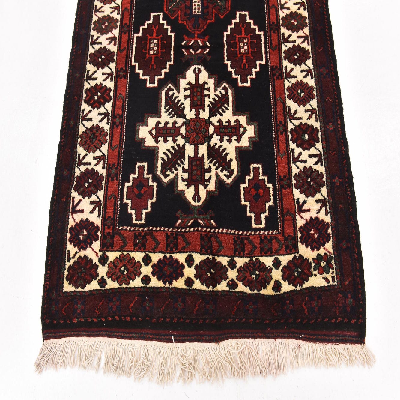The Shahsavand collection presents a striking 11-foot runner hand-knotted from 100% wool. As a semi-antique piece aged between 40 to 60 years, it showcases a deep black background, accented by a vibrant palette including black, blue, ivory, navy blue, puce, red, gray, and green. The woven pattern features a traditional design with intricate geometric forms and floral motifs. The rug's texture offers a tangible sense of history and craftsmanship, while the fringed edges add to its authentic allure.