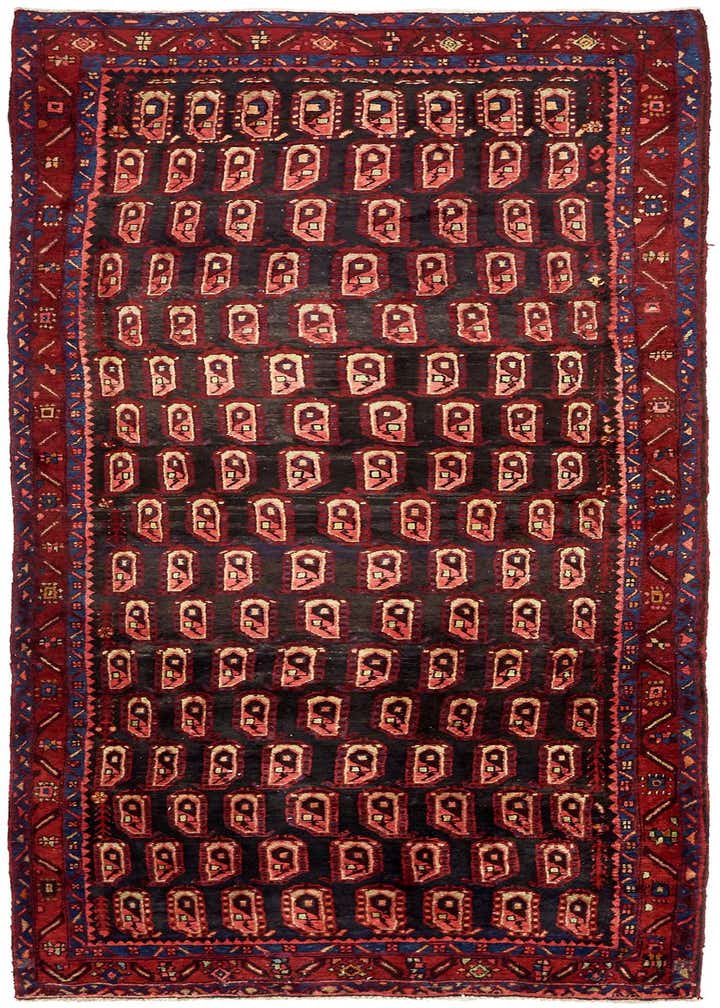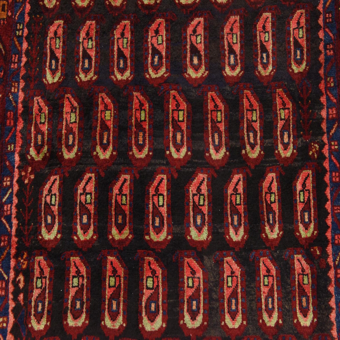 Primary color is Black. Colors in this rug include: Black, Red, Navy Blue, Pink, Beige.