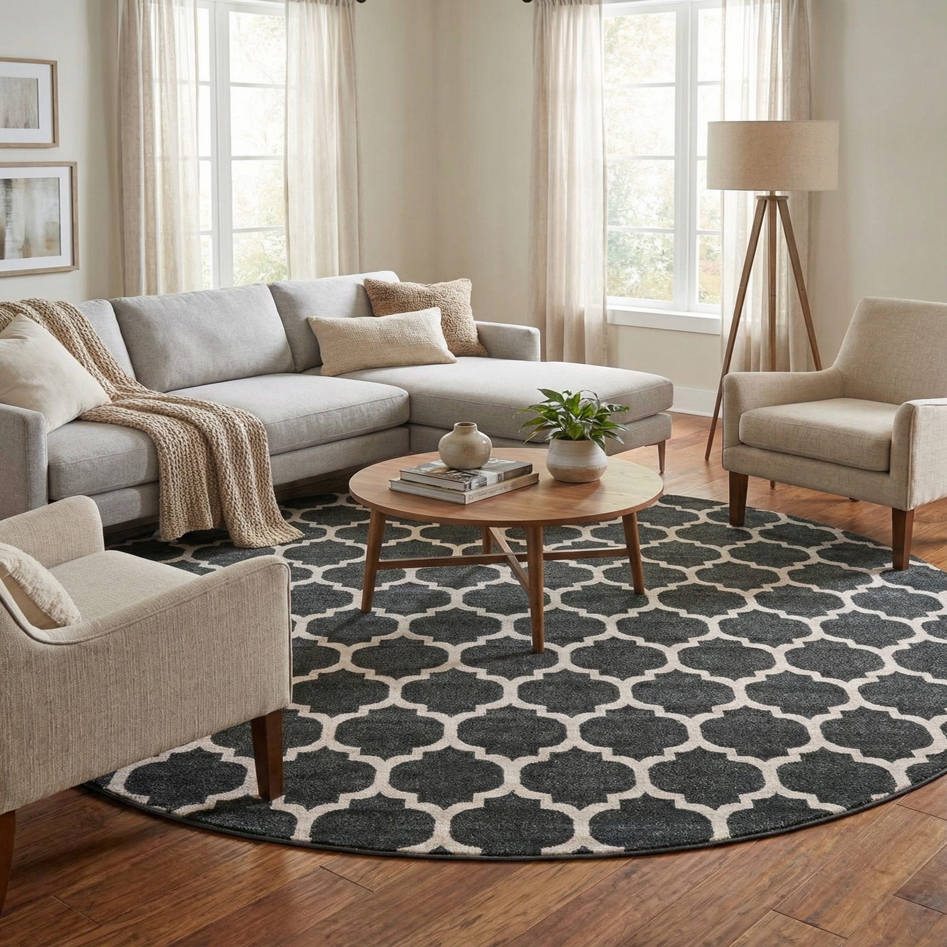 The round form is ideal for anchoring a seating group, centering a round dining table, or defining a home office nook. The high-contrast black-and-beige palette pairs nicely with light wood tones and warm metals for a modern aesthetic, or with neutral upholstery and layered textiles for a transitional space looking for visual structure.
