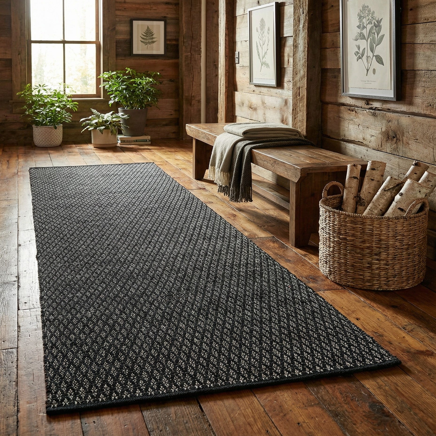 Hand-woven from 80% wool and 20% cotton, this runner presents a tight lattice of small ivory diamonds set against a deep black background. The repeating geometric pattern offers a steady, structured look while the wool surface feels soft and warm underfoot. The handwoven construction gives the rug a low-profile, slightly nubby texture that reads both tactile and refined without excess pile.
