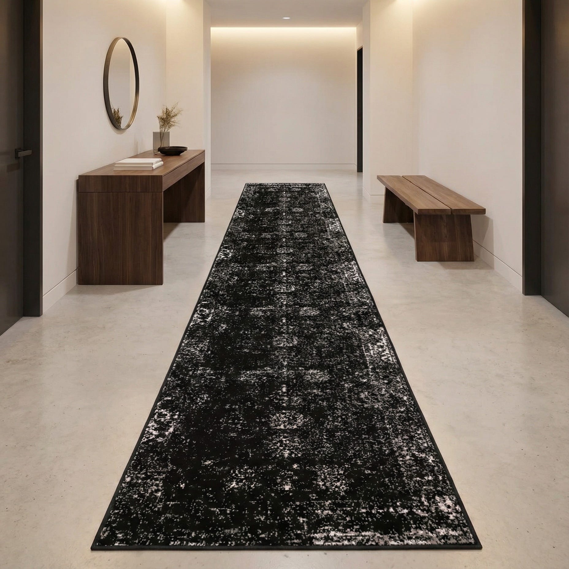 This runner works well in hallways, entryways, between kitchen cabinets, or alongside a bed to introduce contrast and definition. Pair it with warm wood tones and matte black accents for an industrial look, or layer it under simple, light-colored seating in a contemporary living space to ground the arrangement. The neutral palette of black, gray, and ivory also complements minimalist and transitional schemes where texture and tonal contrast are needed without competing patterns.