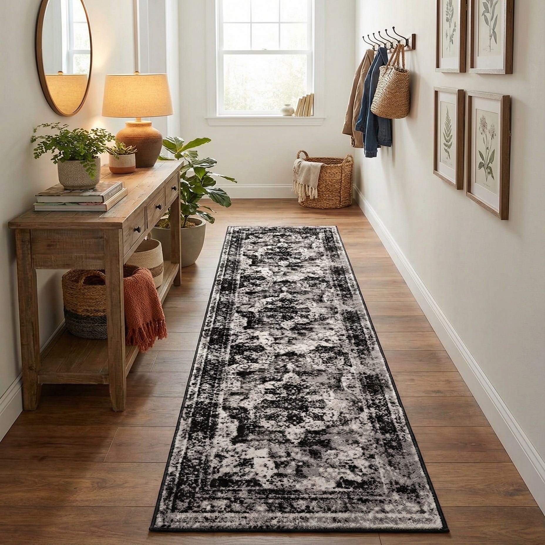 A 12 ft runner rug from the Monte Carlo collection, featuring a distressed black and grey medallion pattern, ideal for a hallway.