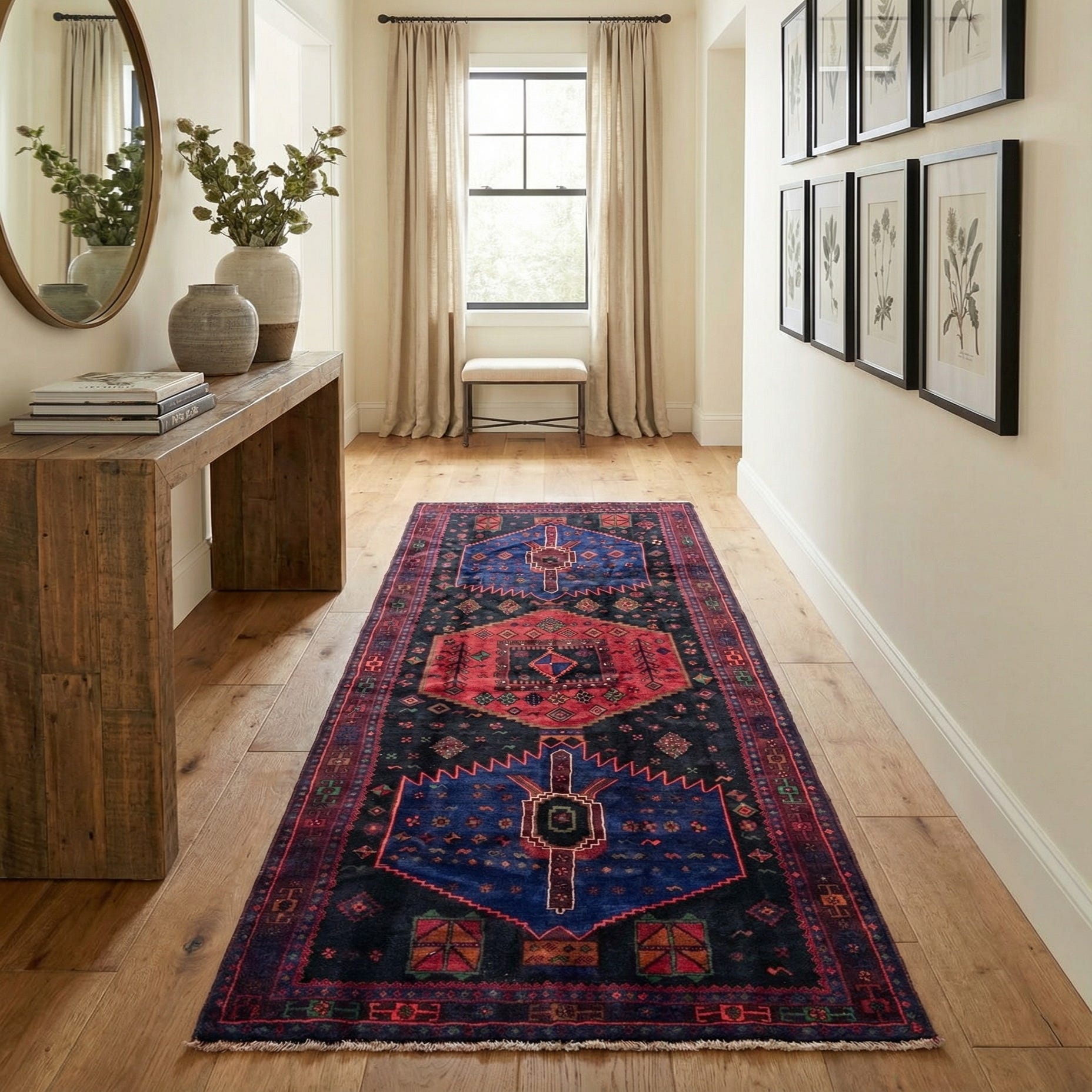 A 12 ft runner rug in black, red, and blue, featuring a traditional Persian medallion and tribal patterns, ideal for a hallway.