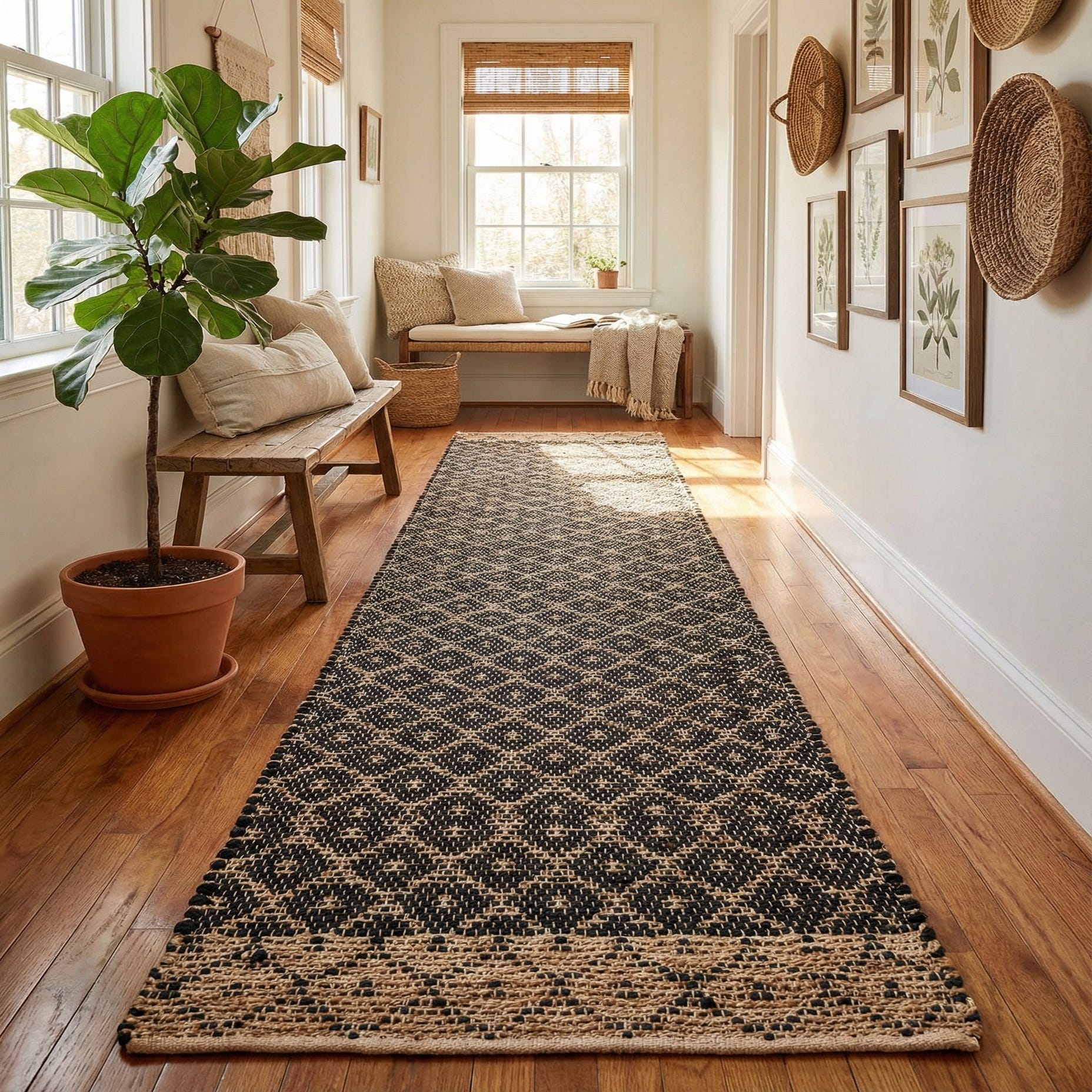 This runner fits well in active circulation areas such as hallways, entryways, or a narrow kitchen aisle, and it layers nicely under a console table or along a stair landing. The black background anchors lighter furnishings and pairs cleanly with wood tones, painted cabinetry, or metal accents, making it a good match for modern farmhouse, coastal, bohemian, or industrial interiors that benefit from natural texture and graphic pattern.