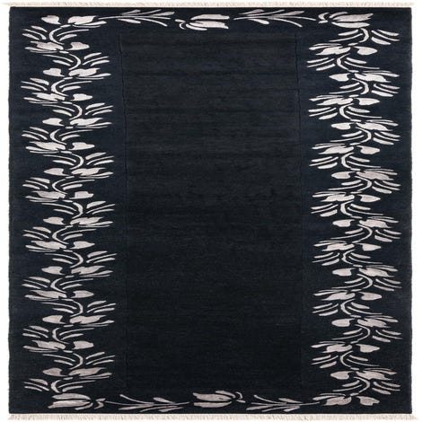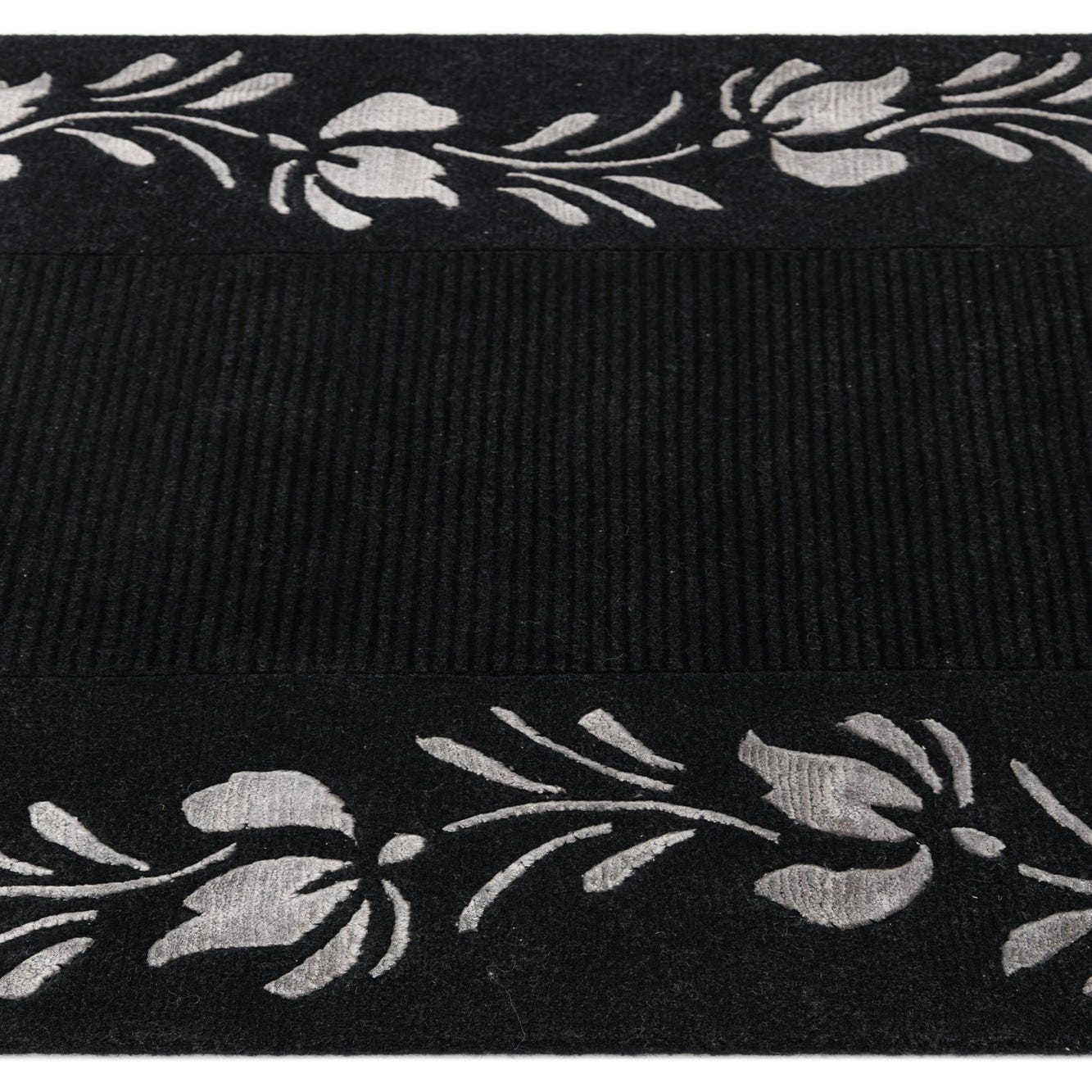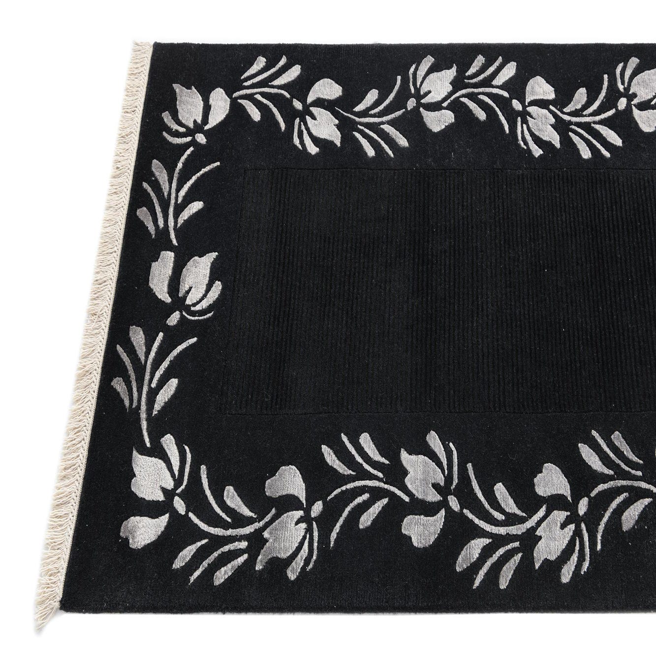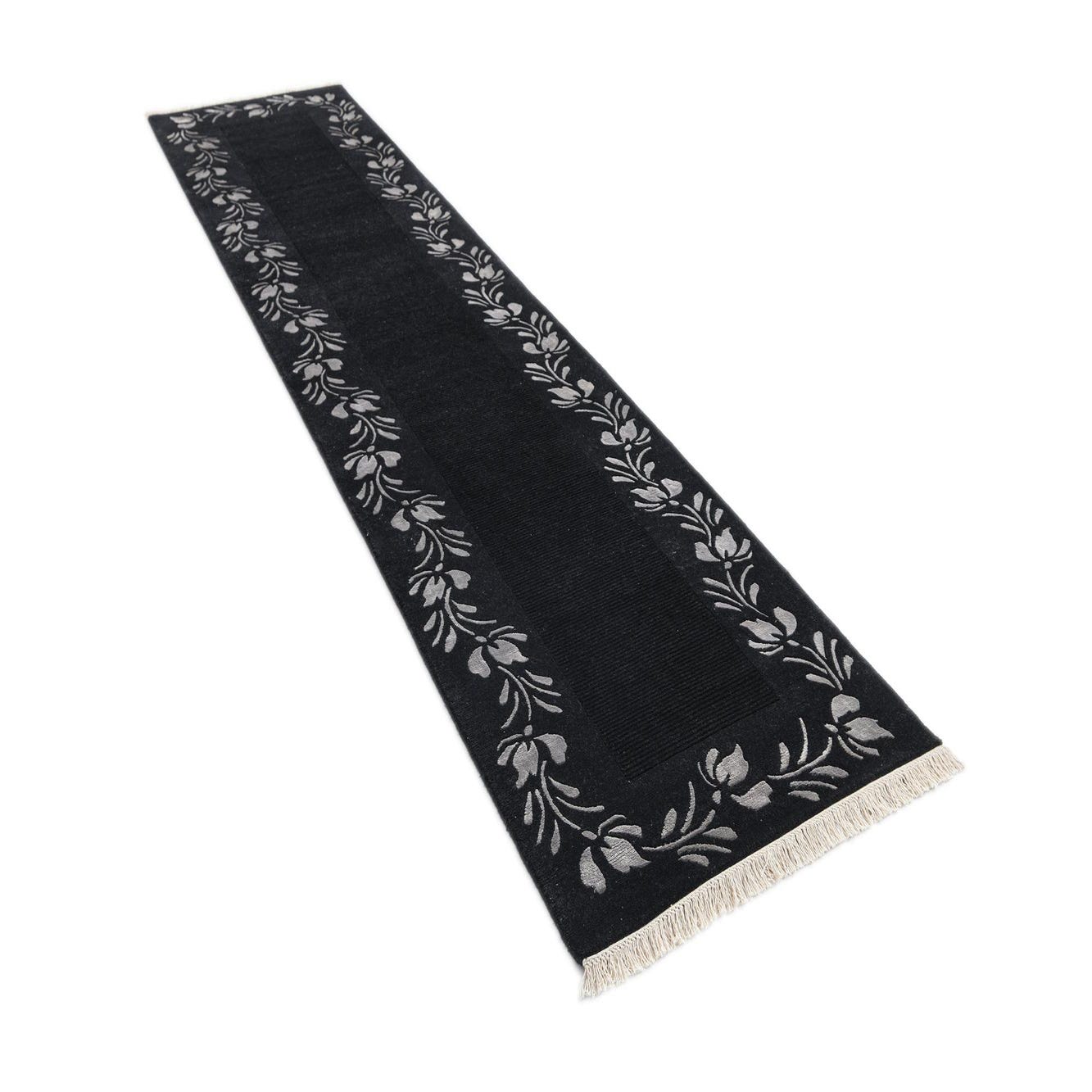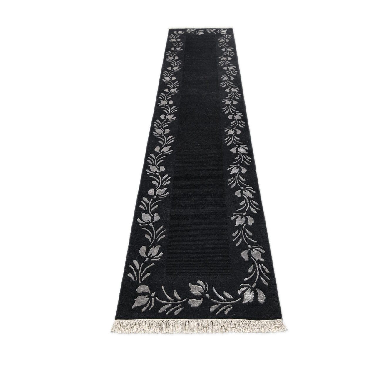 The Darya collection presents a 13 Ft Runner rug, expertly handcrafted from a wool and cotton blend, offering a balance of durability and soft texture. This piece displays a distinctive black background, outlined with a tastefully designed floral border pattern, accented in hues of gray and silver, creating a bold yet versatile aesthetic. The contrast of the silver and gray tones against the black backdrop provides visual interest and depth, while the floral pattern itself lends a timeless elegance to this piece.