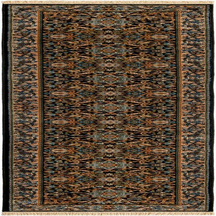 Primary color is Black. Colors in this rug include: Black, Brown, Light Blue, Light Brown, Ivory.
