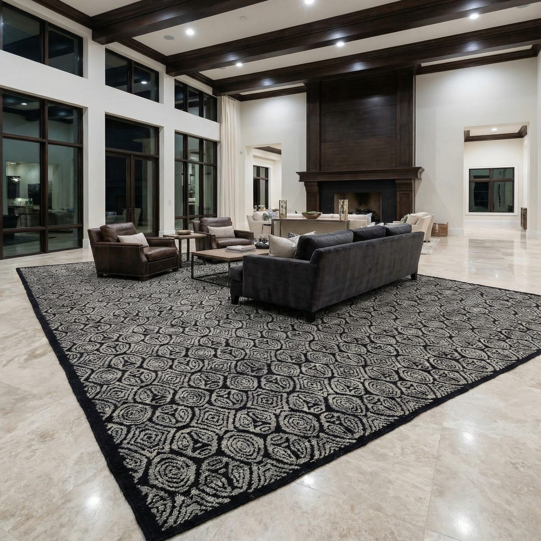 With fringe detailing that adds a touch of classic appeal, this rug can serve as a focal point in a variety of interior settings. Its sizable dimensions and bold pattern make it well-suited for spacious areas such as open-concept living spaces, formal dining rooms, or grand entryways. The neutral color palette ensures versatility, allowing the rug to harmonize with both contemporary and traditional decor. It could be paired effectively with sleek modern furniture to create a striking contrast or integrated into rooms with rich wood elements for a more cohesive look.