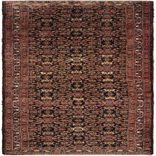 Primary color is Black. Colors in this rug include: Black, Black, Red, Brown, Blue, Olive.