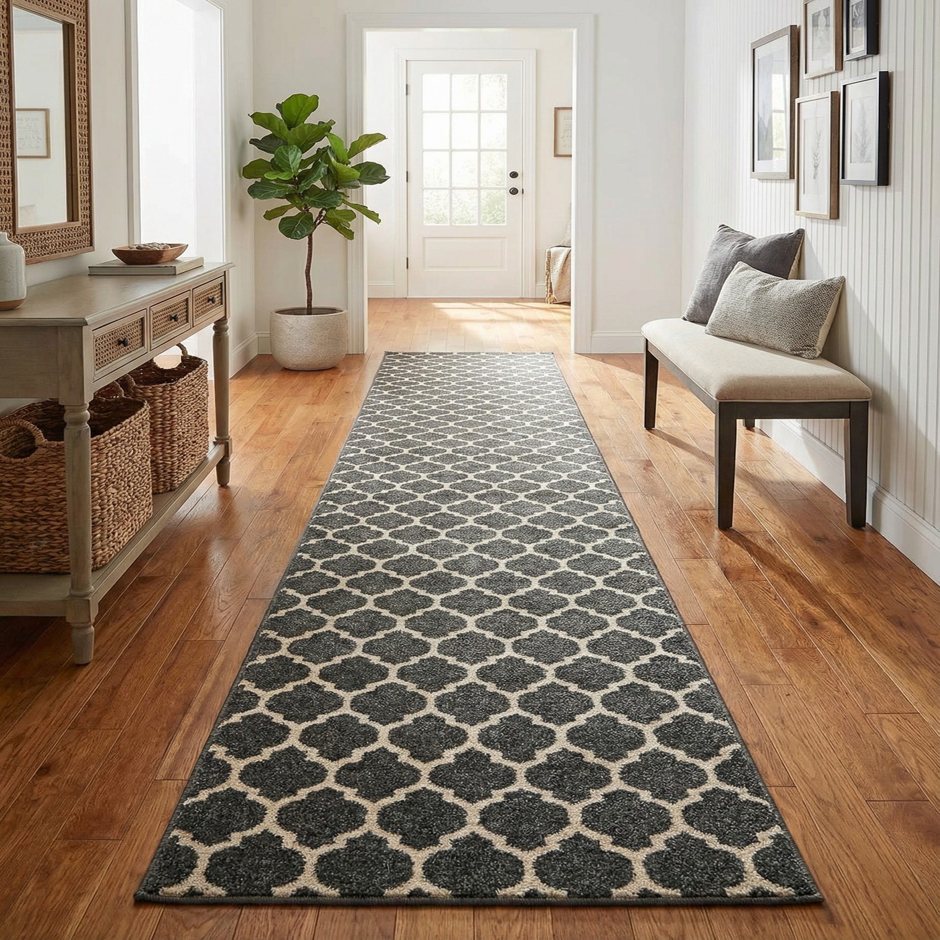 With its strong visual contrast, this rug would integrate well into contemporary settings, adding a graphic punch to minimalist spaces or complementing monochromatic color schemes in modern and industrial-inspired interiors. Its elongated runner shape is ideally suited for hallways, entryways, or alongside a bed in a bedroom, providing a visually cohesive pathway while bringing warmth and a touch of sophistication to the floor. The rug's clean and geometric aesthetic can also serve as a grounding element in eclectic decors, where it can harmonize with a variety of textures and patterns.