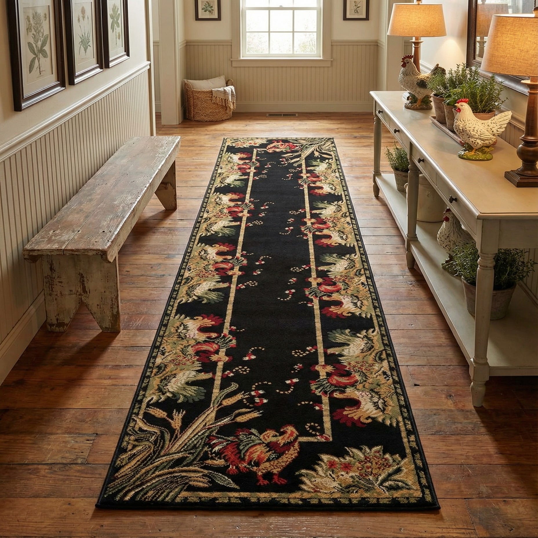 A deep black field sets a dramatic backdrop for a traditional runner layout: a narrow inner panel bordered by scrolling floral and foliate motifs in cream, tan, olive and light brown, with rich accents of red and rust red. Stylized rooster and bird figures are worked into the border at each end, and small bud-and-dot motifs trail down the center, giving the piece a measured, classic rhythm. The pattern reads like a refined country tapestry—structured but lively—with clear outlines and layered color shading that bring the motifs forward against the dark ground.