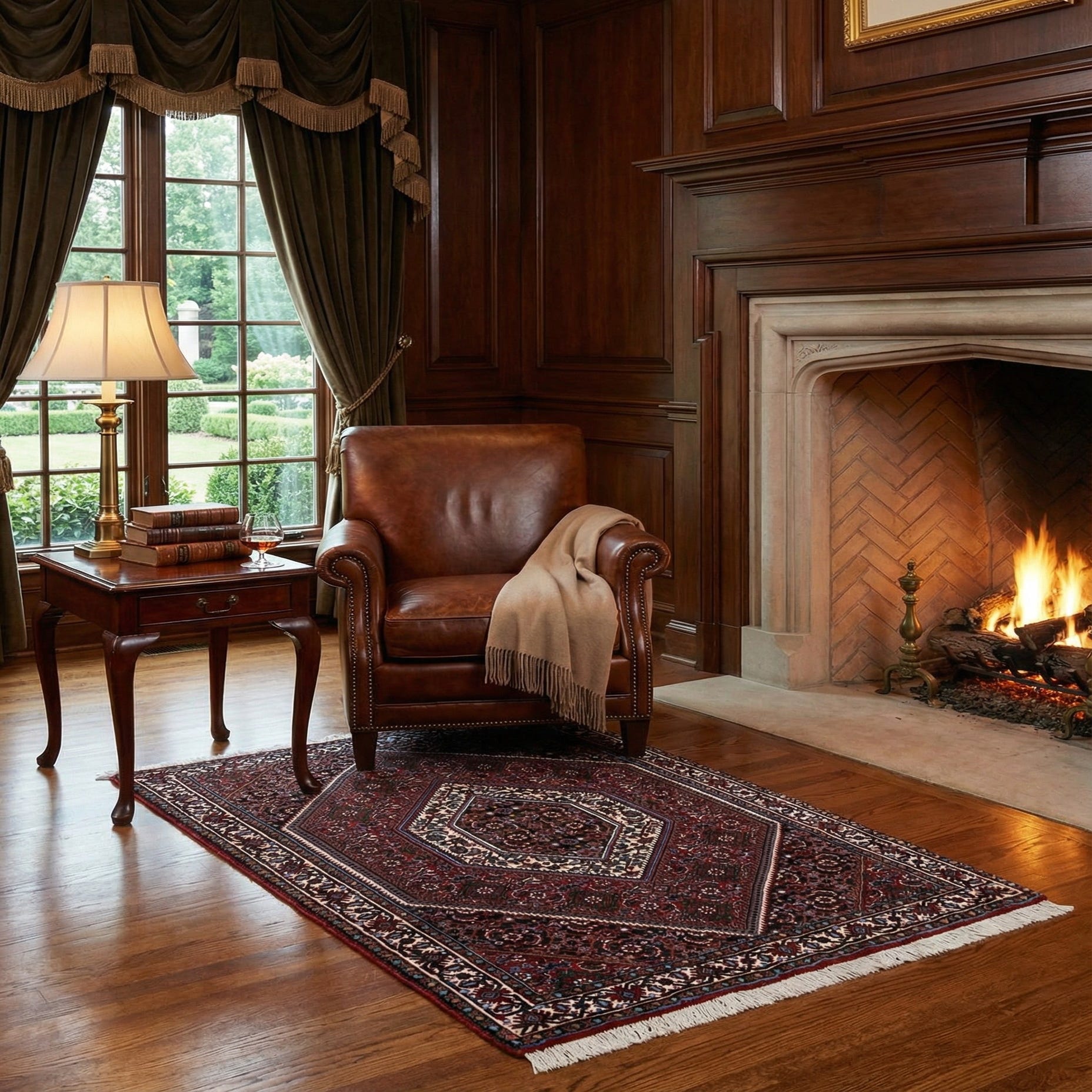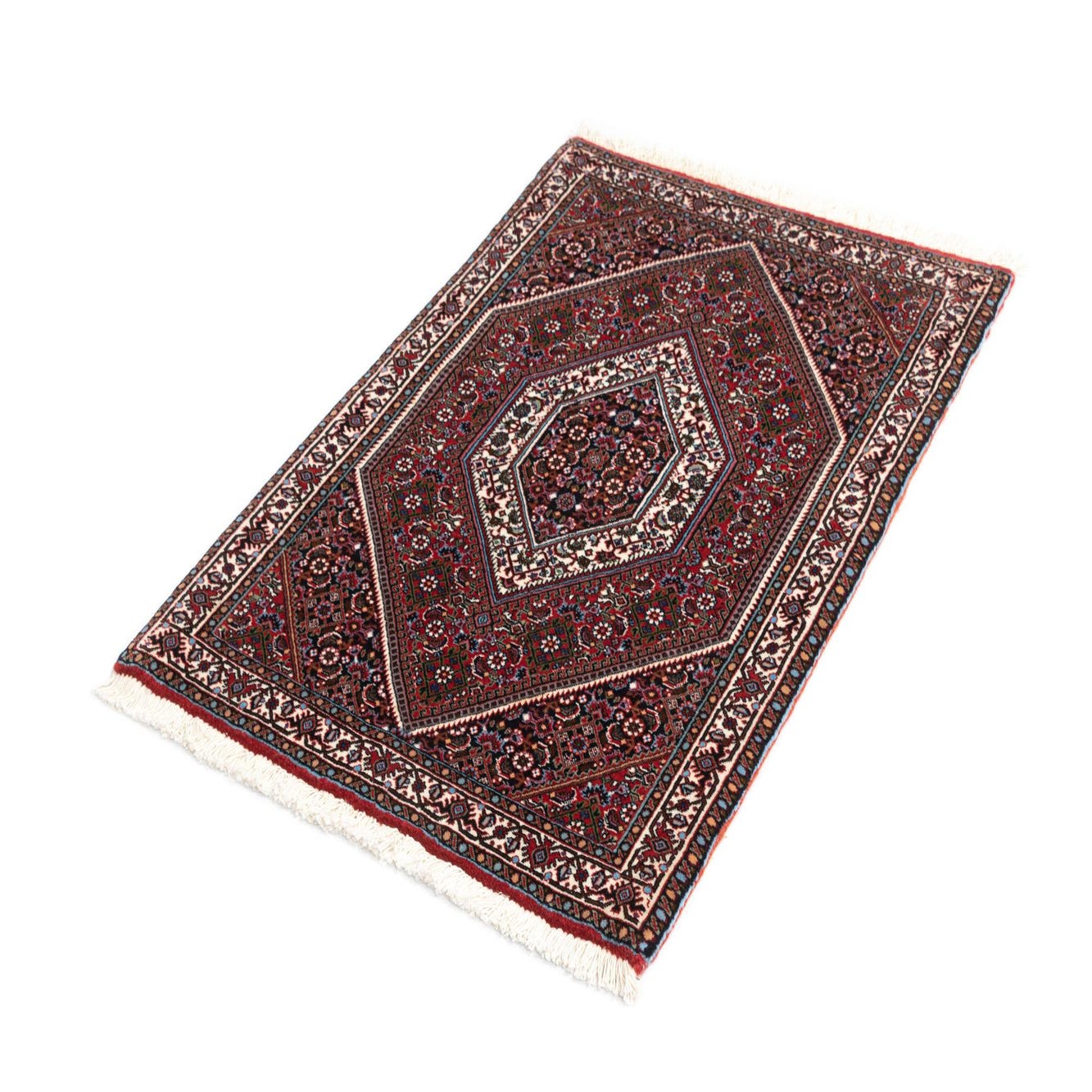 A rectangular 2x3 Bidjar rug featuring a central black and red medallion with intricate floral patterns, framed by a detailed border.