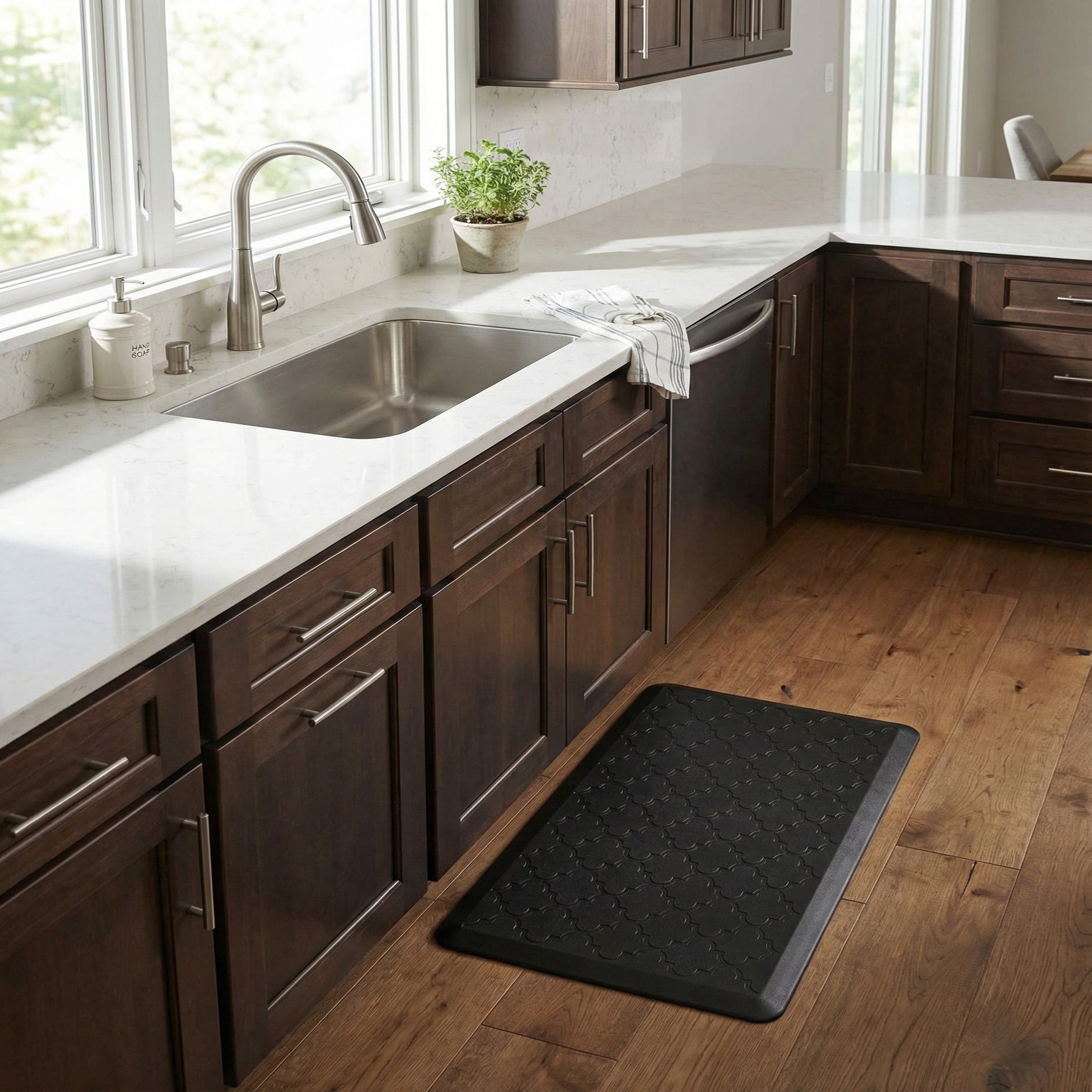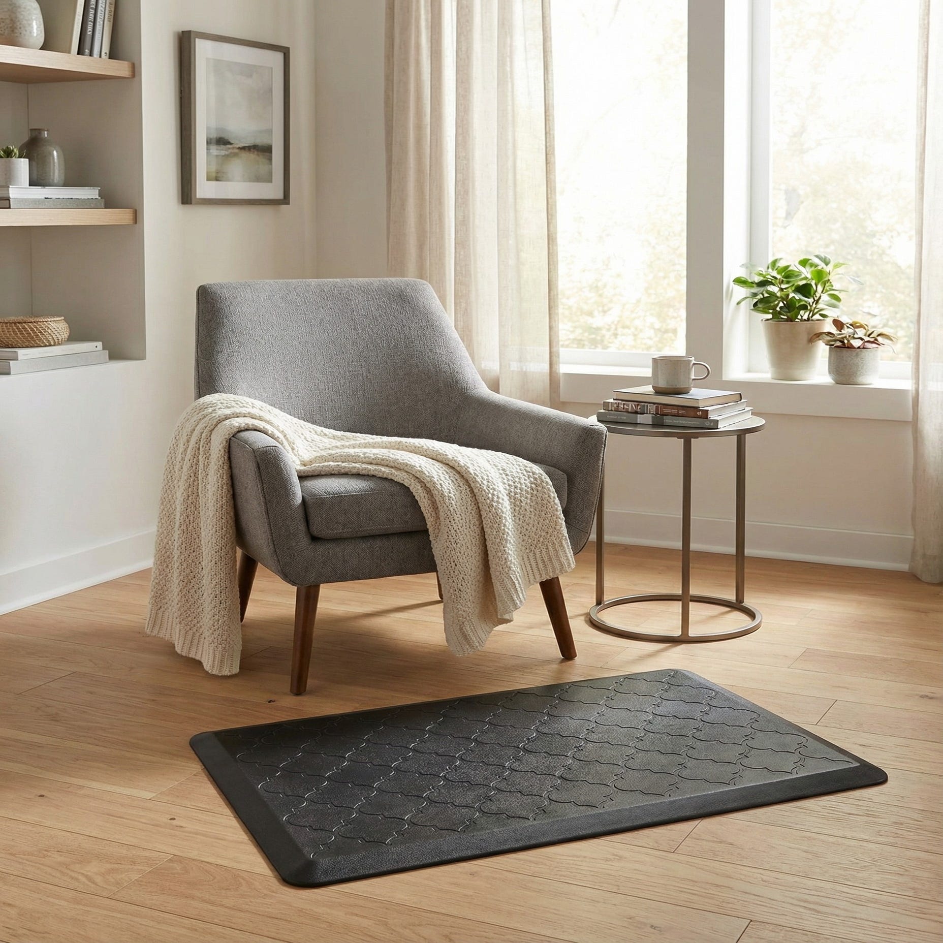A 2x3 rectangular black comfort mat with a subtle embossed quatrefoil pattern and a slightly raised border.