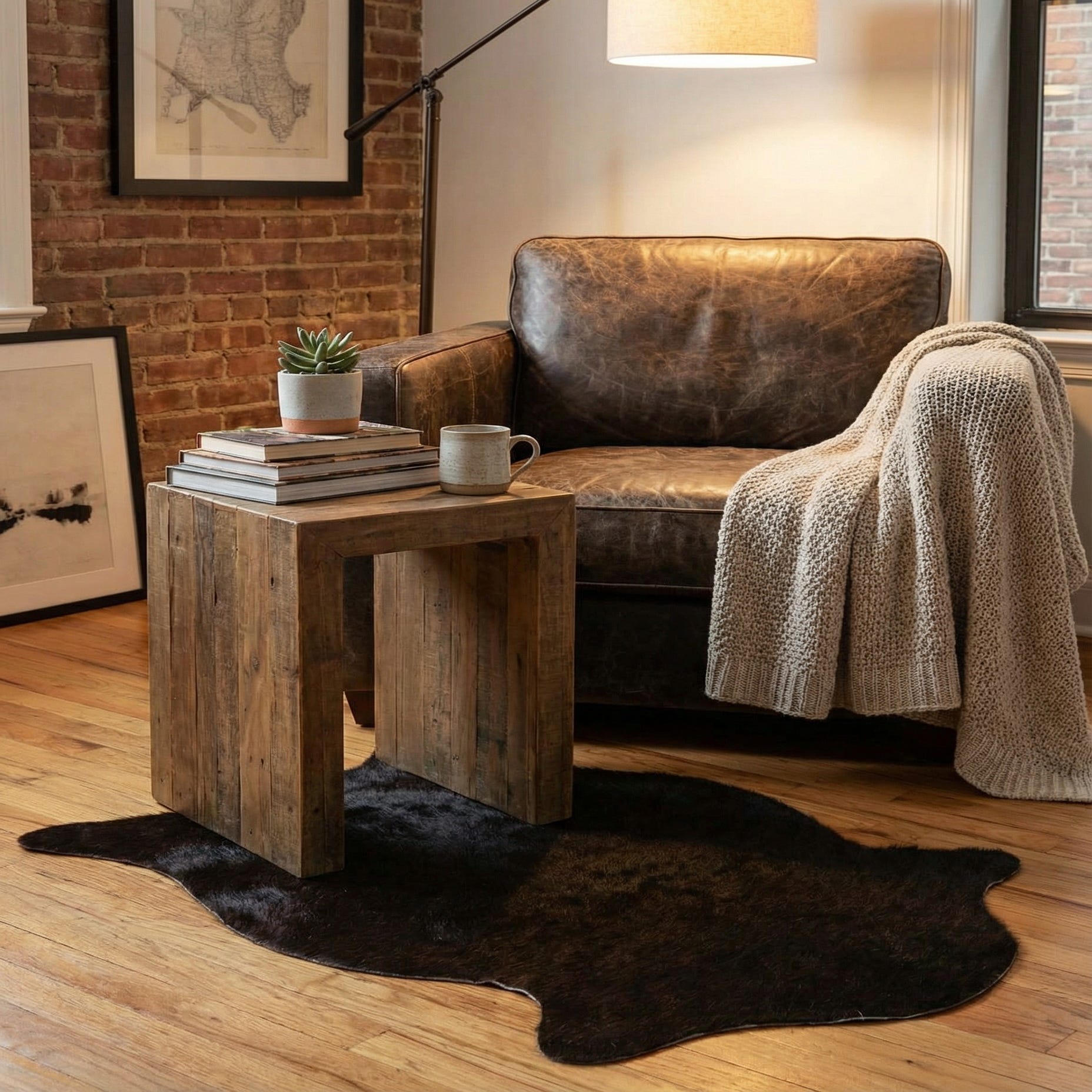 Use this piece as an entryway anchor, beside a bed, or layered over a larger area rug to introduce texture and contrast. It pairs naturally with warm wood tones and leather furniture, and suits modern lofts, rustic or farmhouse settings, and eclectic spaces that benefit from an authentic material element.