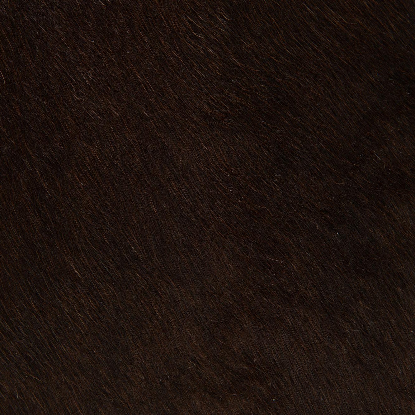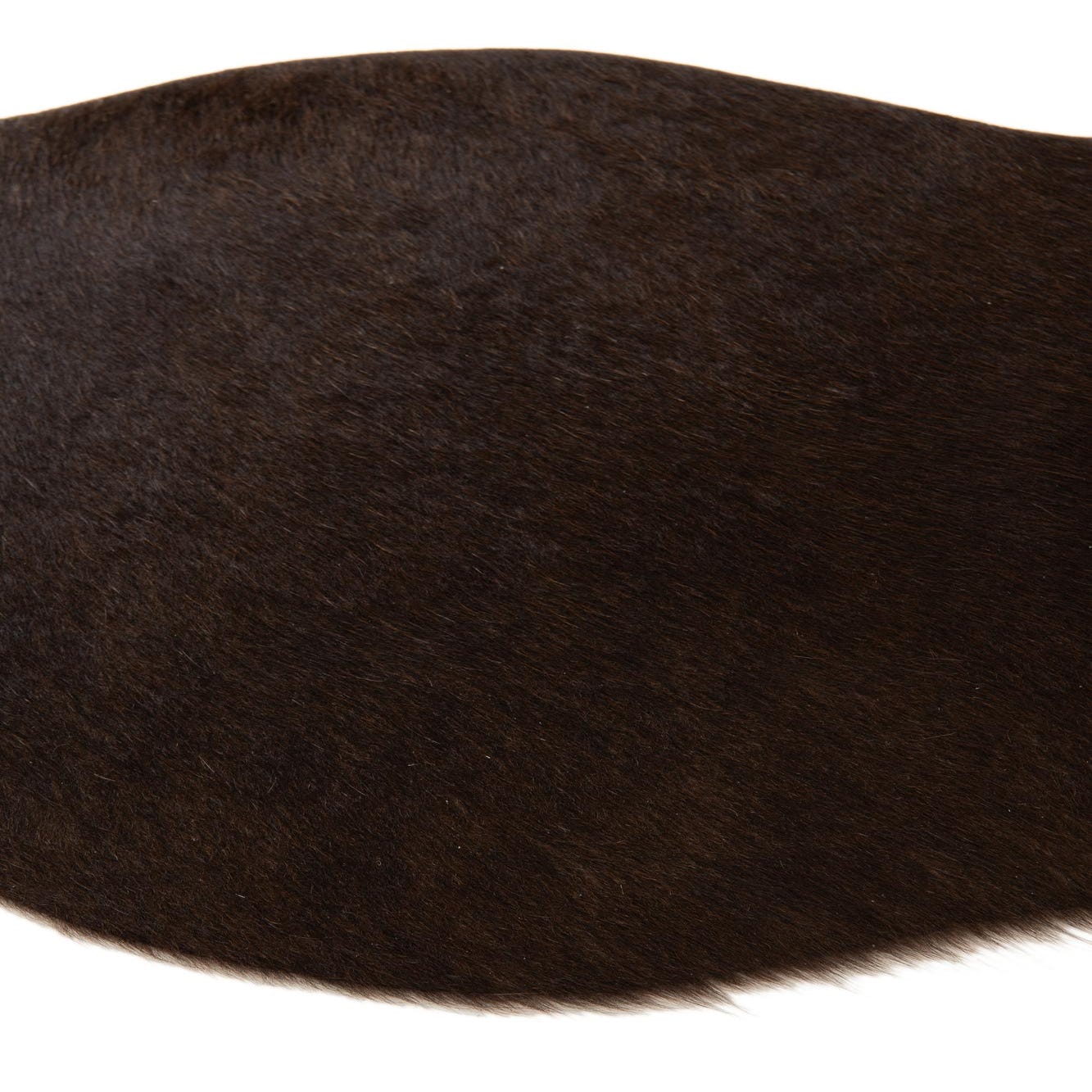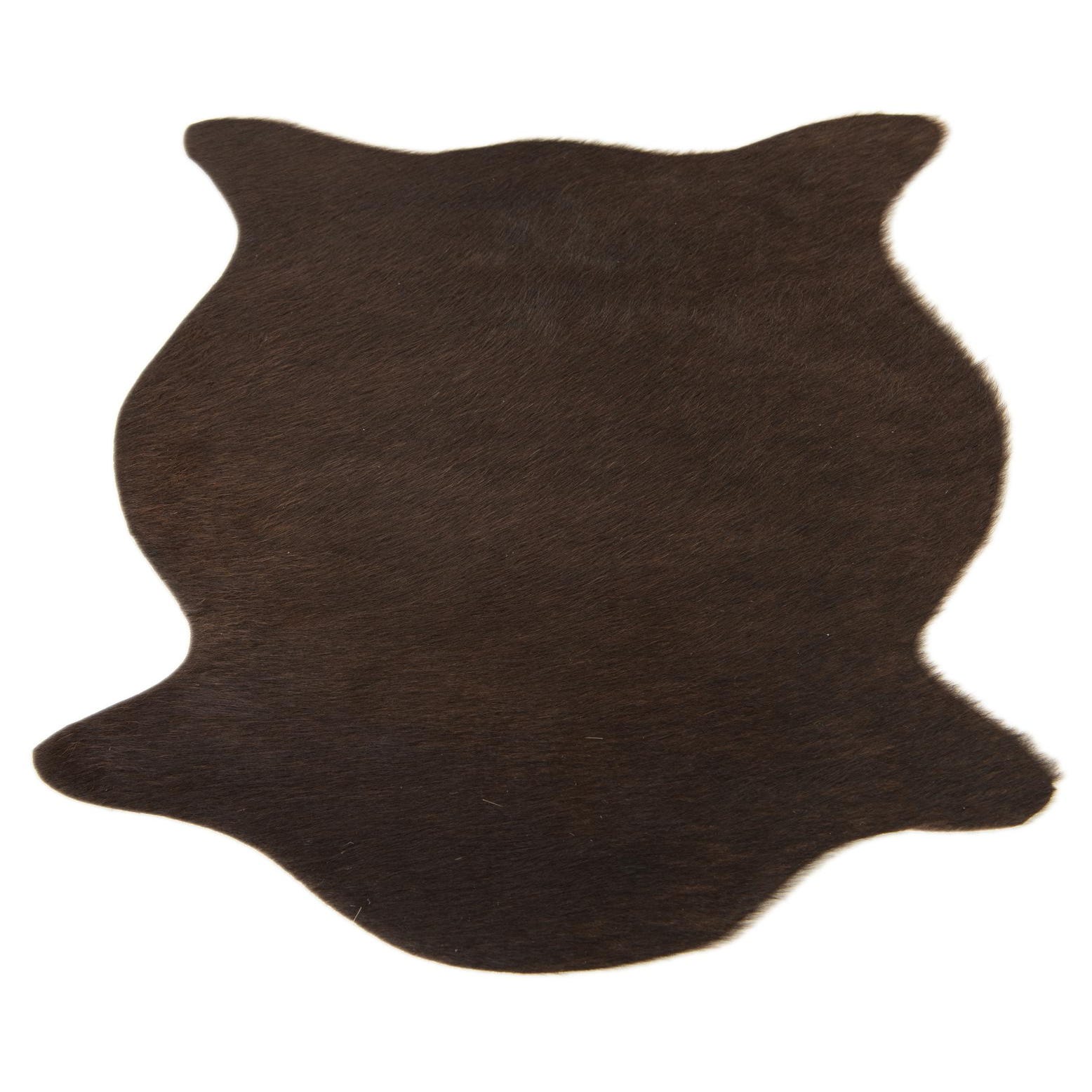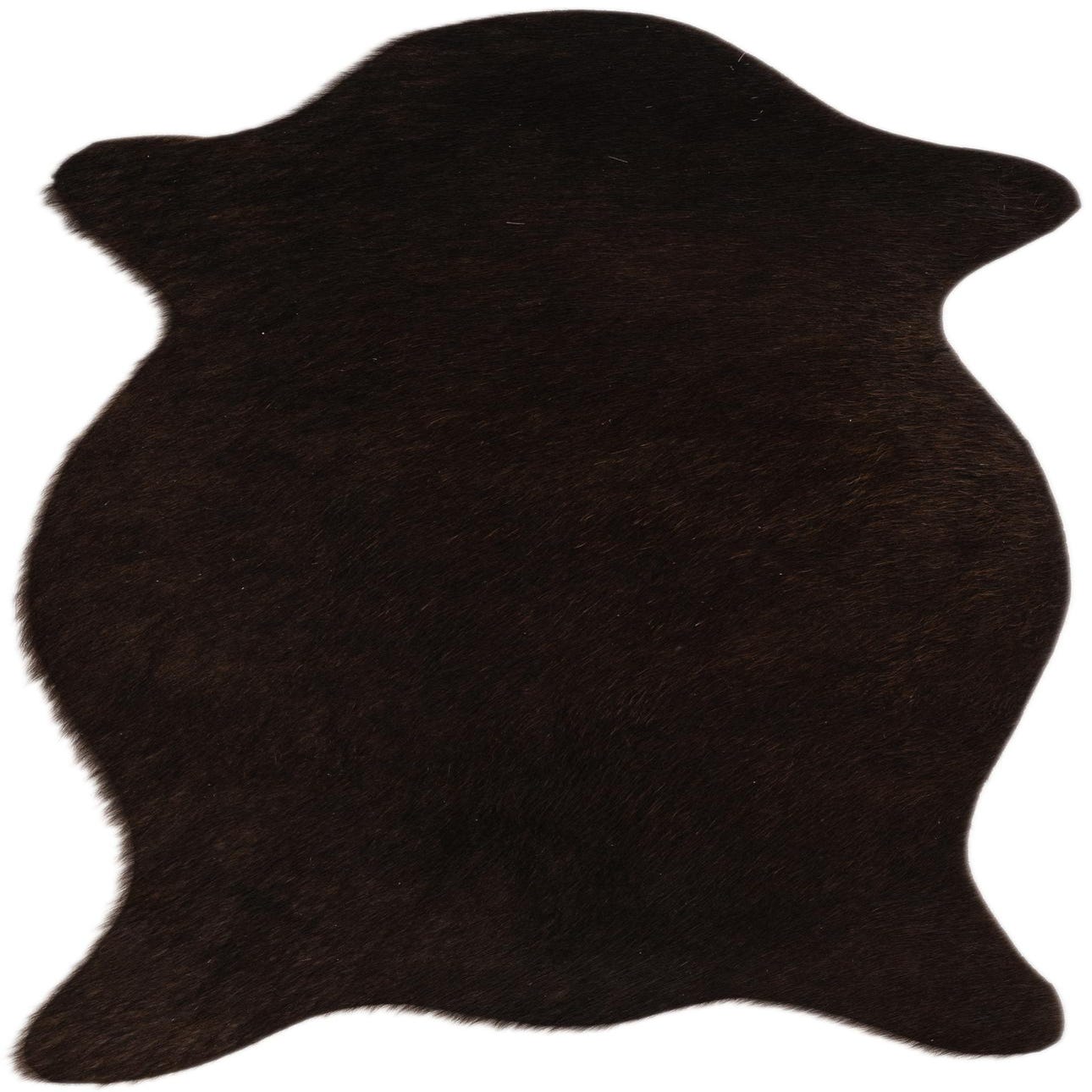 Hand made of cowhide and leather, this hair-on-hide rug has an organic, asymmetrical silhouette and a deep black field punctuated by warm brown highlights. The surface is short and velvety to the touch, with natural tonal variation that creates subtle depth across the hide rather than a repeating pattern. The overall effect is restrained and tactile, offering a straightforward, natural accent that complements a range of interiors.