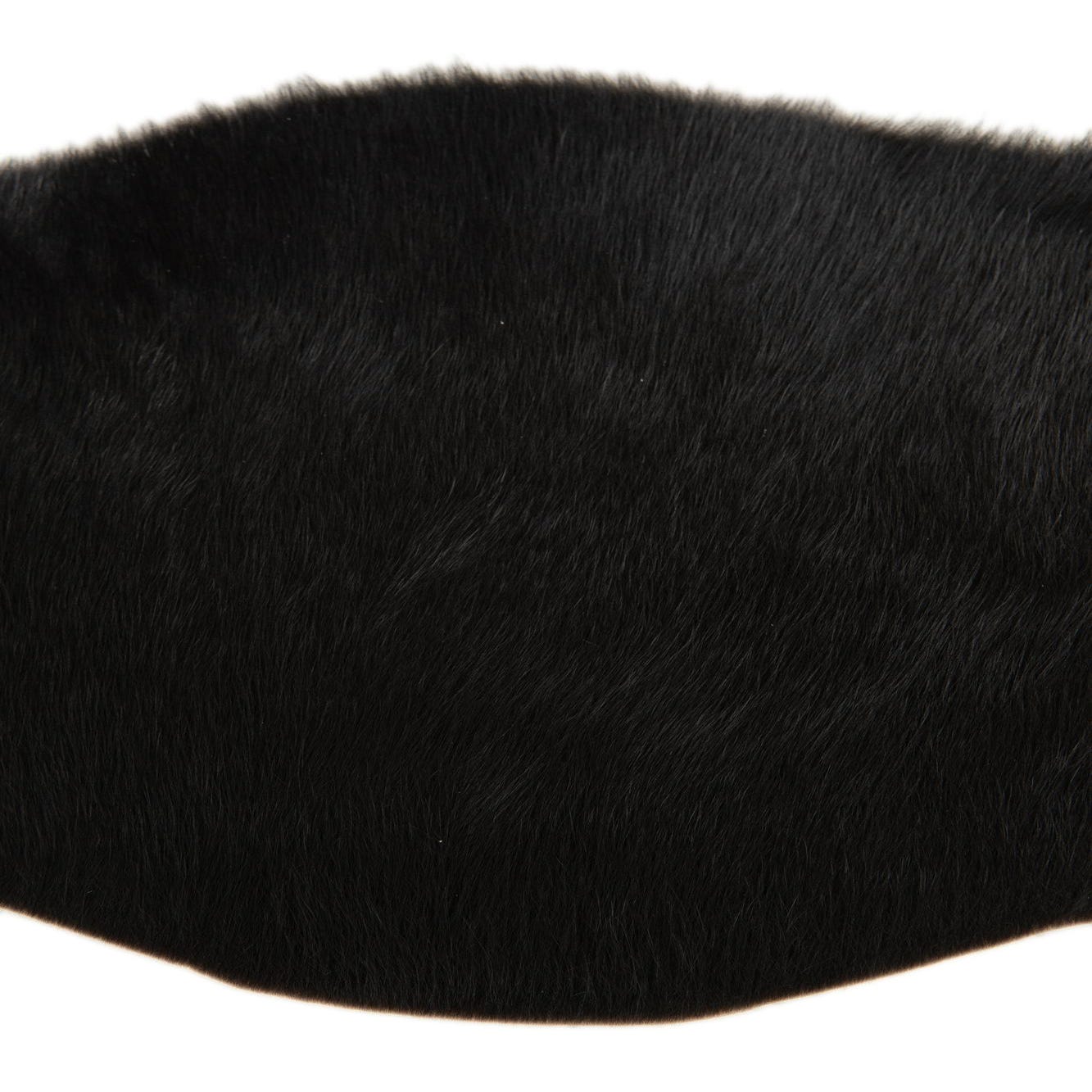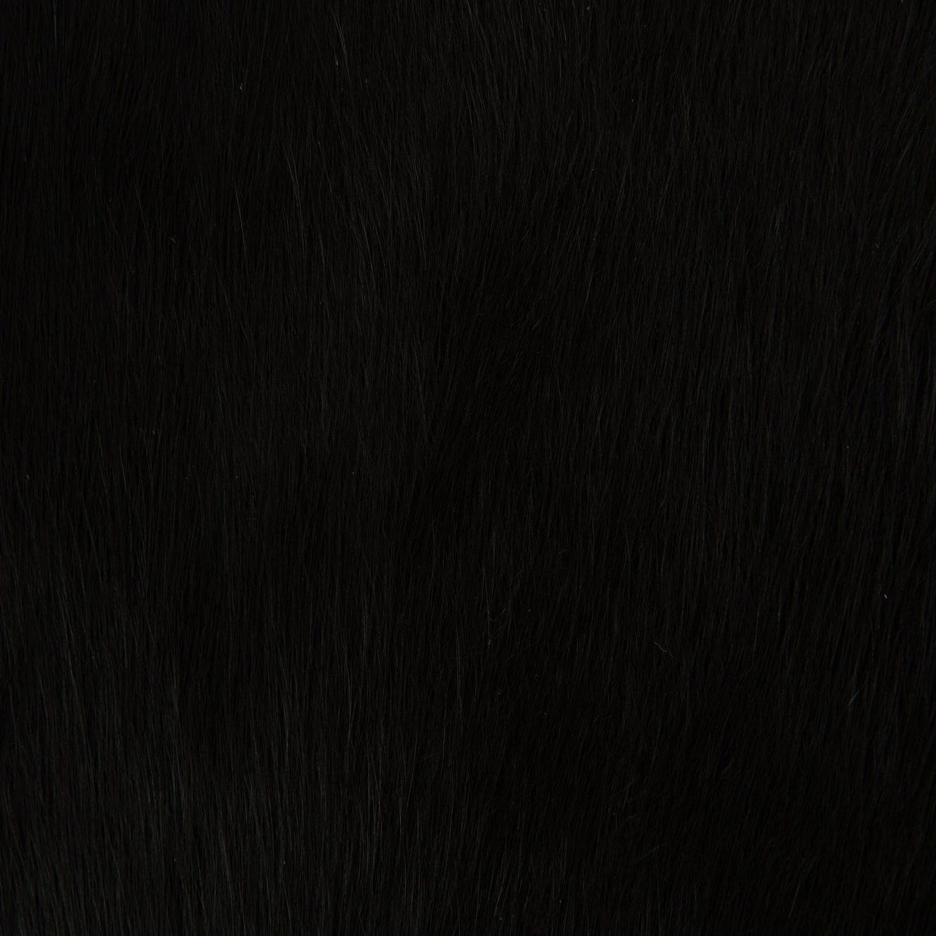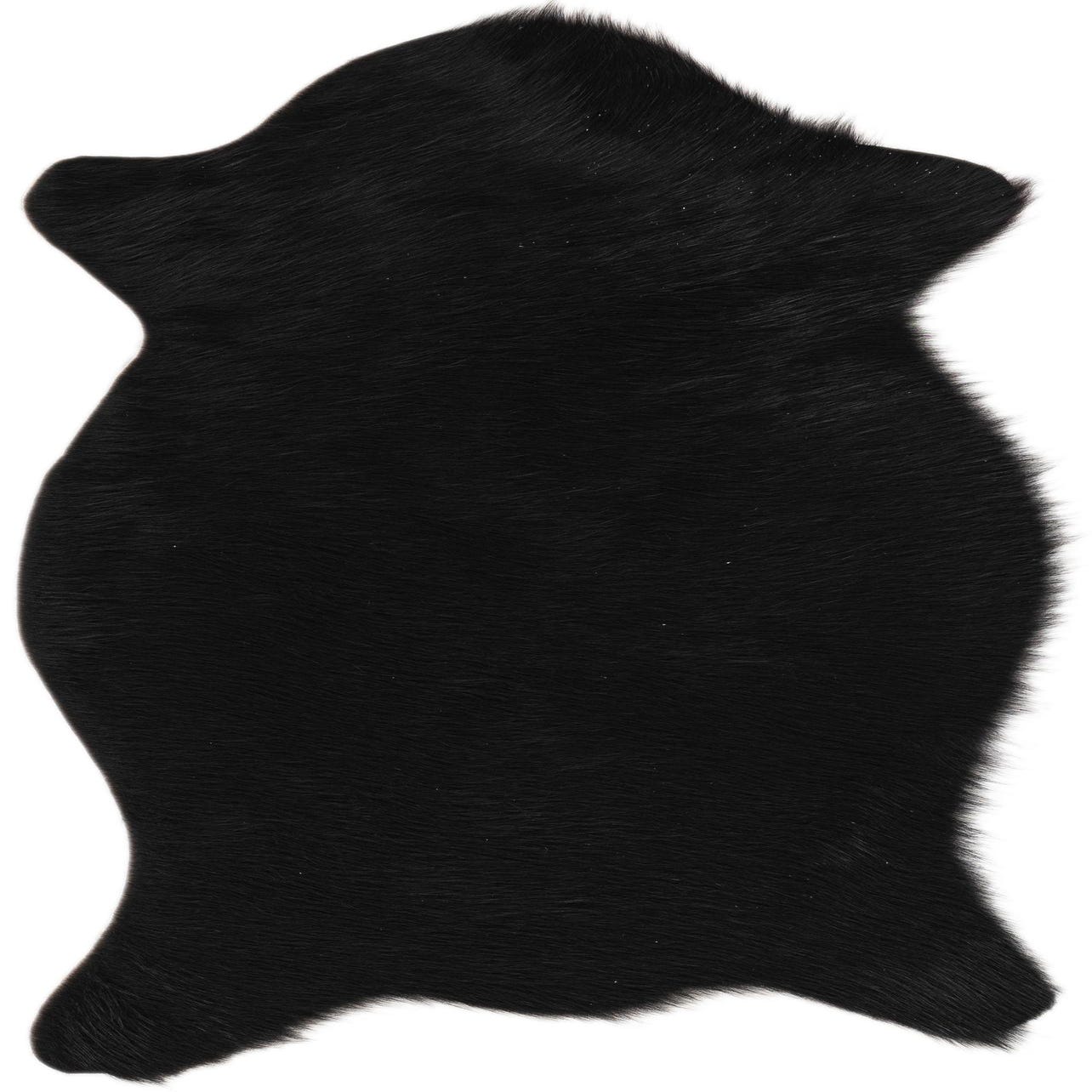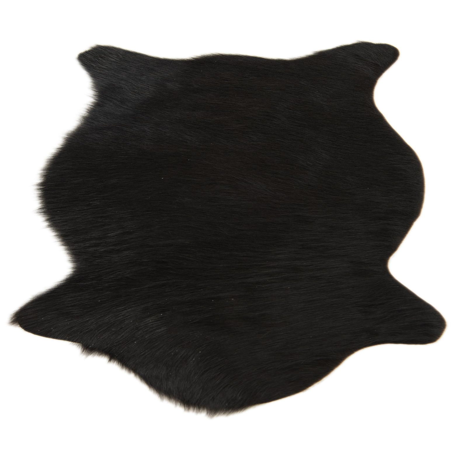 A 2x3 black rectangular cowhide rug with a flat, textured pile, perfect for a modern entryway.