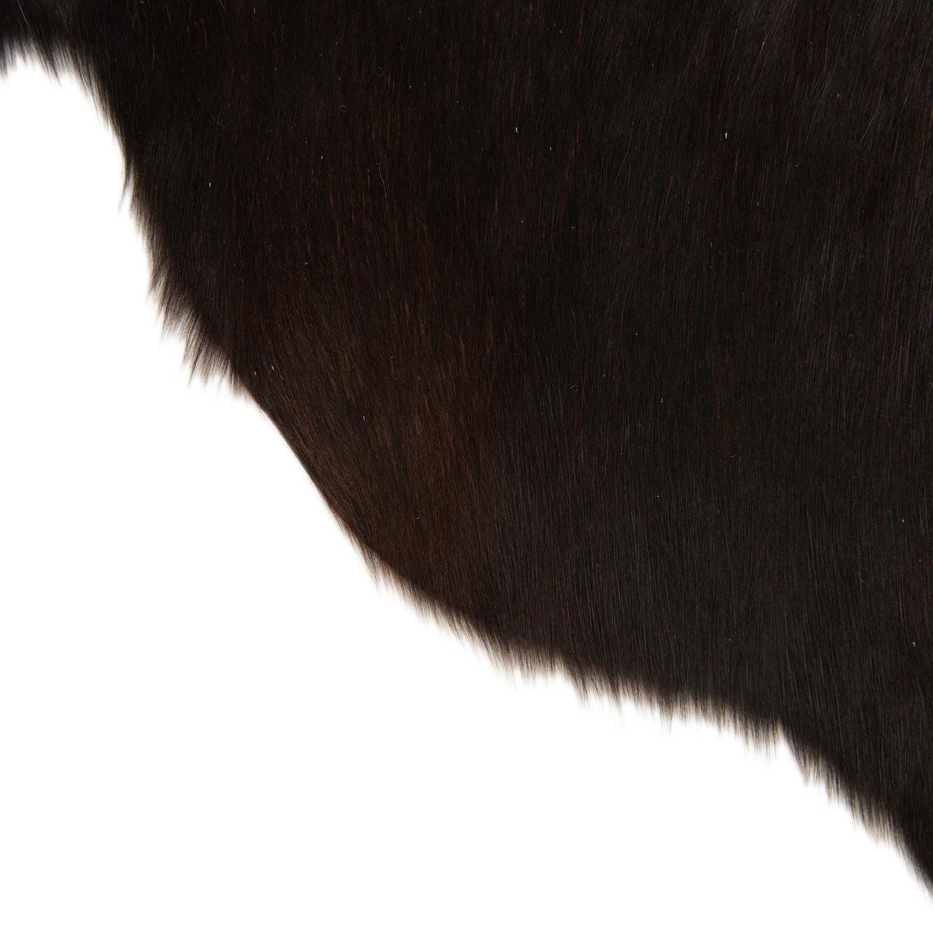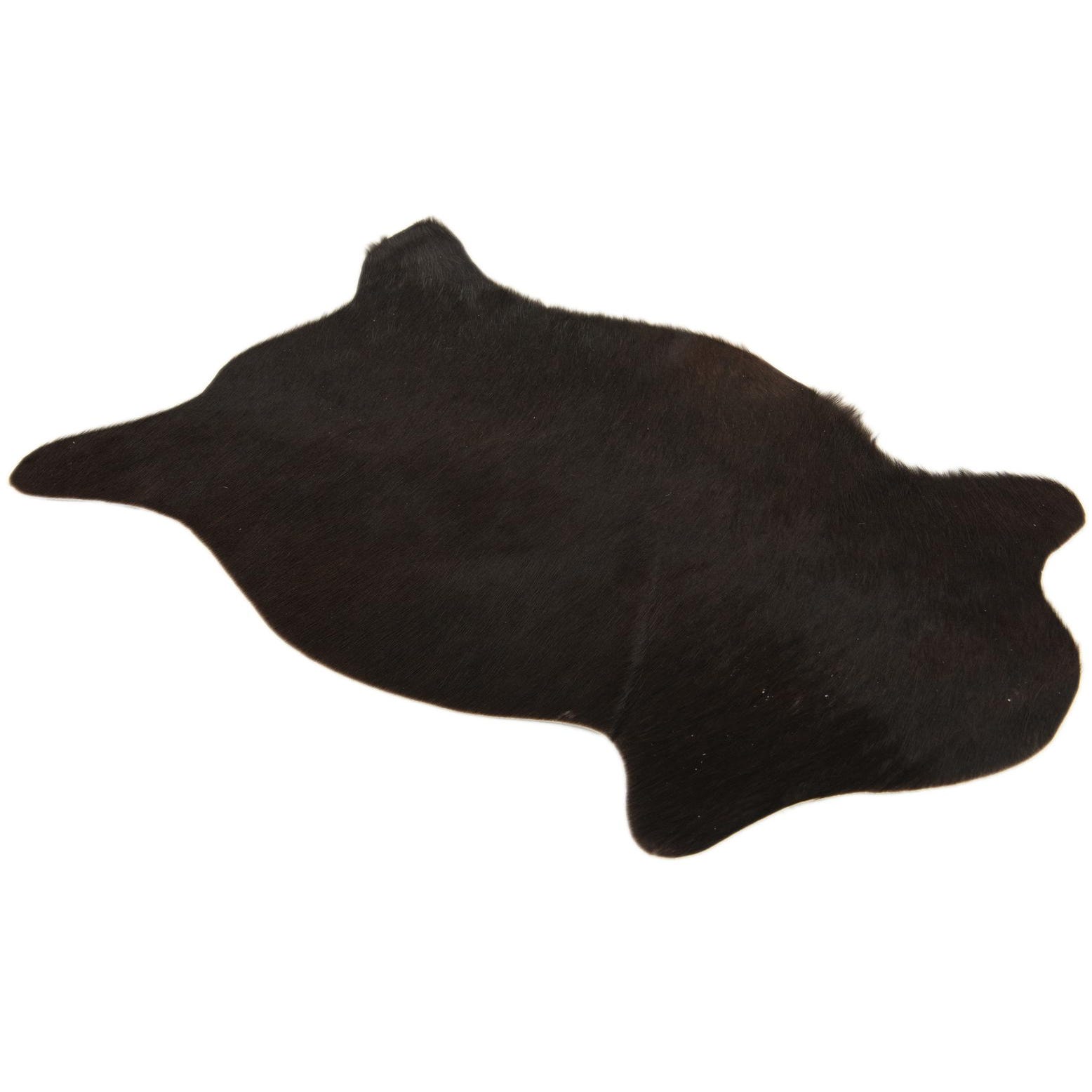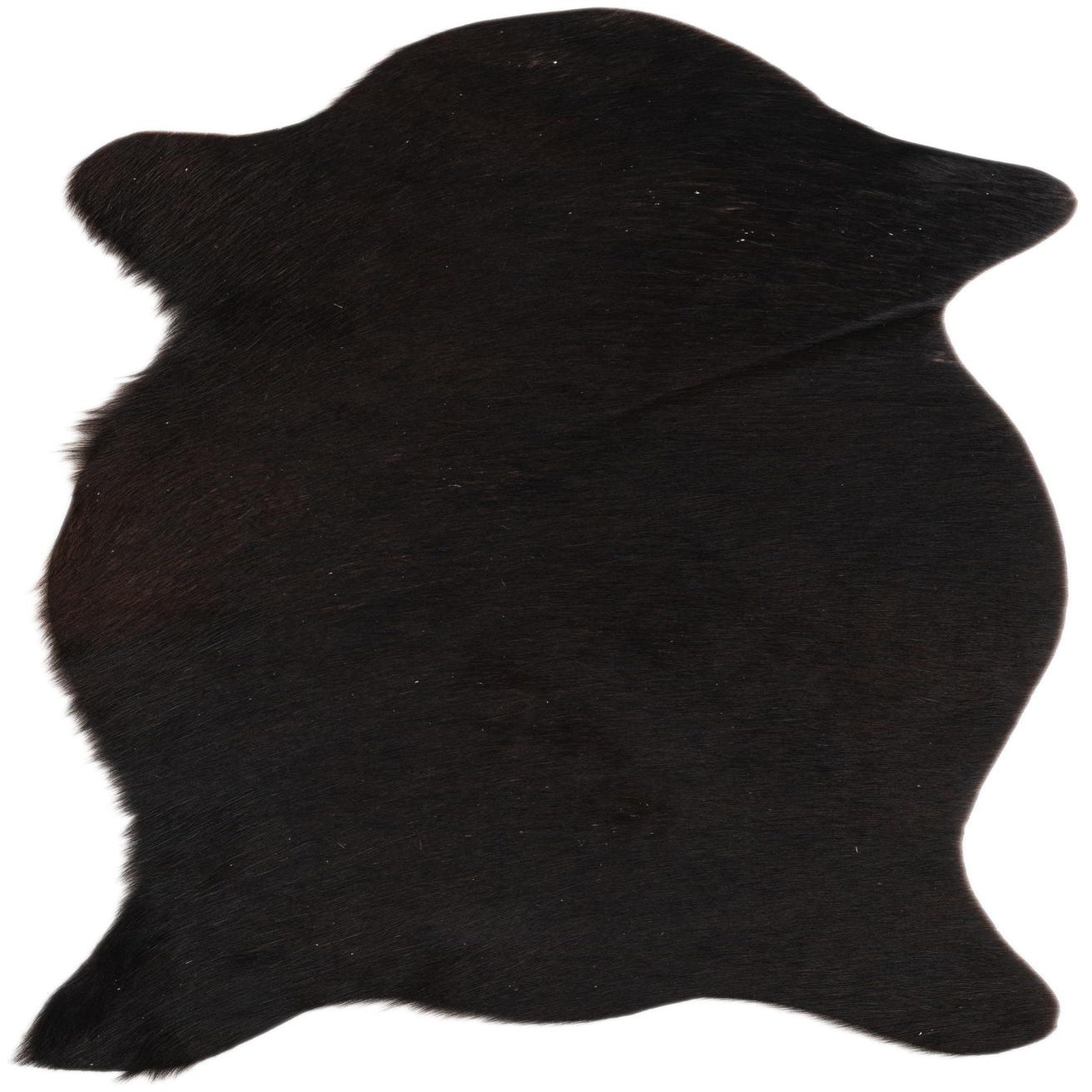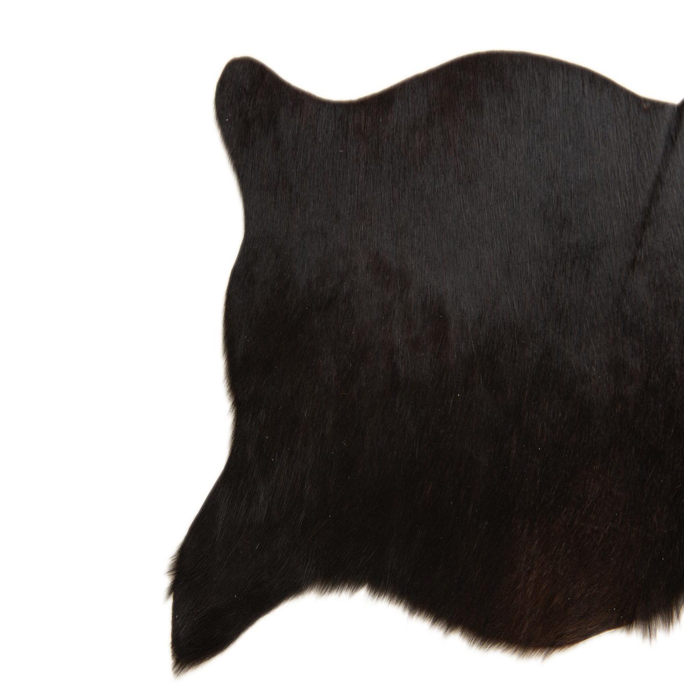 A 2x3 rectangular black cowhide rug with a natural, irregular shape and flat, textured pile.