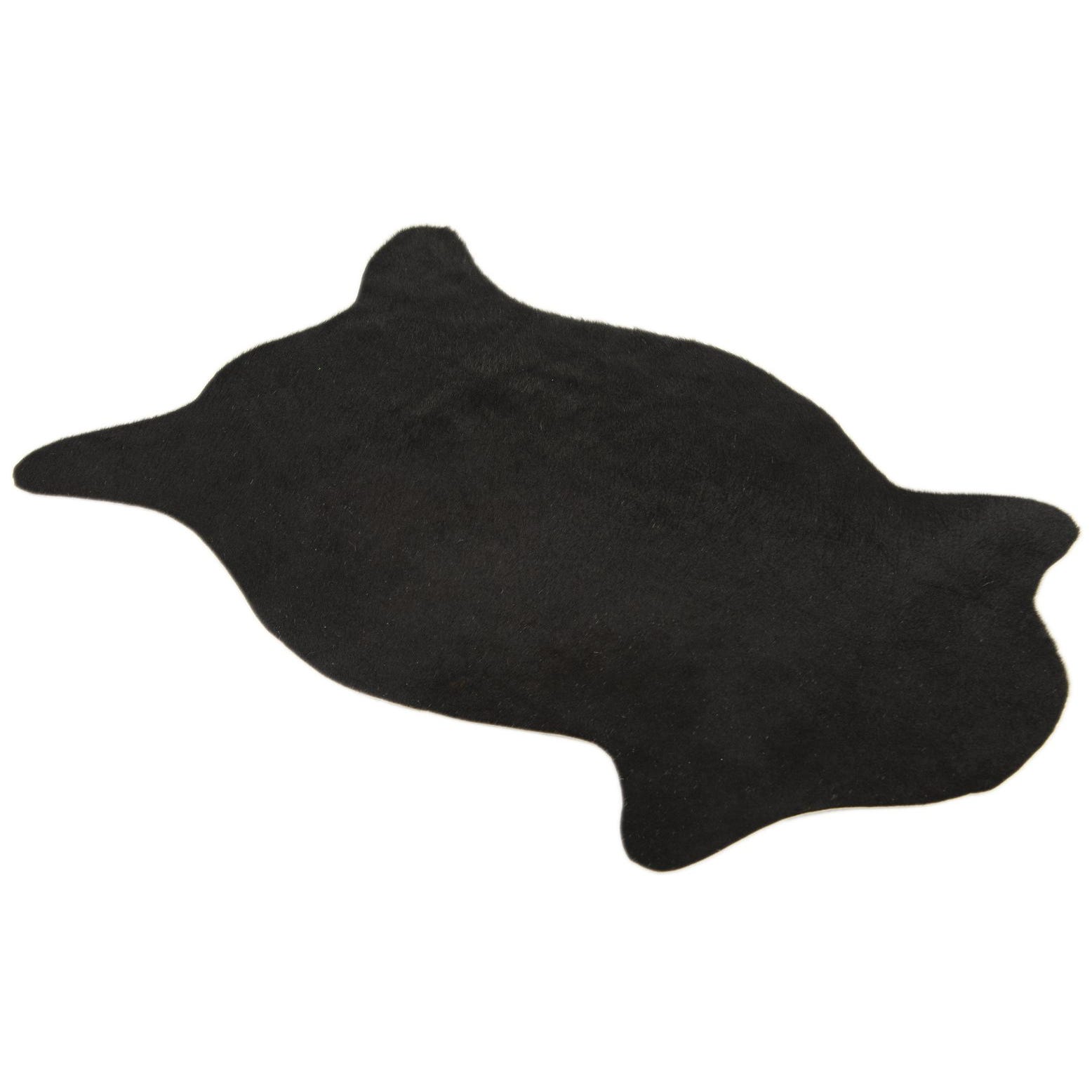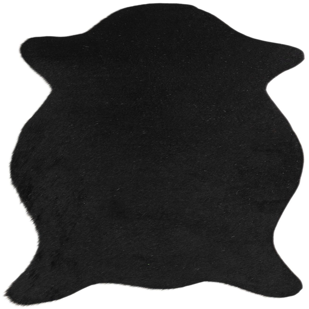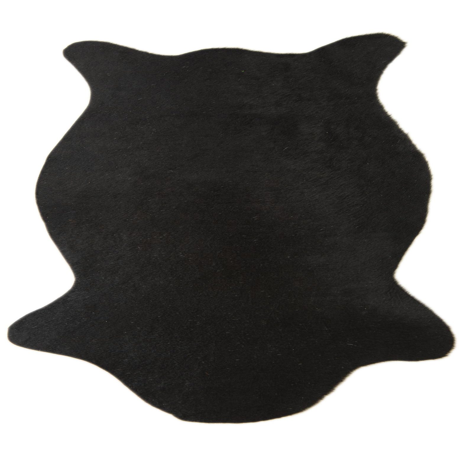 A 2x3 black cowhide leather rug with a natural, irregular shape, suitable for a modern living space.