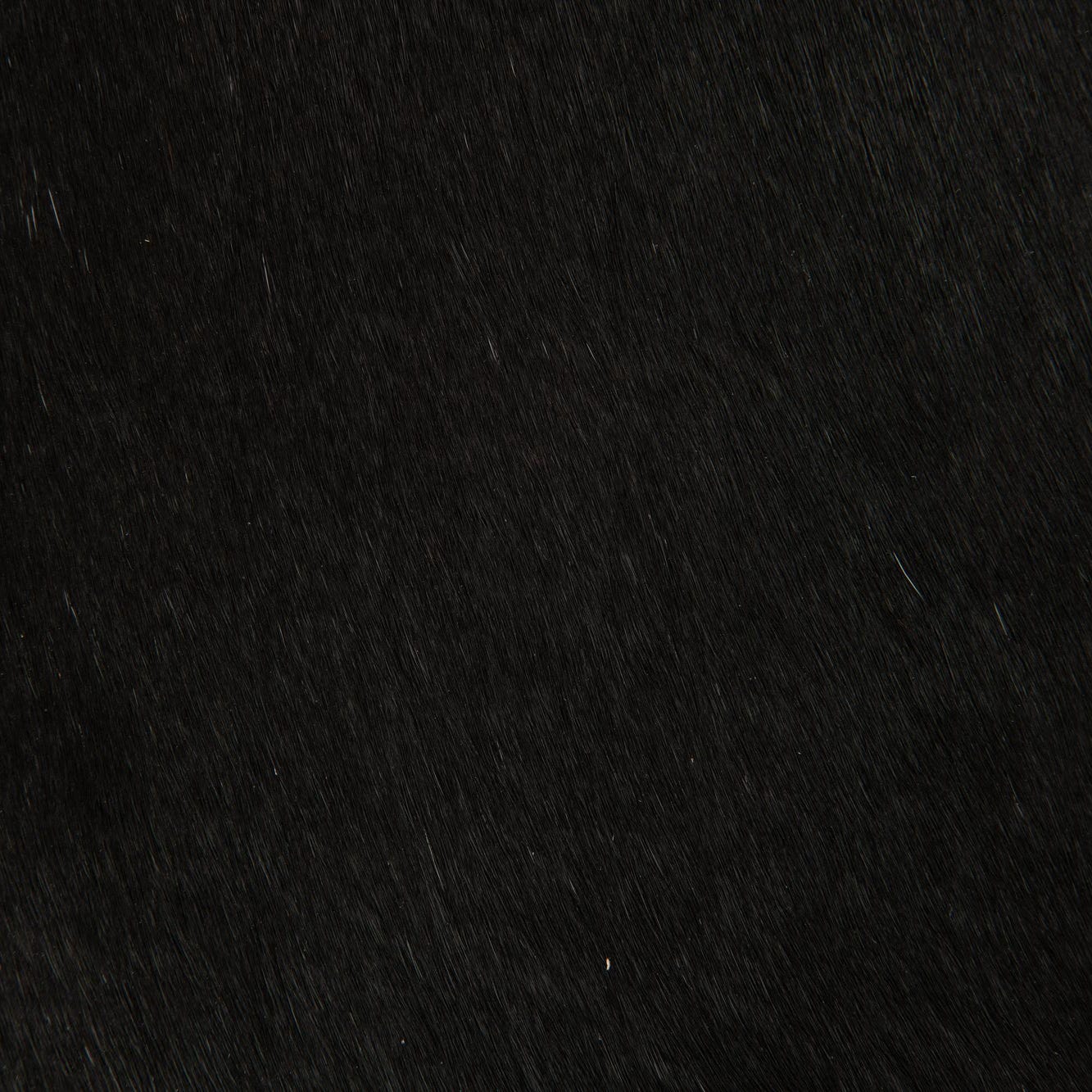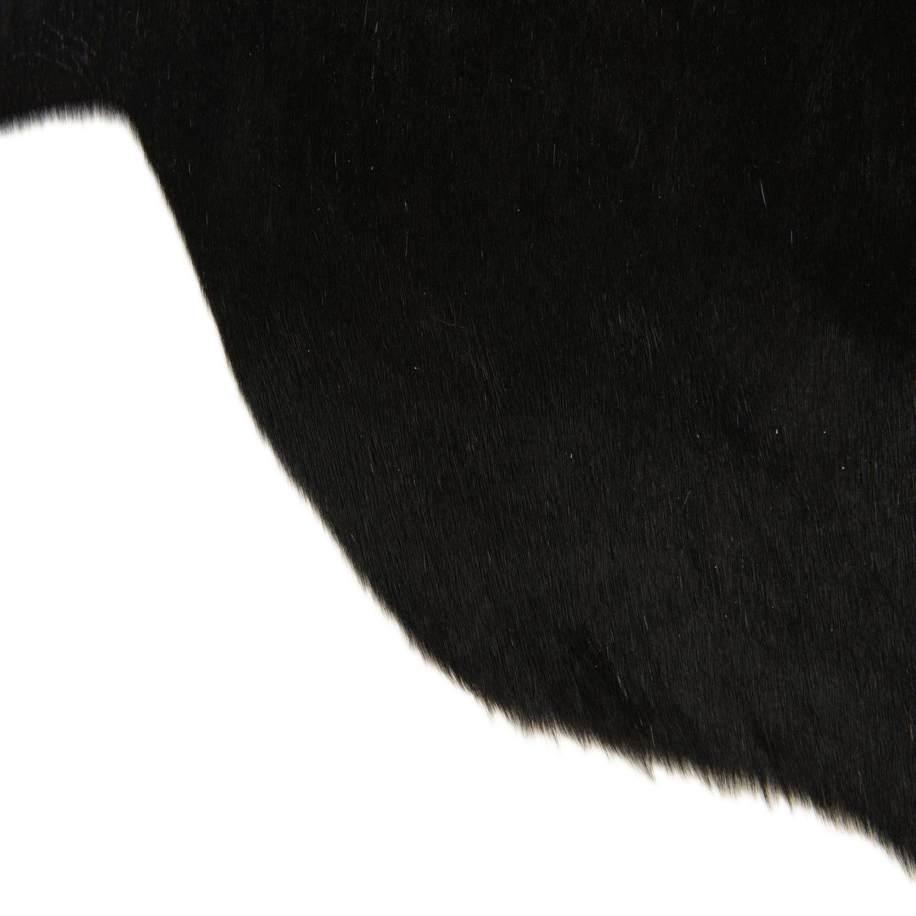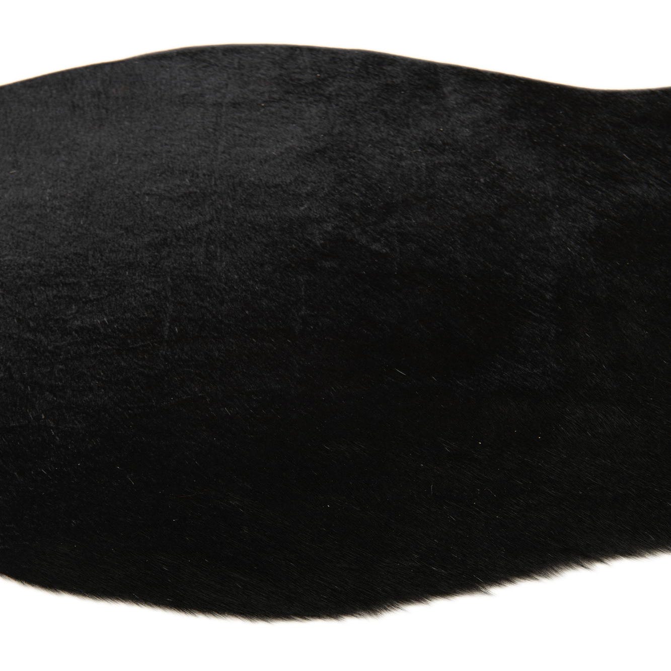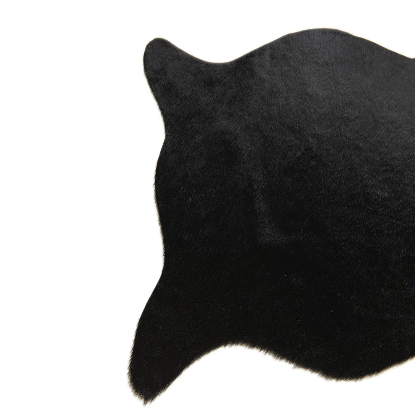 A 2x3 black cowhide leather rug with a natural, irregular shape, suitable for a modern living space.