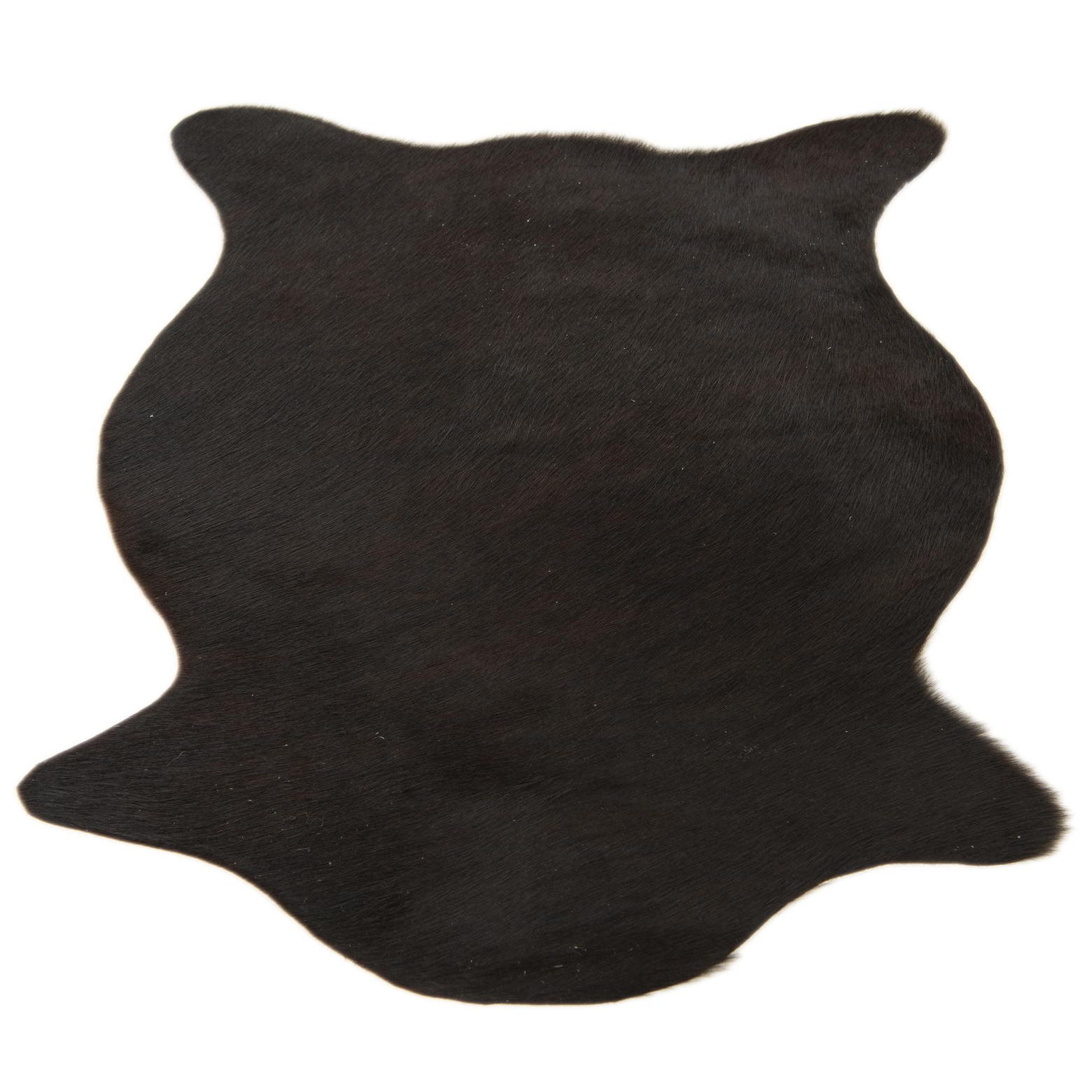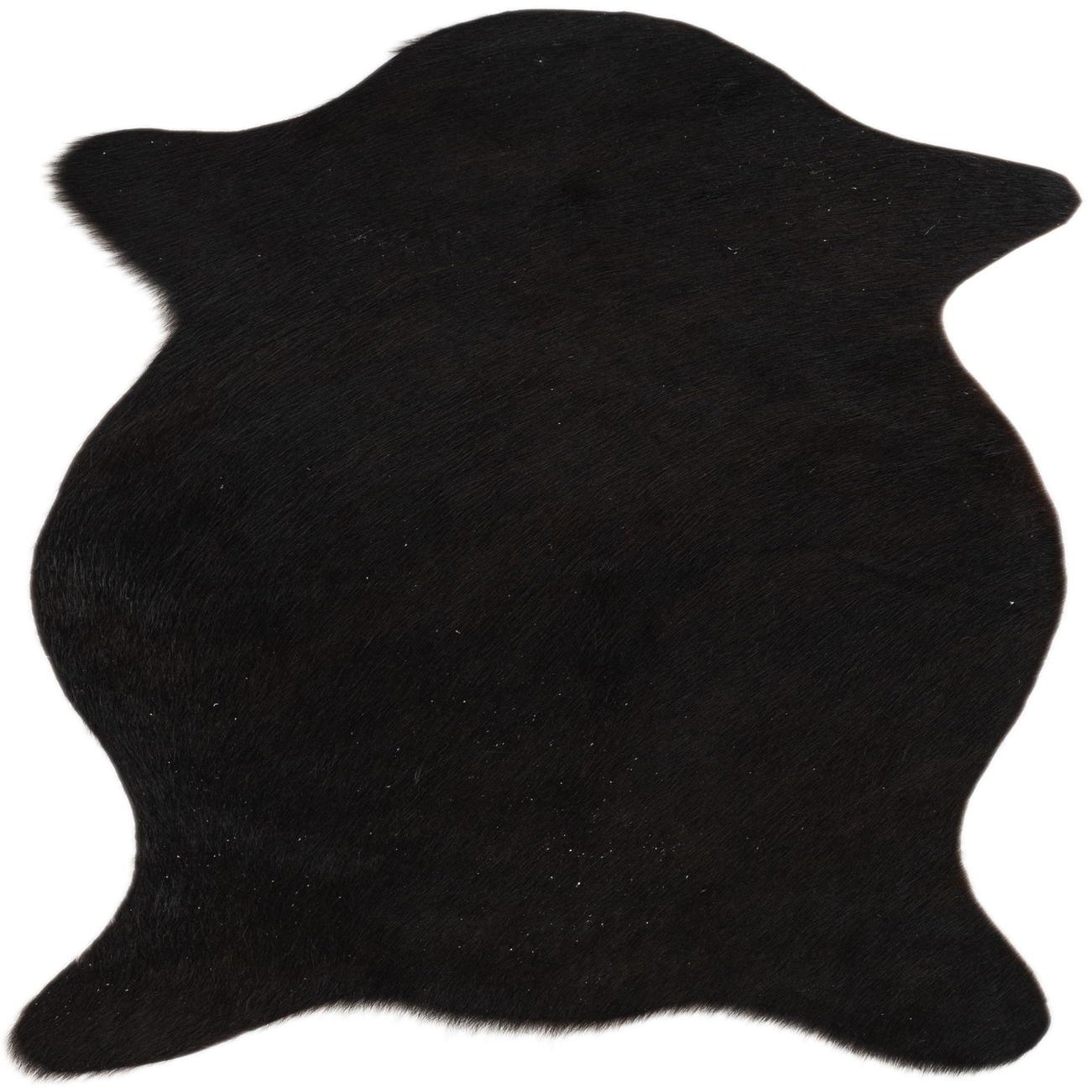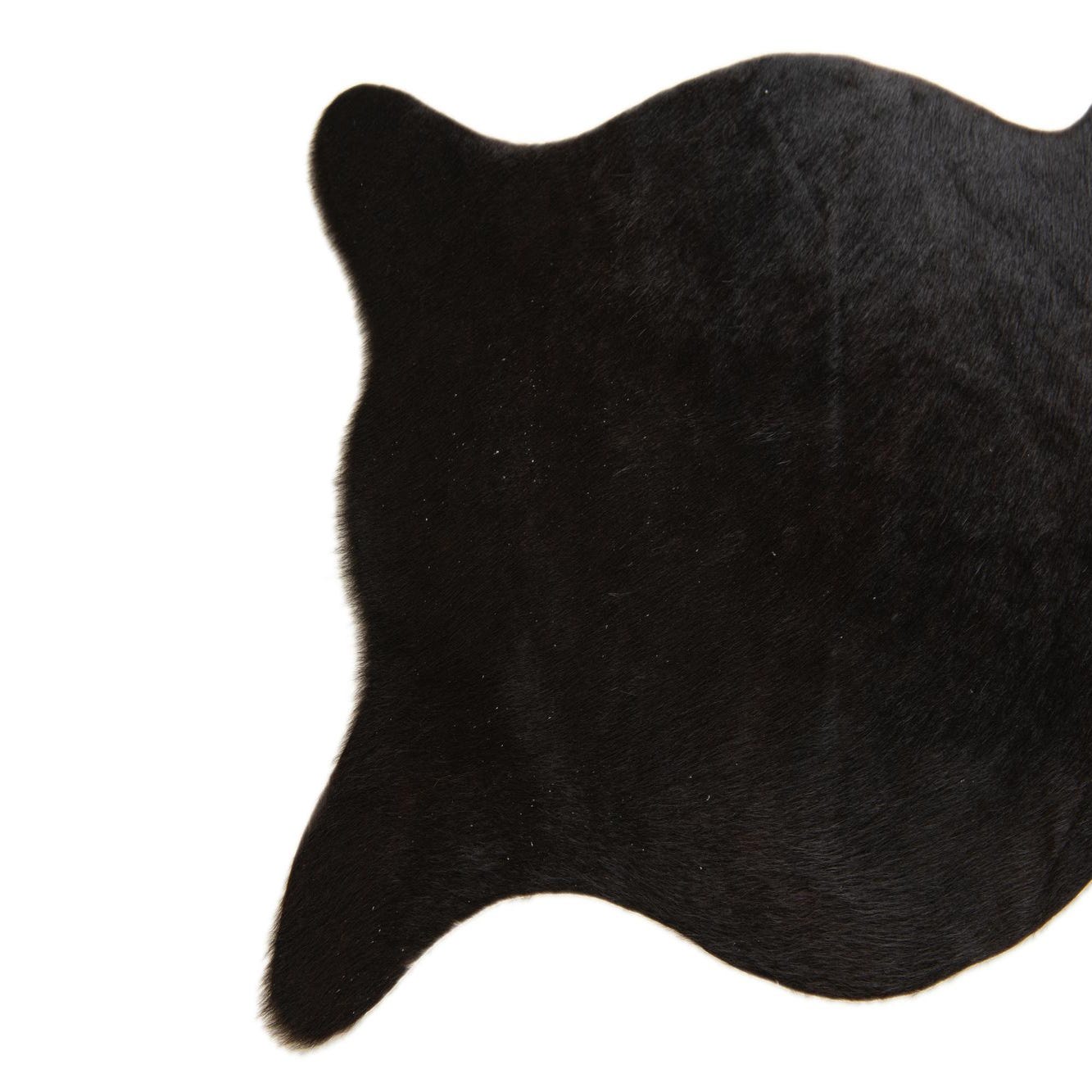 A 2x3 black cowhide leather rug with a natural, irregular shape, featuring a flat, textured pile.