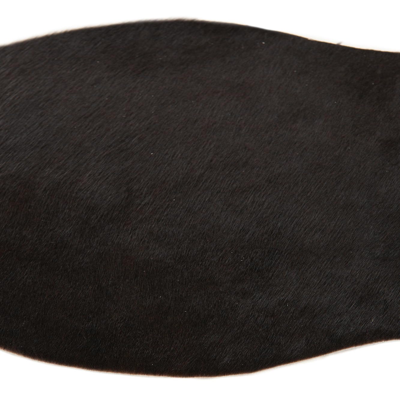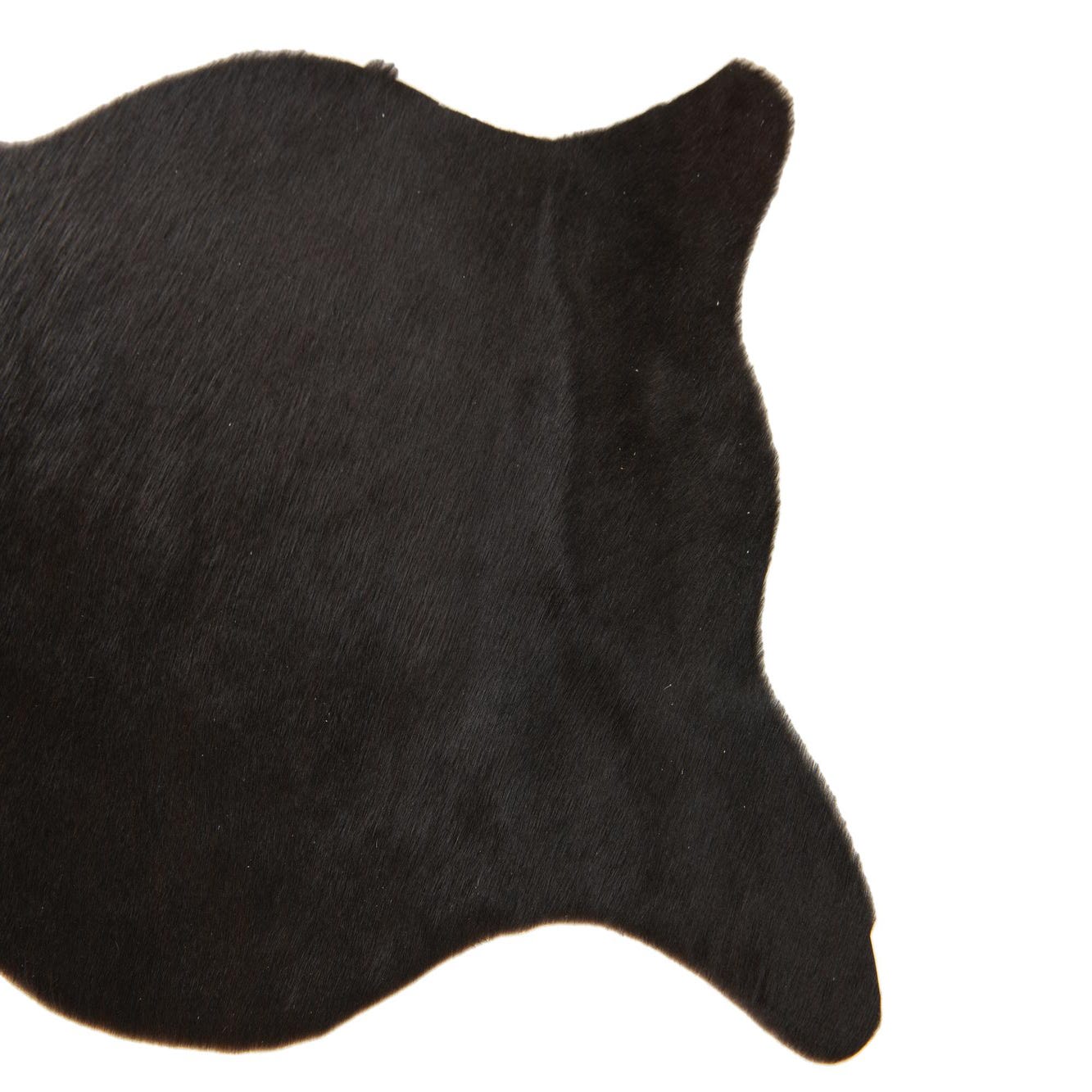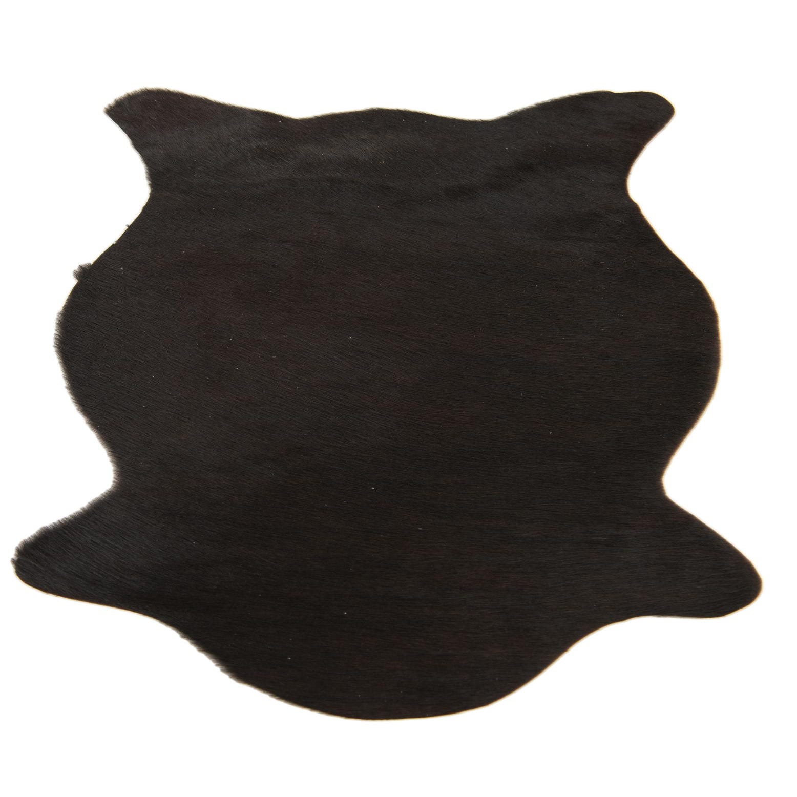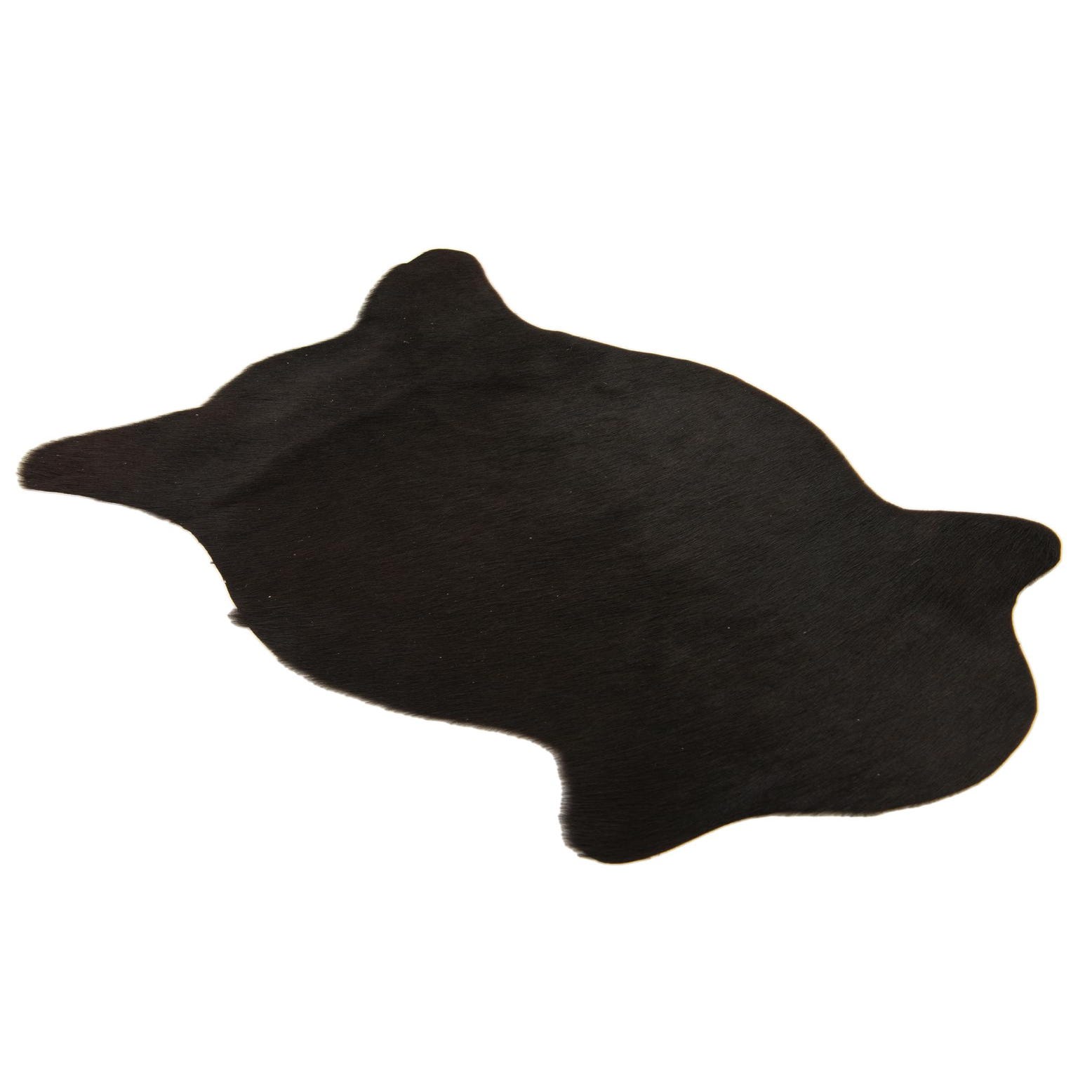 A 2x3 black rectangular cowhide leather rug with a natural, irregular shape and flat pile.