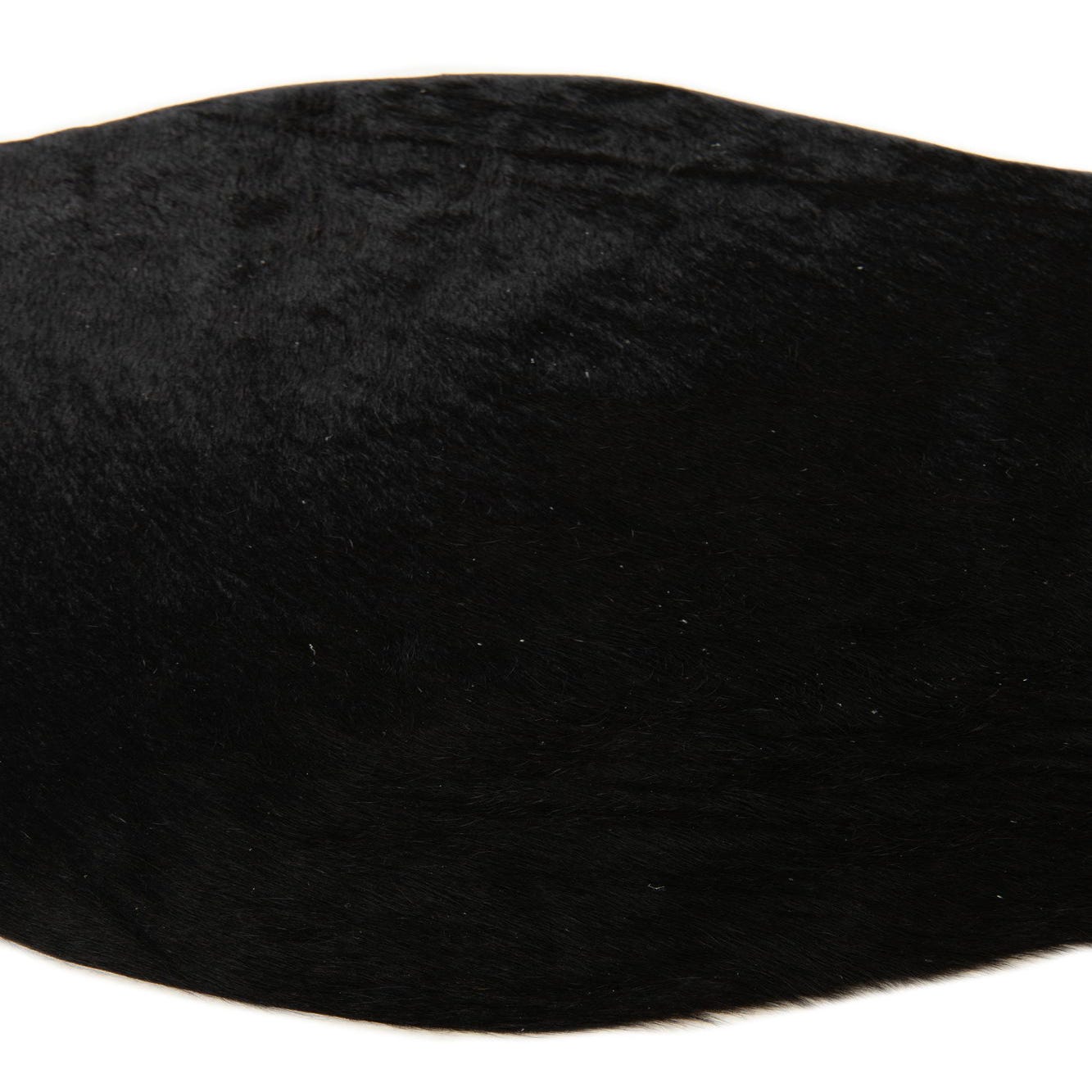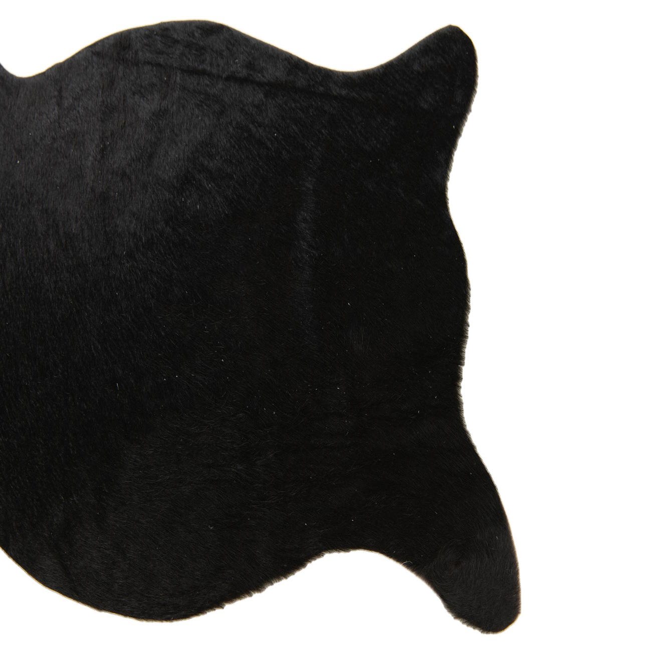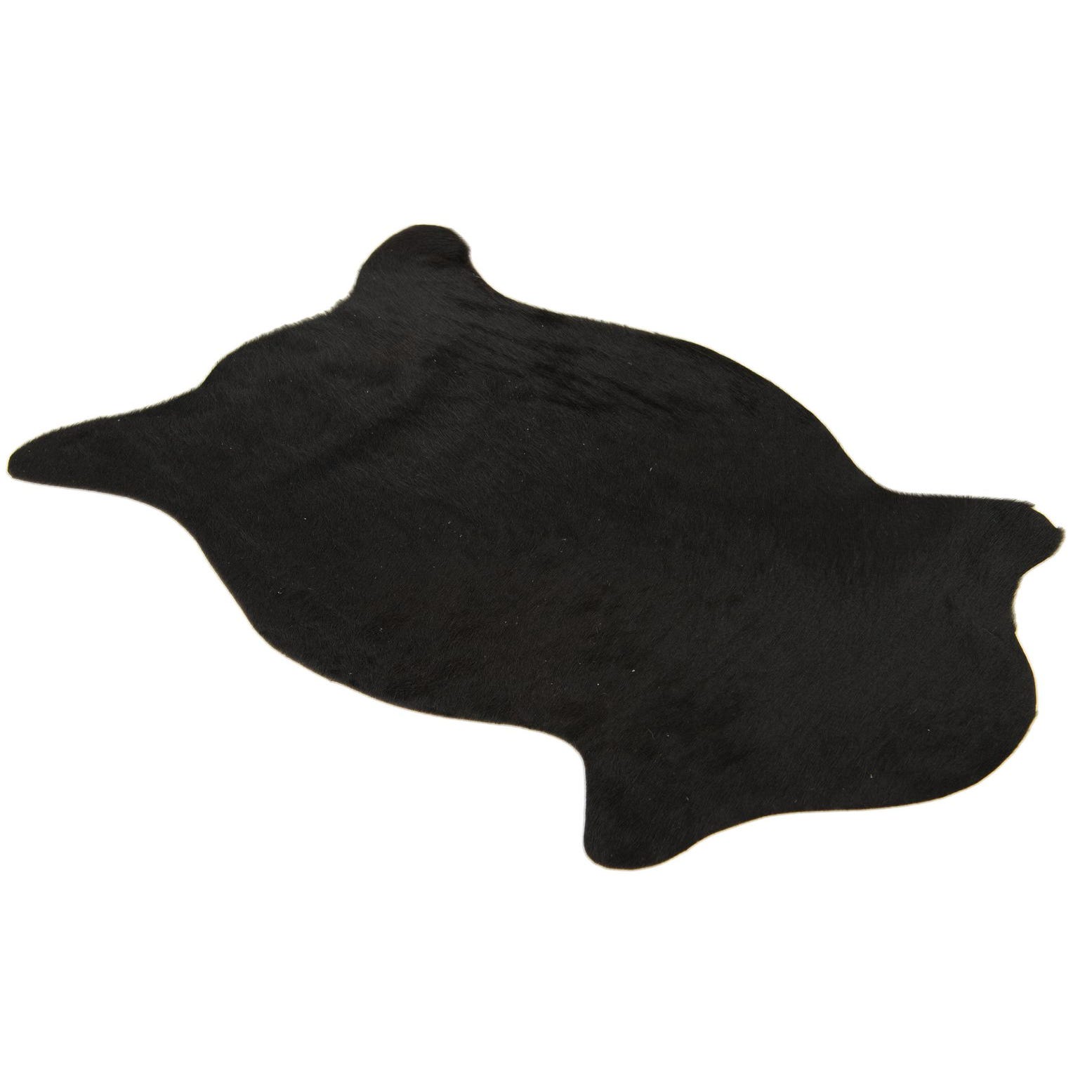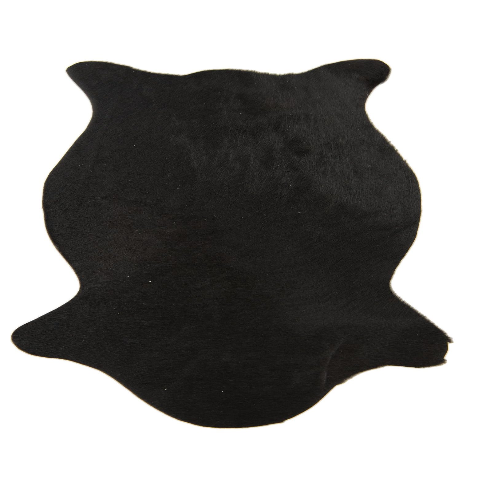 A 2x3 black cowhide leather rug with an organic, irregular shape, suitable for a modern entryway.