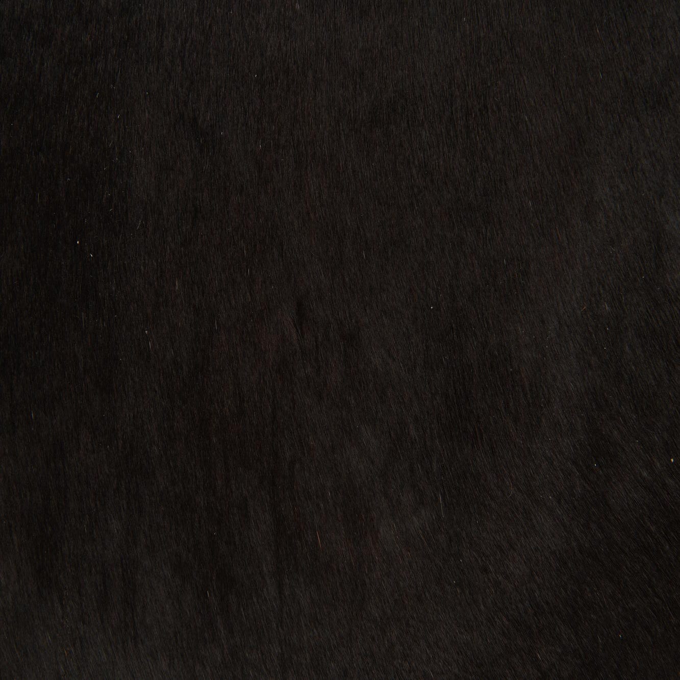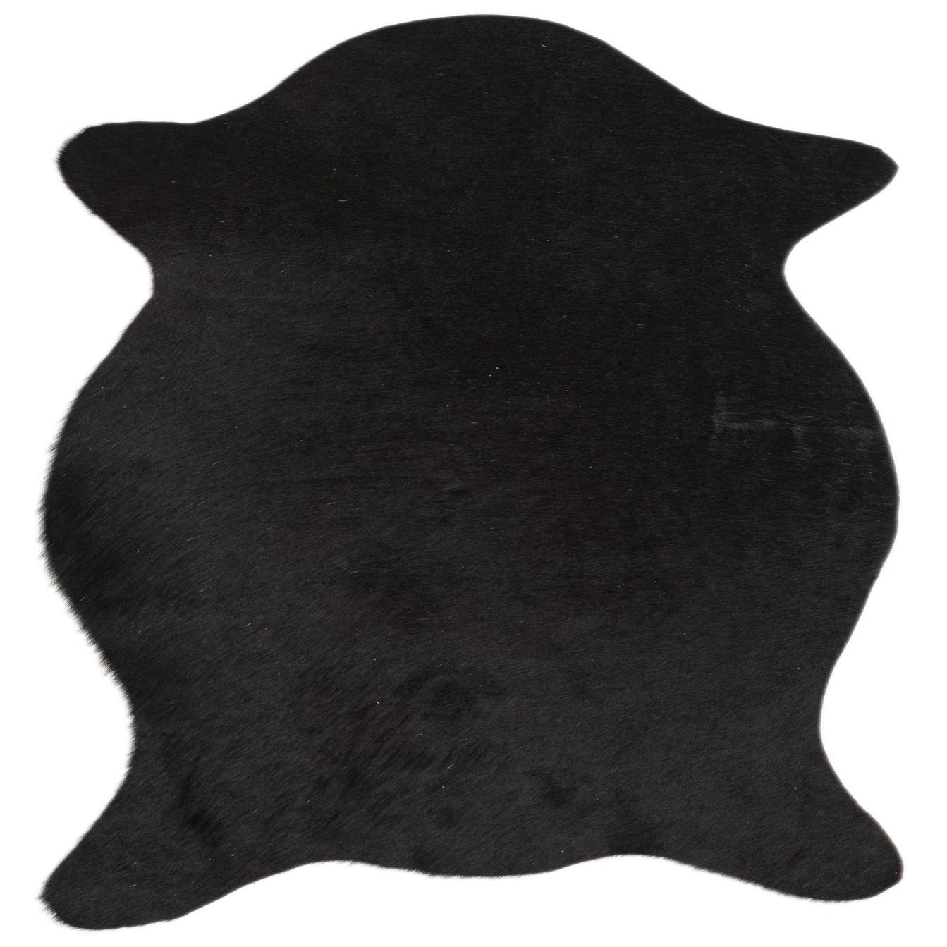 A 2x3 black rectangular cowhide rug with a modern shape and flat, textured pile, suitable for various indoor spaces.