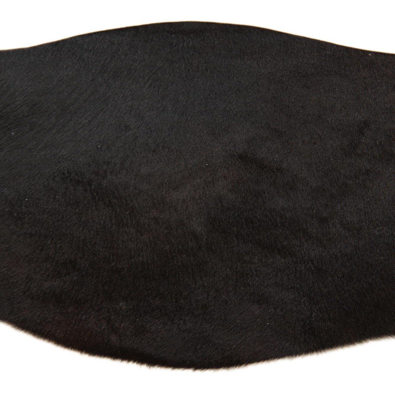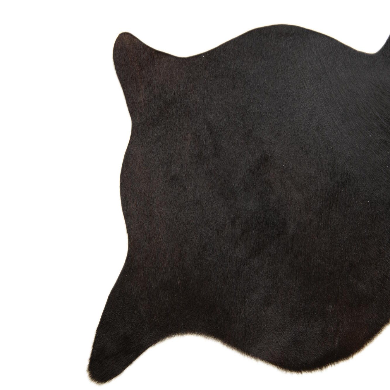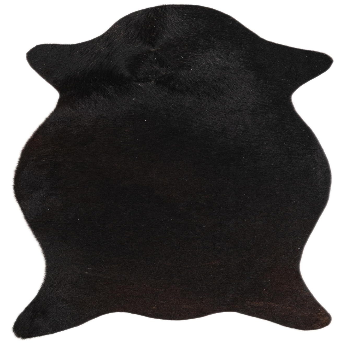 A 2x3 rectangular black cowhide rug with a natural, irregular shape, featuring a flat, textured pile.