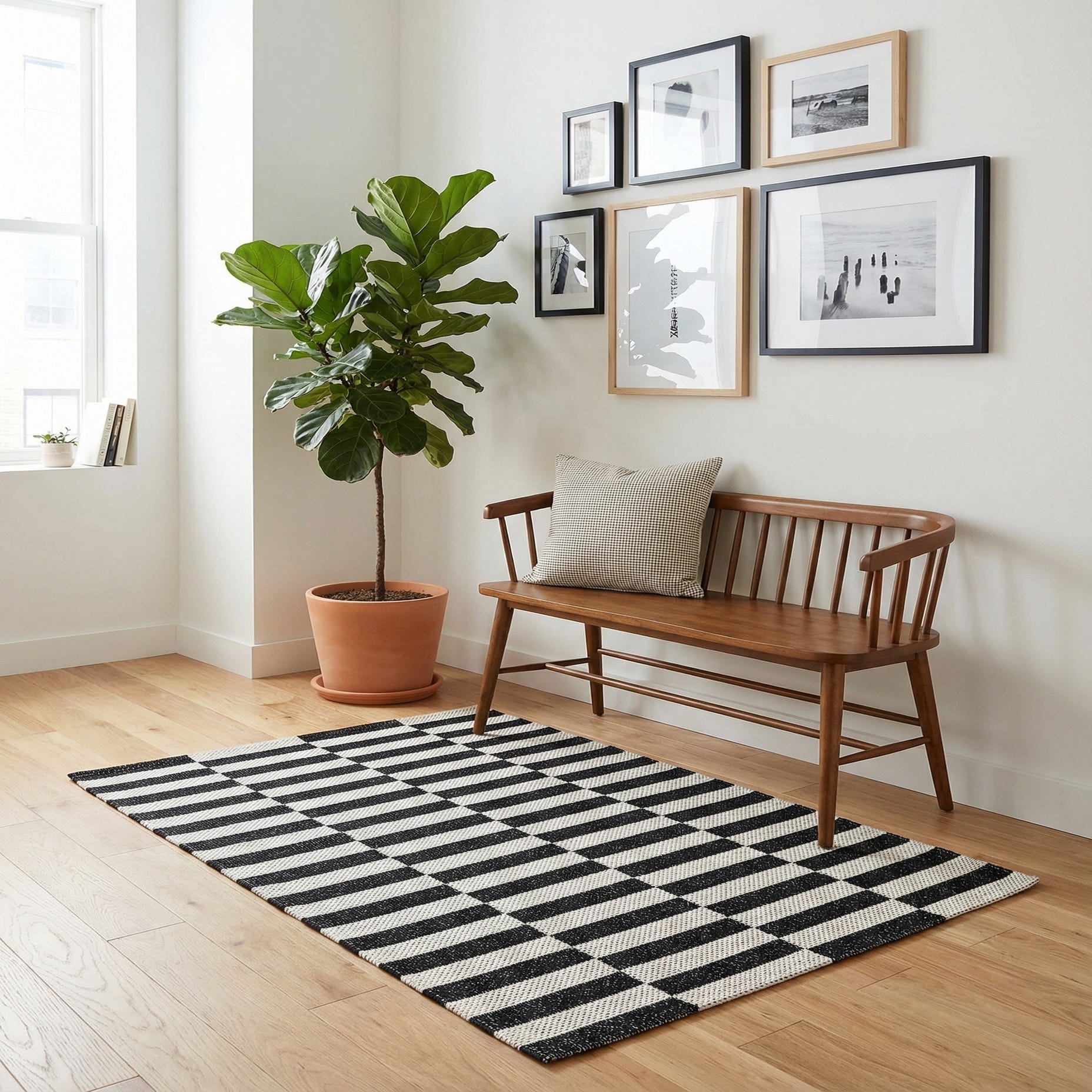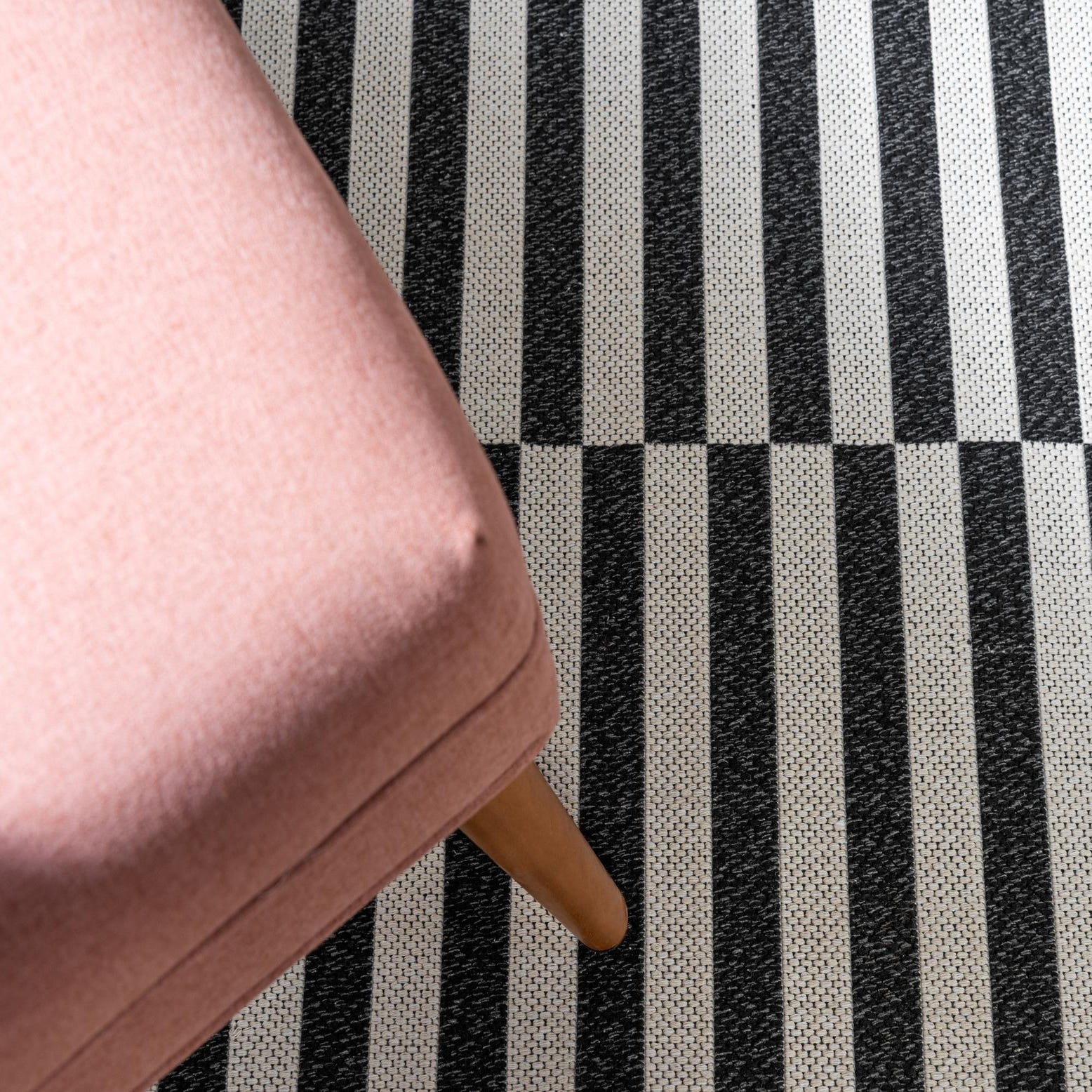 This piece works well as an anchor in contemporary and Scandinavian interiors, or as a crisp contrast in black-and-white or minimalist spaces. Place it in an entryway, in front of a sink, under a small dining set, or layered over a larger neutral rug to introduce pattern without adding height. Its graphic scale complements clean-lined furniture and simple accessories, and pairs nicely with warm woods, matte metals, or leather accents.
