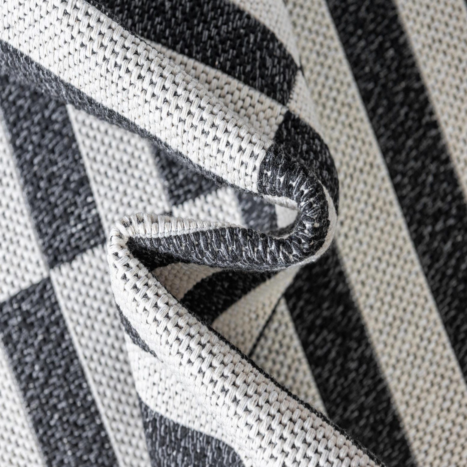 A graphic, geometric weave built on a deep black ground, this rug pairs narrow ivory bands with solid black to create a stacked checker pattern that reads modern and orderly. The two-tone palette is clean and restrained, emphasizing the linear rhythm of the design. Machine-made from 100% cotton in a flatweave construction, the surface has a low-profile, slightly textured hand—you can feel the woven ribs beneath your feet and see the subtle slub of the cotton yarns that give the ivory stripes a soft, natural look.