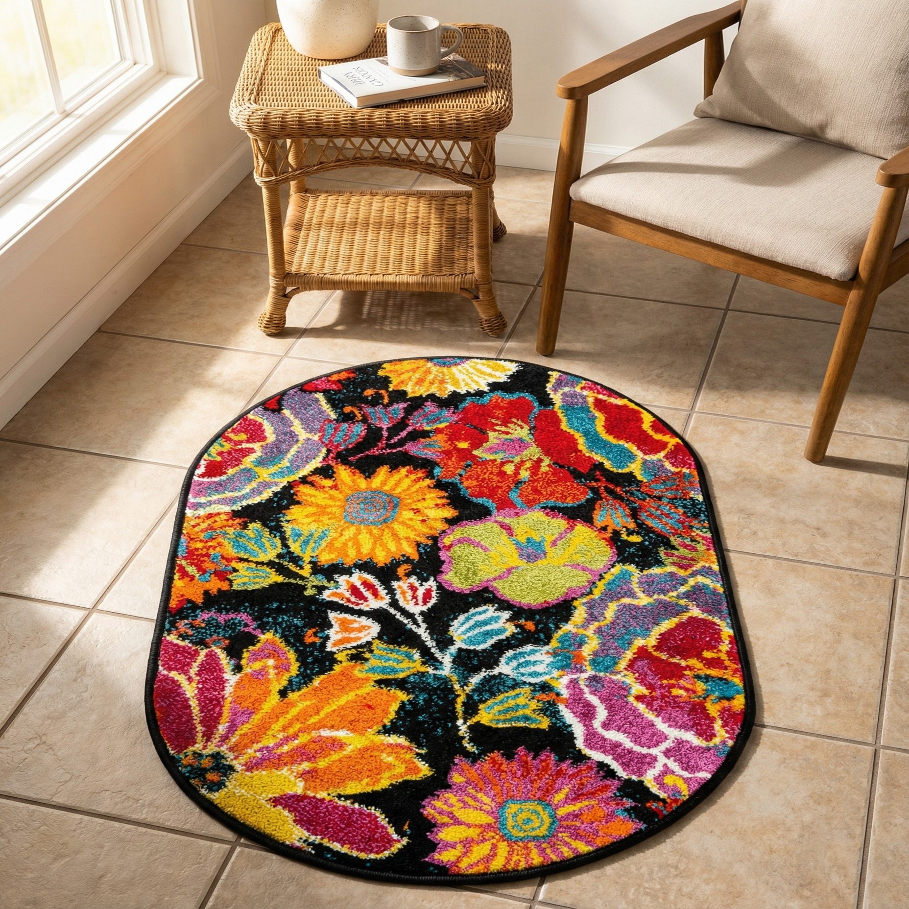 A vibrant 2' 2 x 3' 1 oval rug with a black background and a bold, colorful floral pattern featuring red, orange, yellow, pink, and blue flowers and leaves.