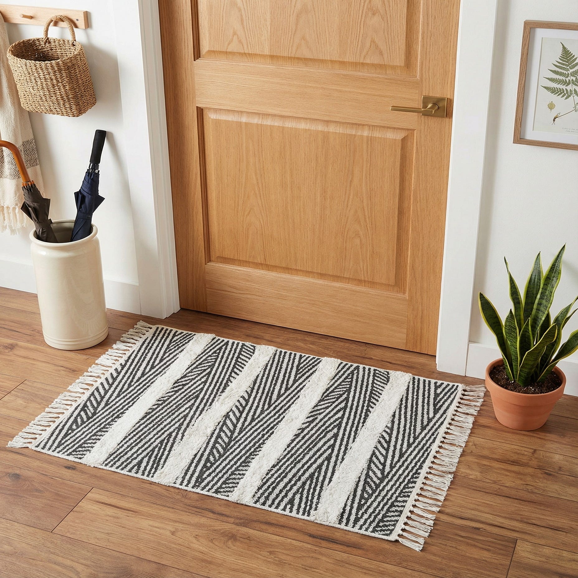 The overall effect is contemporary with a relaxed, crafted feel, making it well suited for minimalist, Scandinavian, or modern-boho interiors. Use it as an accent in an entryway or in front of a sink, place it beside a bed to add softness underfoot, or layer it over a larger neutral rug to bring pattern and dimension to a living area. Pair with light wood furniture, black metal accents, and neutral textiles to emphasize the monochrome palette and the rug’s mix of structure and texture.