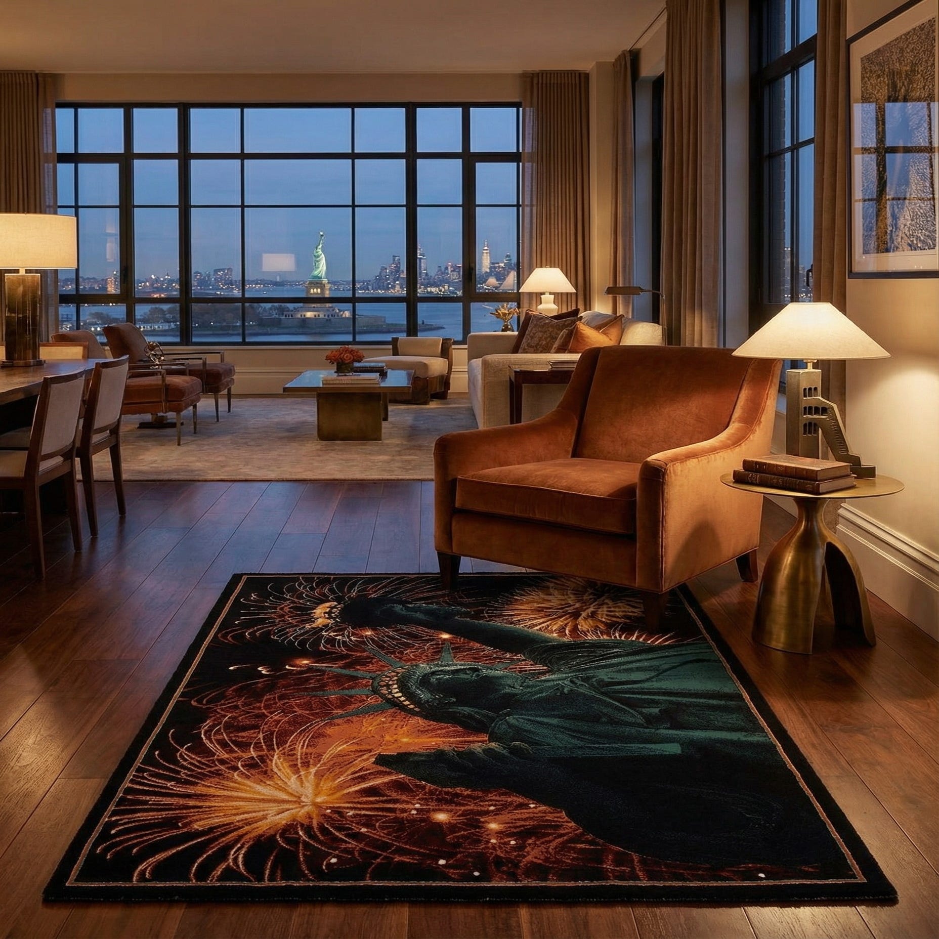 A rectangular 2x3 black rug featuring a detailed image of the Statue of Liberty against a backdrop of vibrant orange and yellow fireworks.