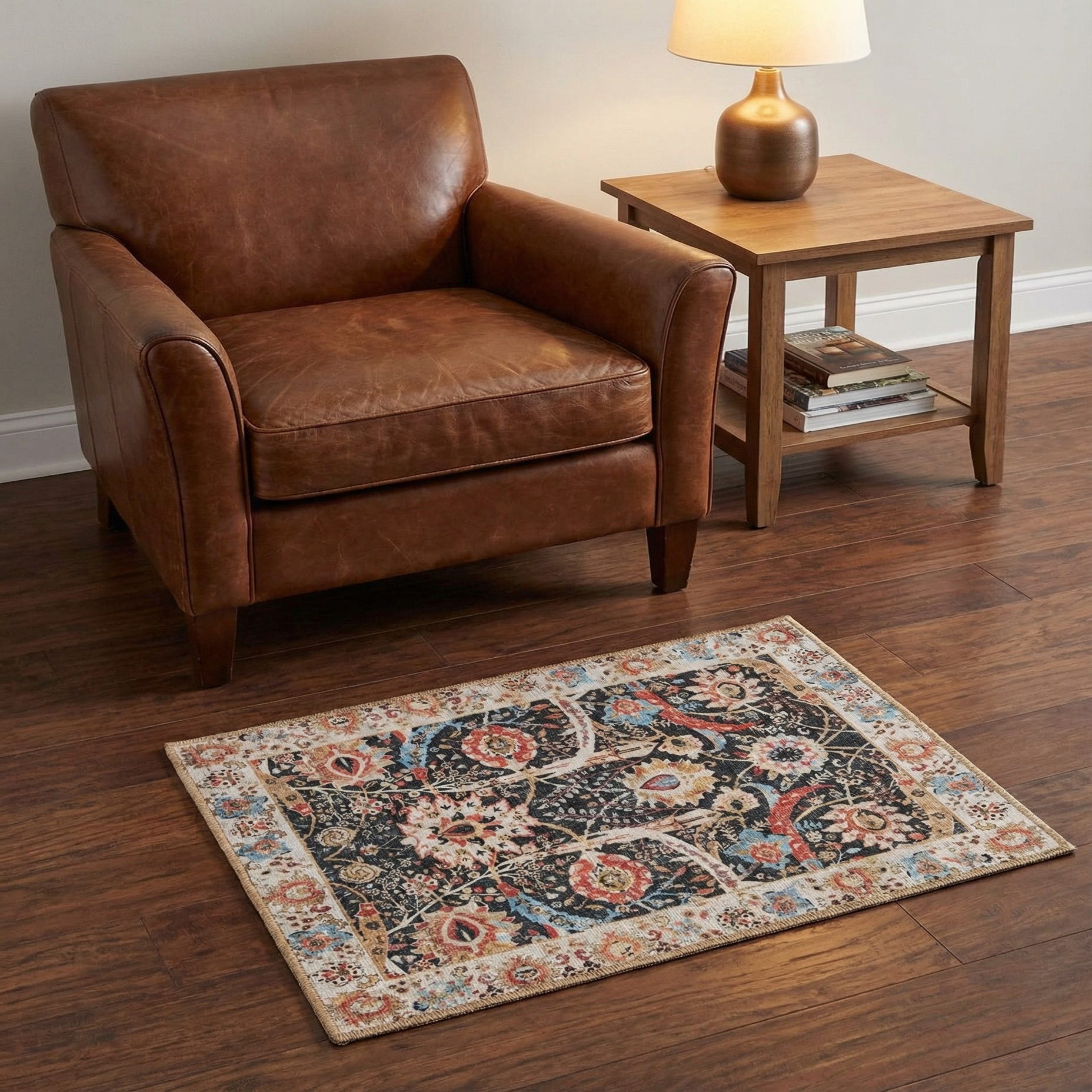 This rug works well in compact spaces where a bold pattern can anchor the room — place it in an entryway, beside the bed, in a home office, or layered in a living area to add visual interest. It pairs naturally with warm wood tones and neutral upholstery, and also complements eclectic or transitional schemes where traditional motifs meet contemporary furnishings. The dark background provides contrast on light floors while the lighter border helps connect to pale walls or linens.