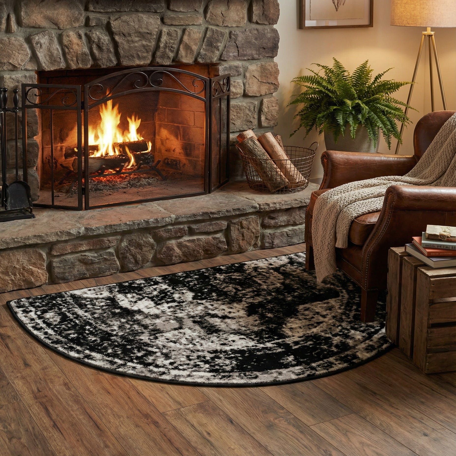 Perfect for anchoring a space, this rug's versatile color palette and dynamic pattern could complement a variety of interior styles, from minimalist and modern to more eclectic decor schemes. Its half-moon shape makes it especially suitable for placement in front of a fireplace, under a console table in a foyer, or as an accent piece in a living room, adding both warmth and visual interest to the space.