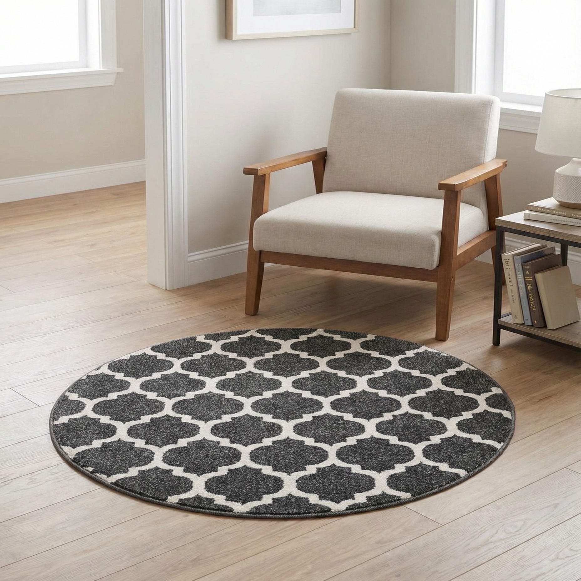 Machine-made from 100% polypropylene, the low, dense pile feels smooth and slightly cushioned underfoot. This shape works well in compact spots — an entryway, a cozy reading nook, beneath a round bistro table, or beside a bed — and layers easily over hardwood or tile to define a small seating area. Pair it with light wood furniture and black metal accents for a contemporary feel, or with neutral upholstery and textured throws to balance the graphic pattern in a more relaxed setting.