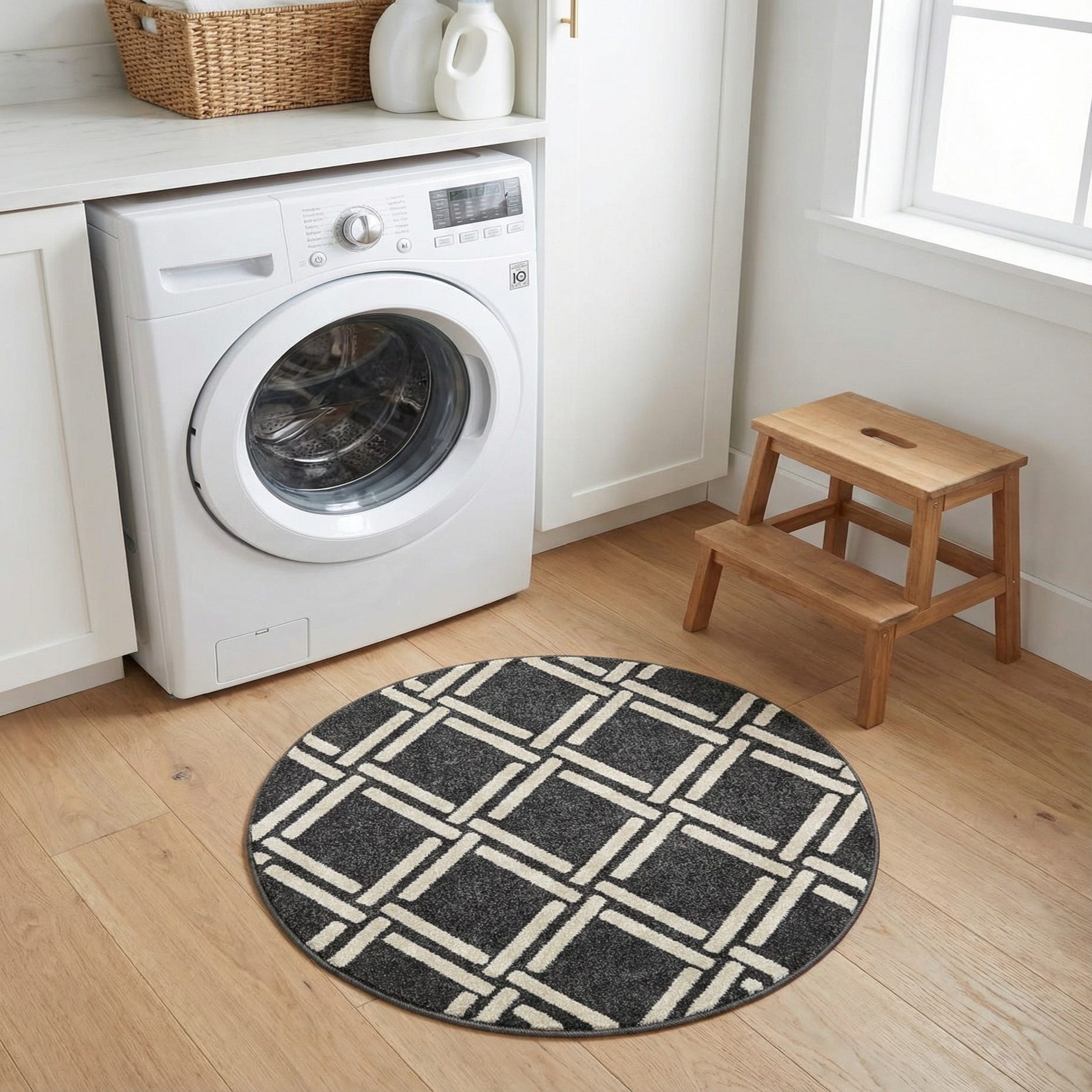 This round rug works well as an anchor in compact spaces: place it beneath a small bistro table, at the entry to define a foyer, or centered in a cozy seating area to add structure and visual rhythm. It pairs naturally with natural wood tones, black metal accents, neutral upholstery, and minimalist or mid-century modern furnishings—ideal for contemporary living rooms, home offices, or bedside areas where a touch of pattern and texture is needed.