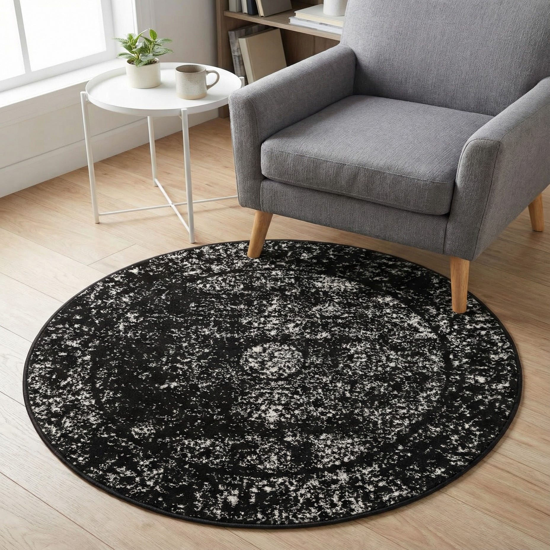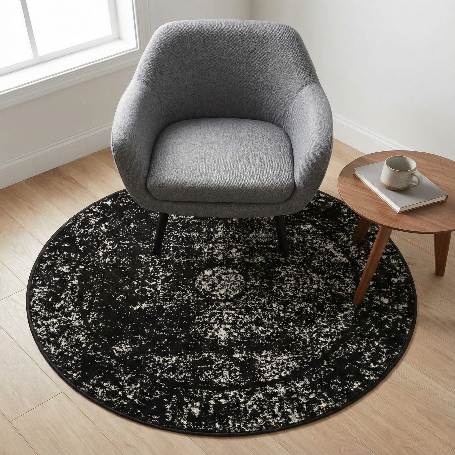 A 3'1" round black rug with a distressed white speckled pattern and subtle medallion design, suitable for indoor use.