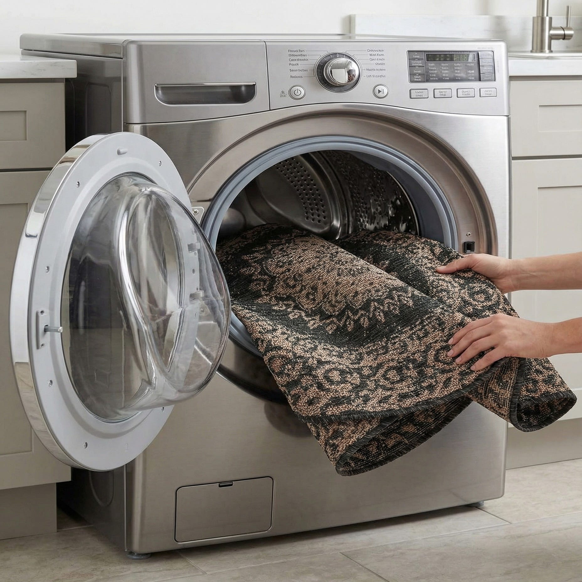 Primary color is Black. Colors in this rug include: Black, Light Brown.