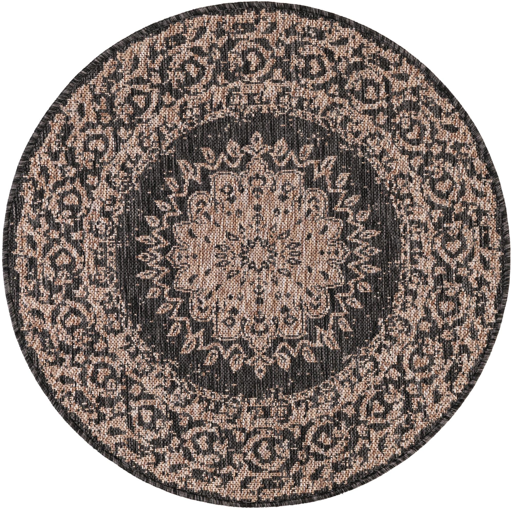A 3' round black and beige vintage medallion rug with a flatweave texture, suitable for indoor or outdoor use.