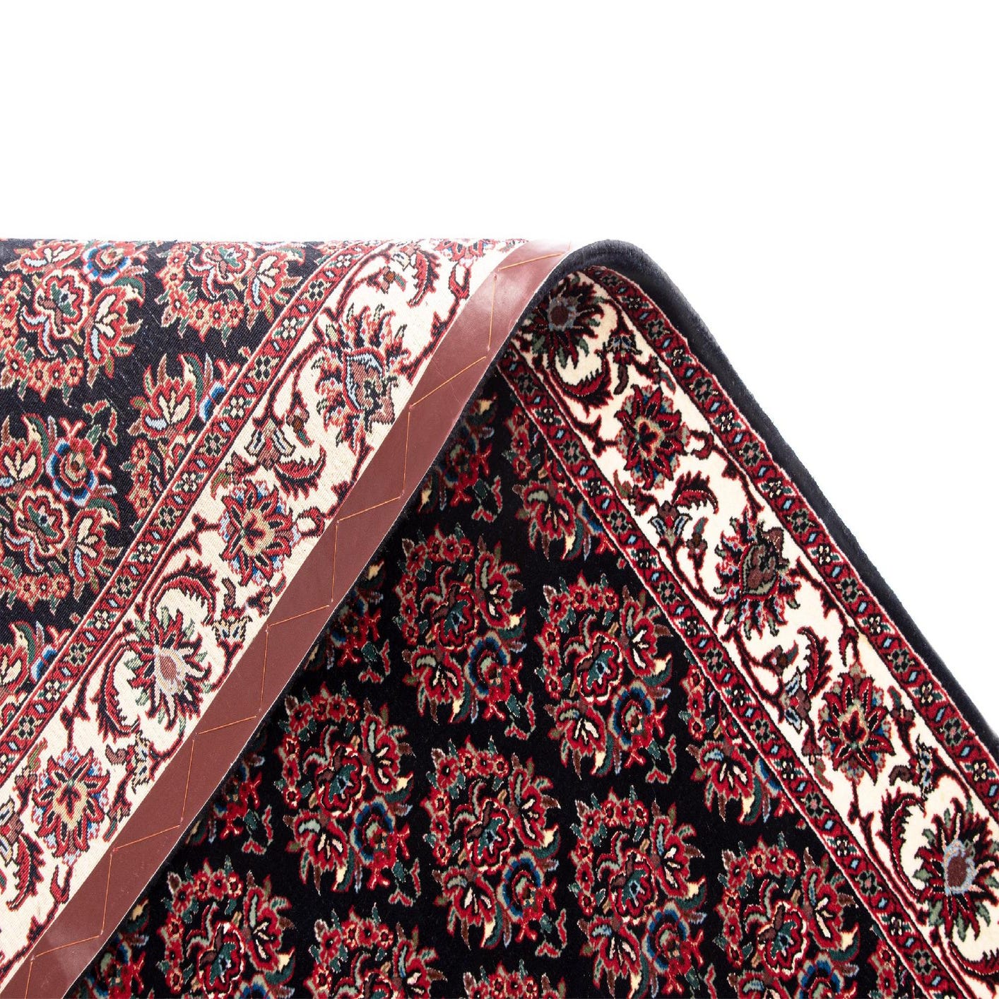A 3x5 rectangular black Persian rug with an intricate red, blue, and cream floral pattern and a decorative cream border.
