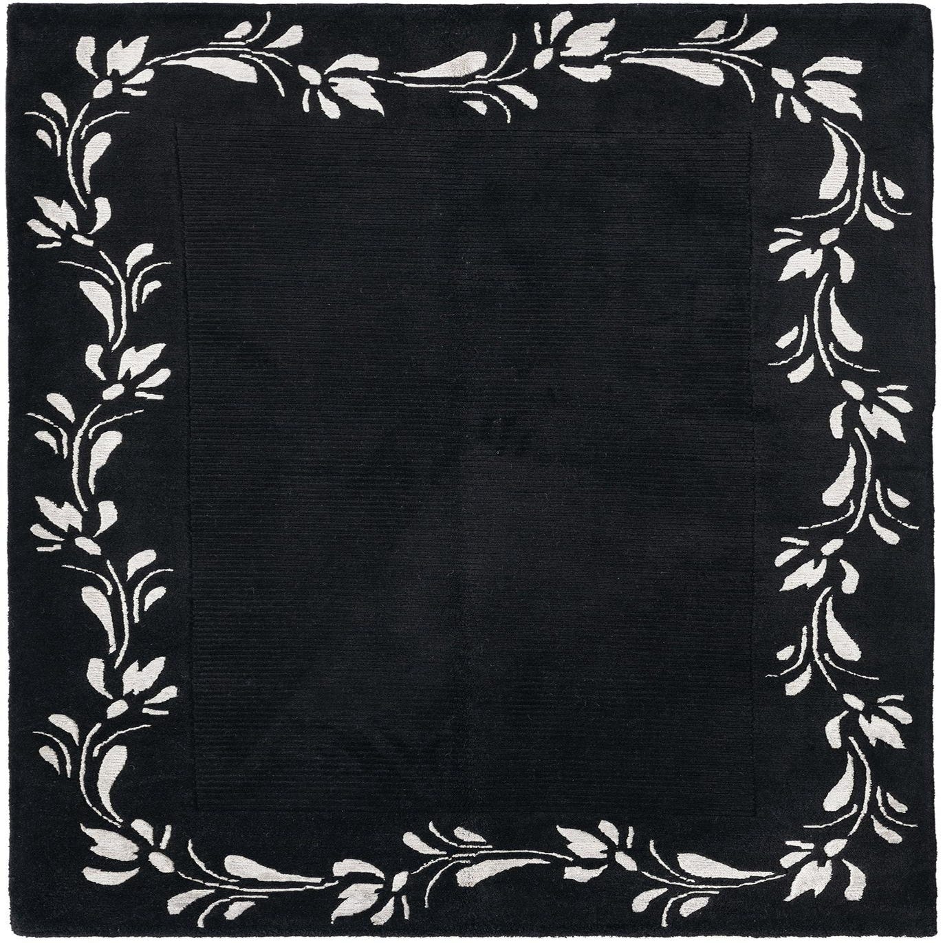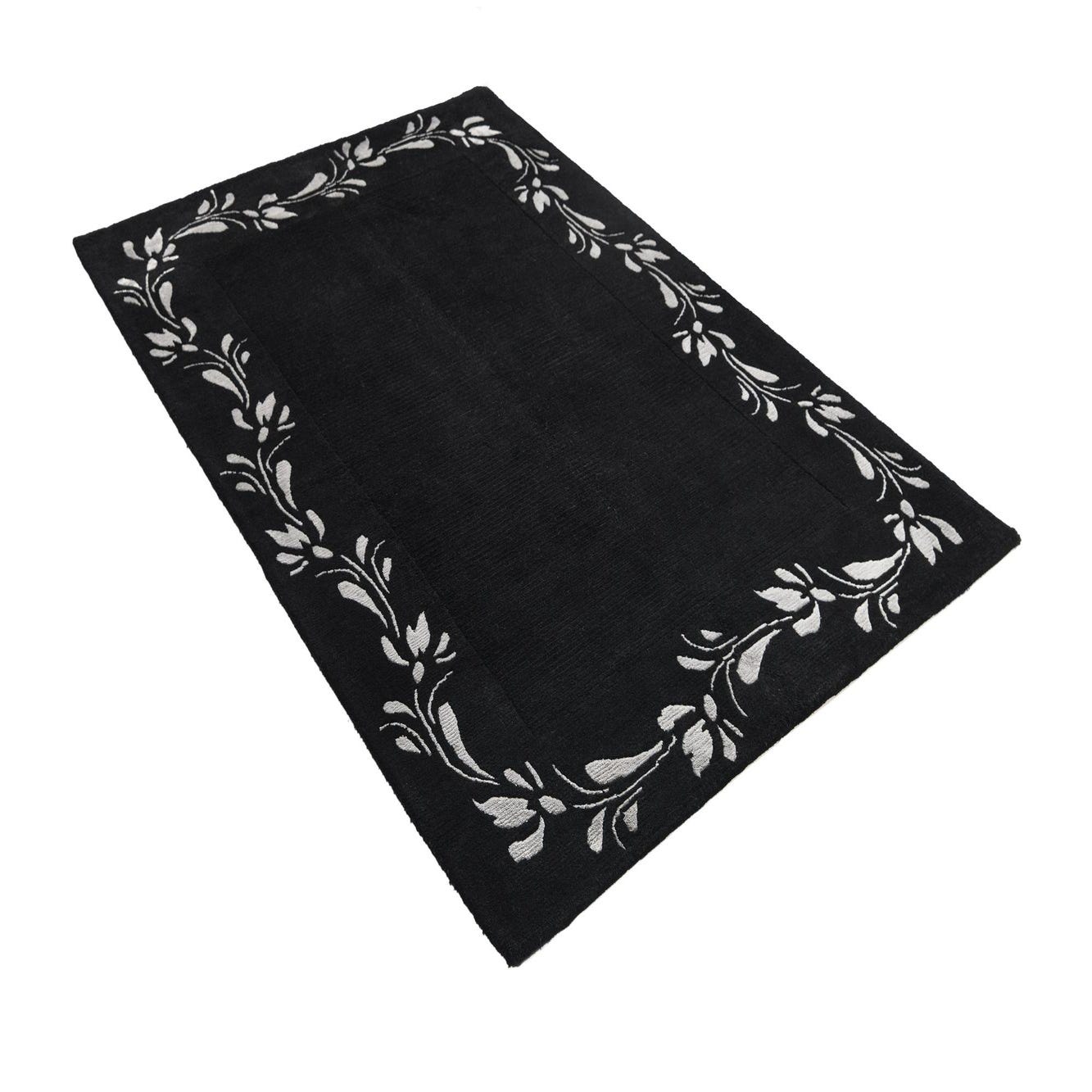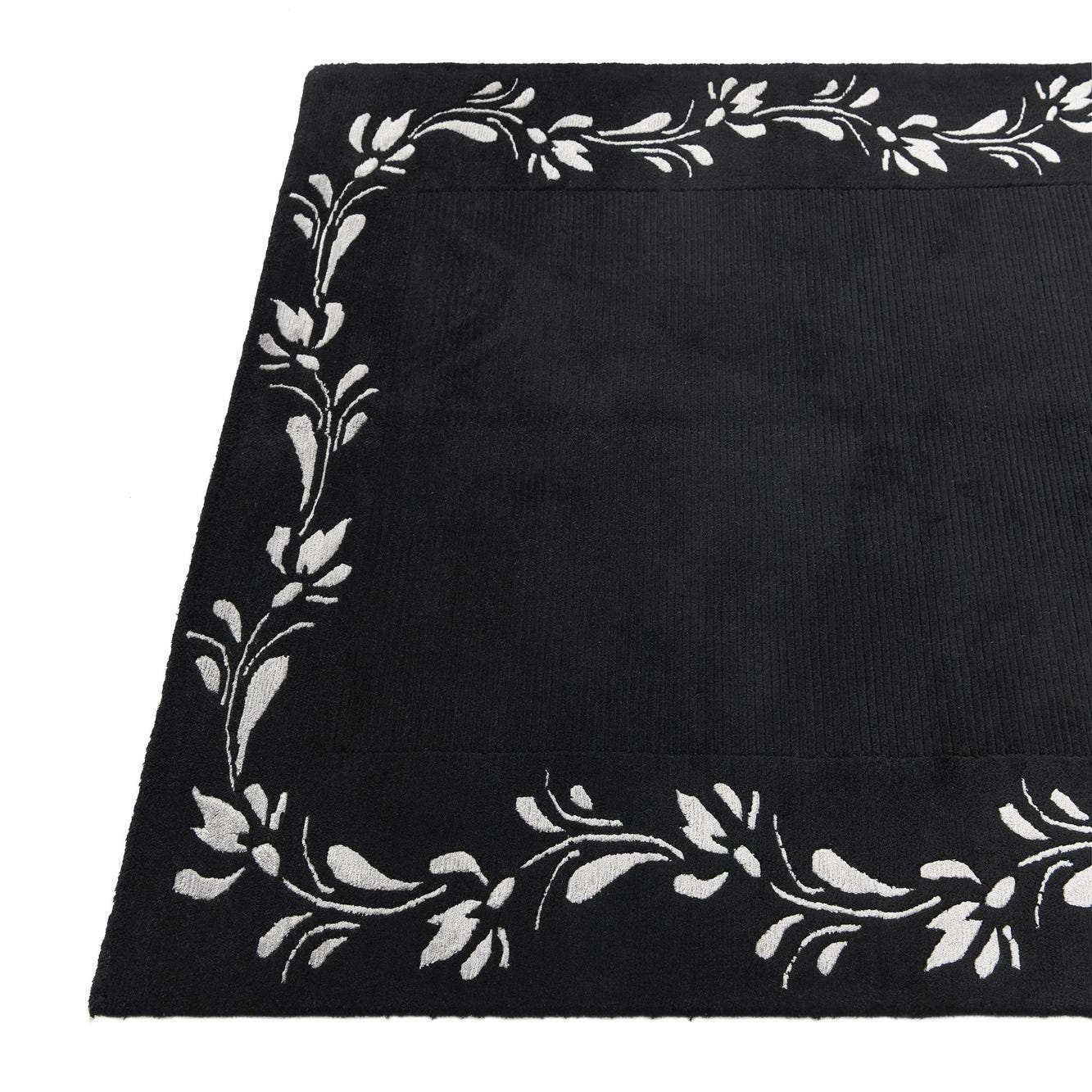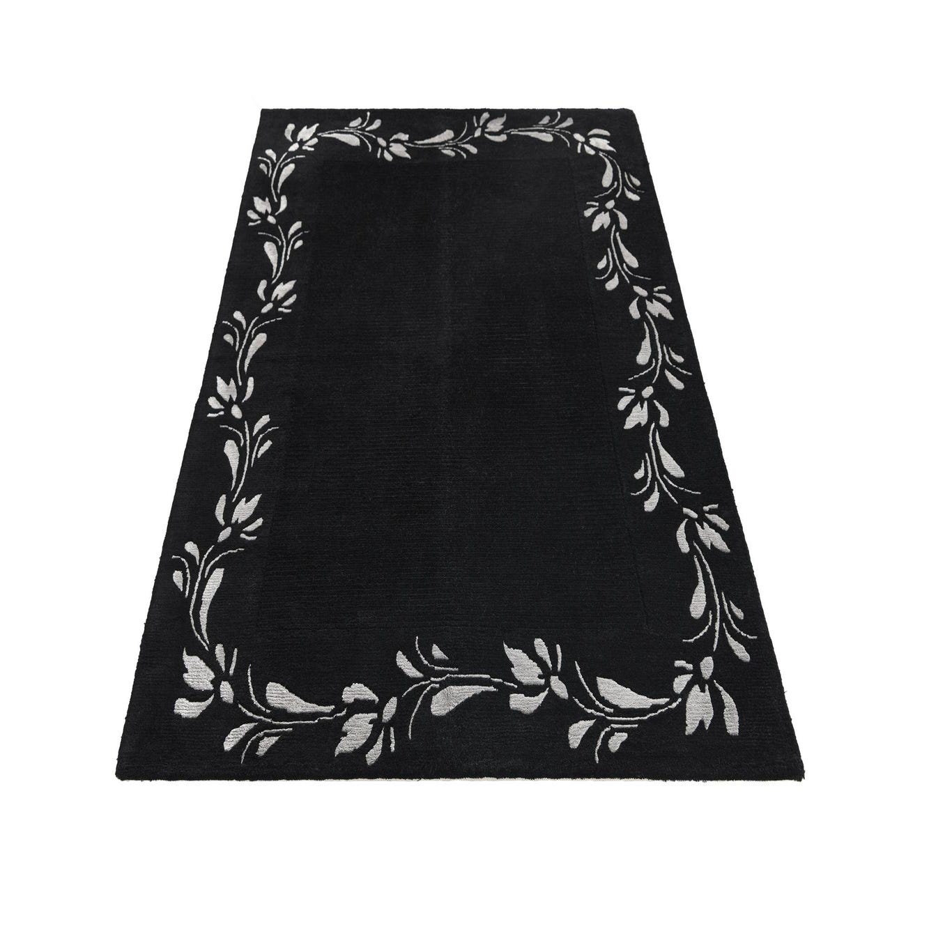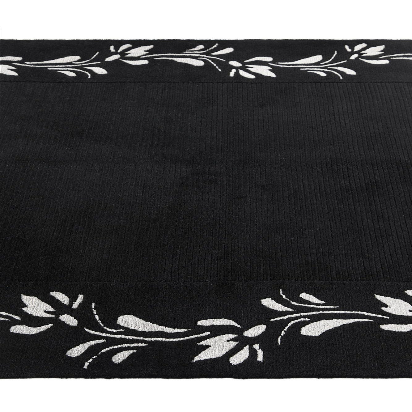 A 3x5 rectangular black area rug with a contrasting white floral vine border, showcasing a modern Persian style.