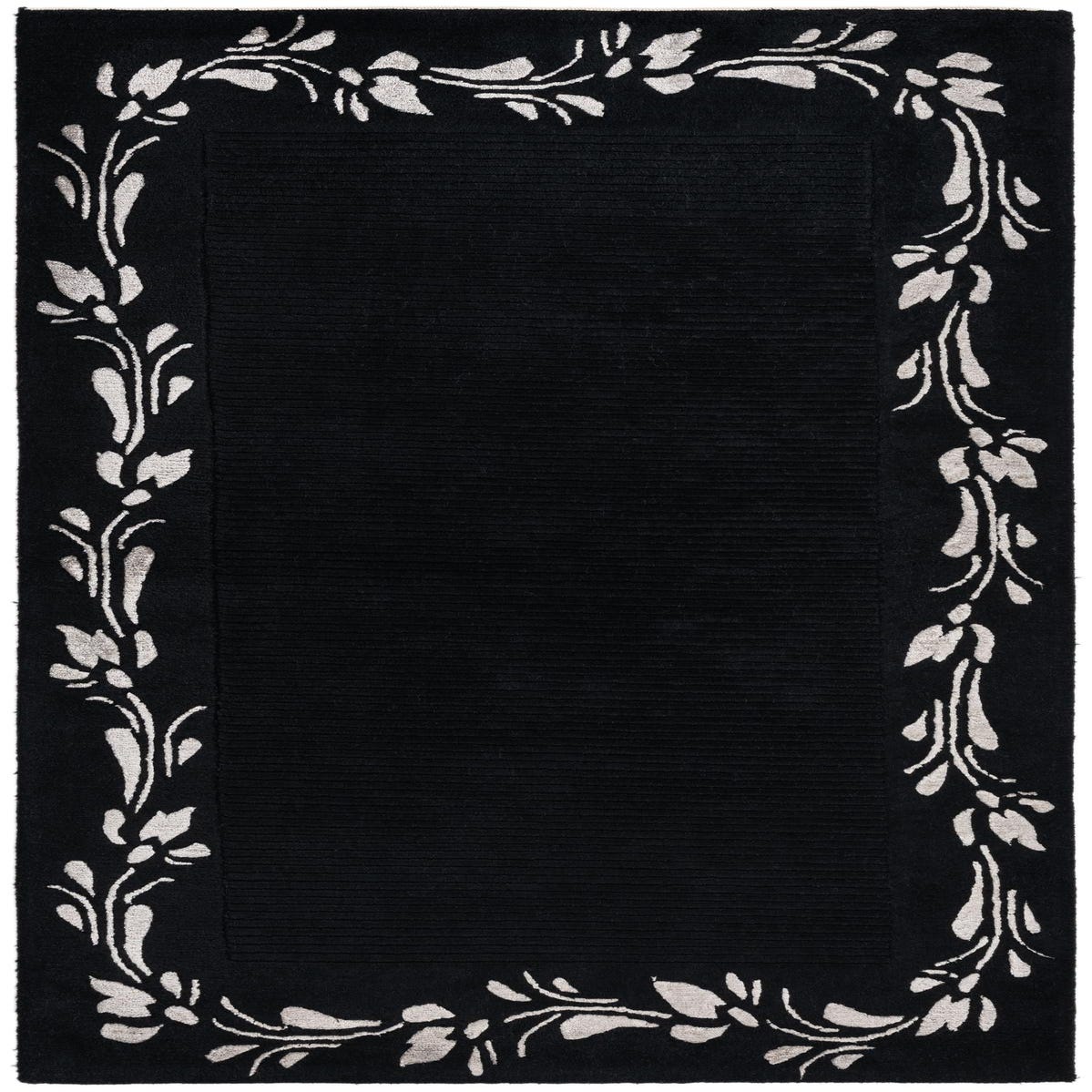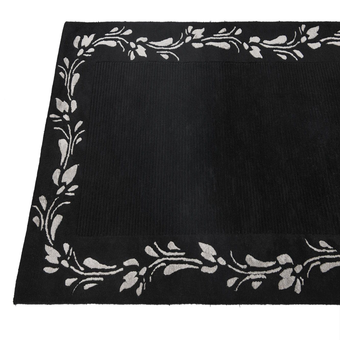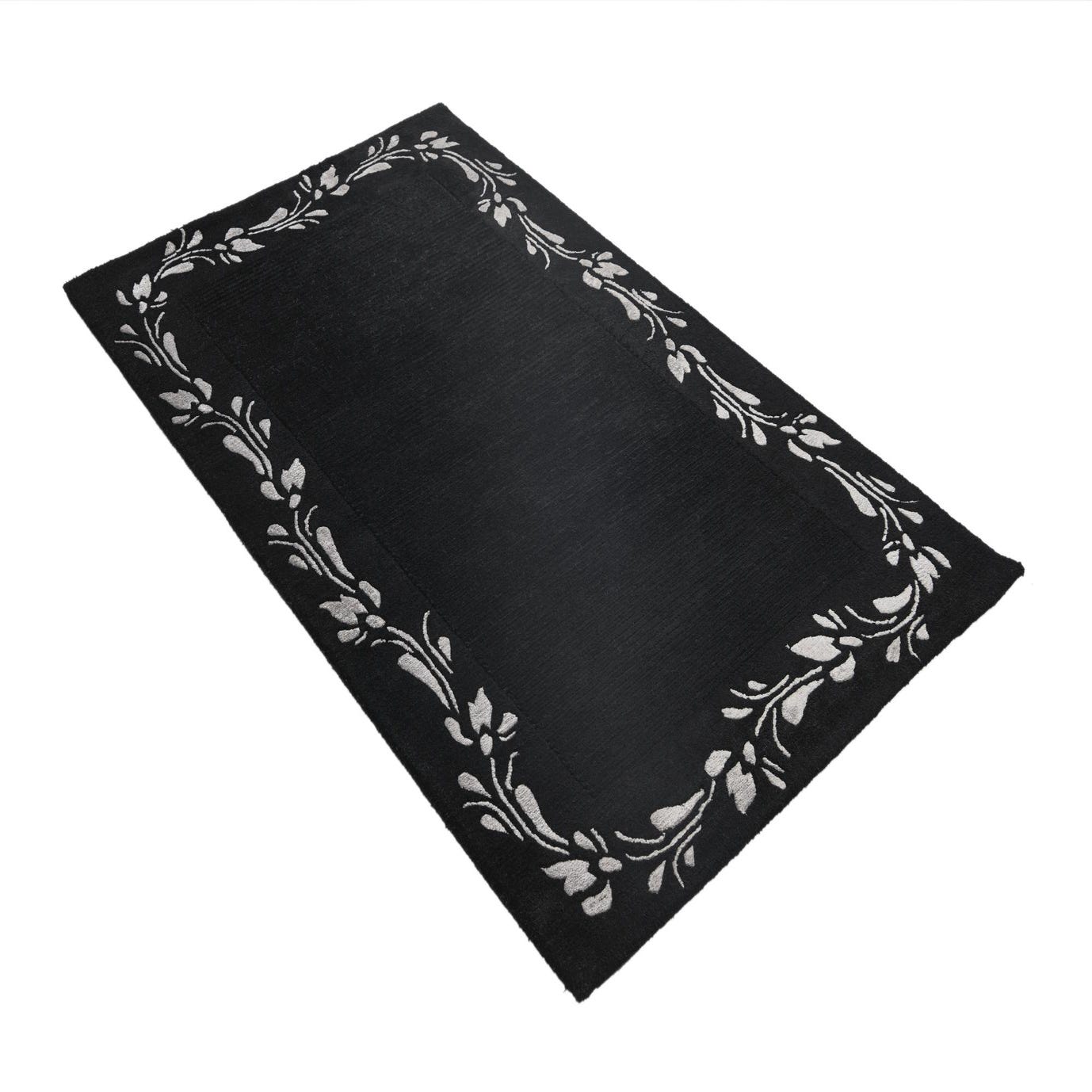 A 3x5 rectangular black wool rug with a high pile and a light grey modern floral border pattern.