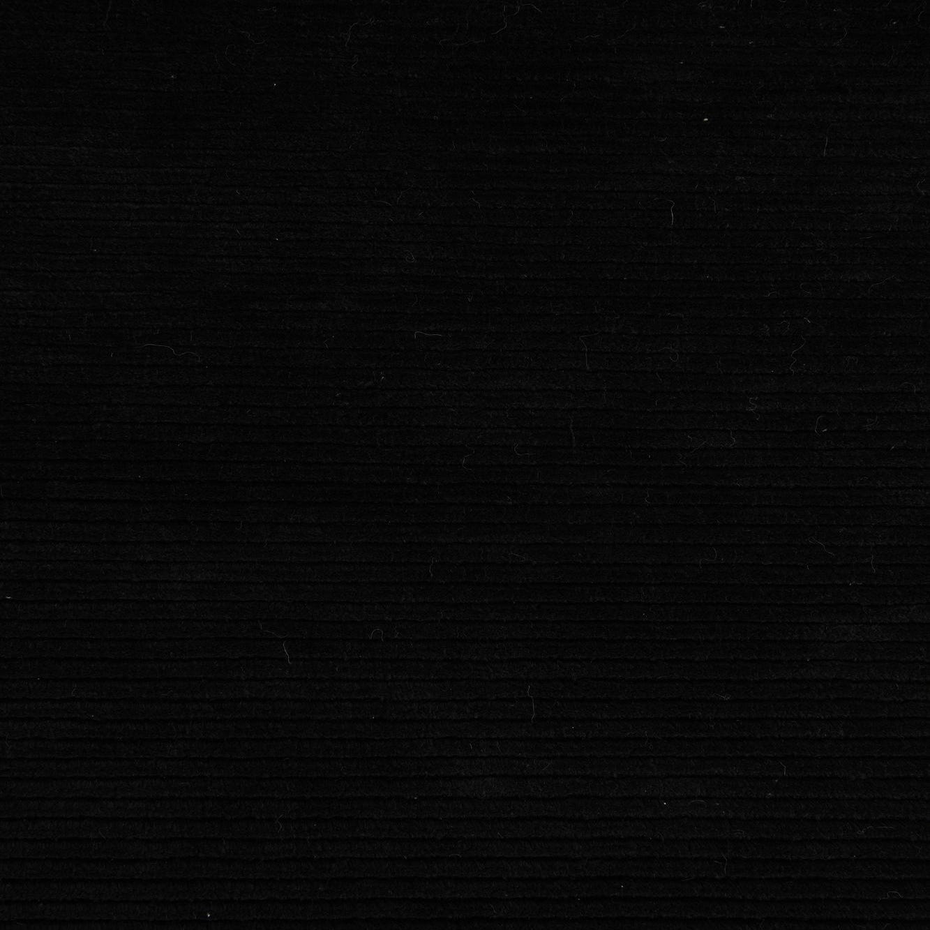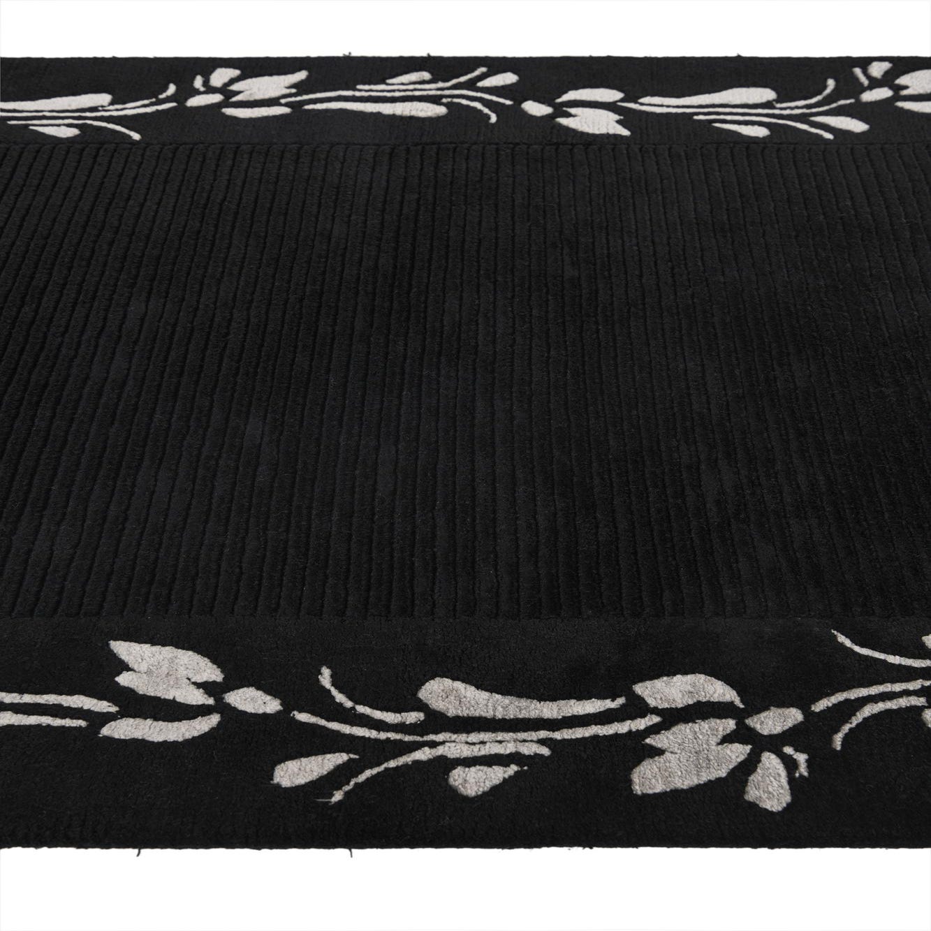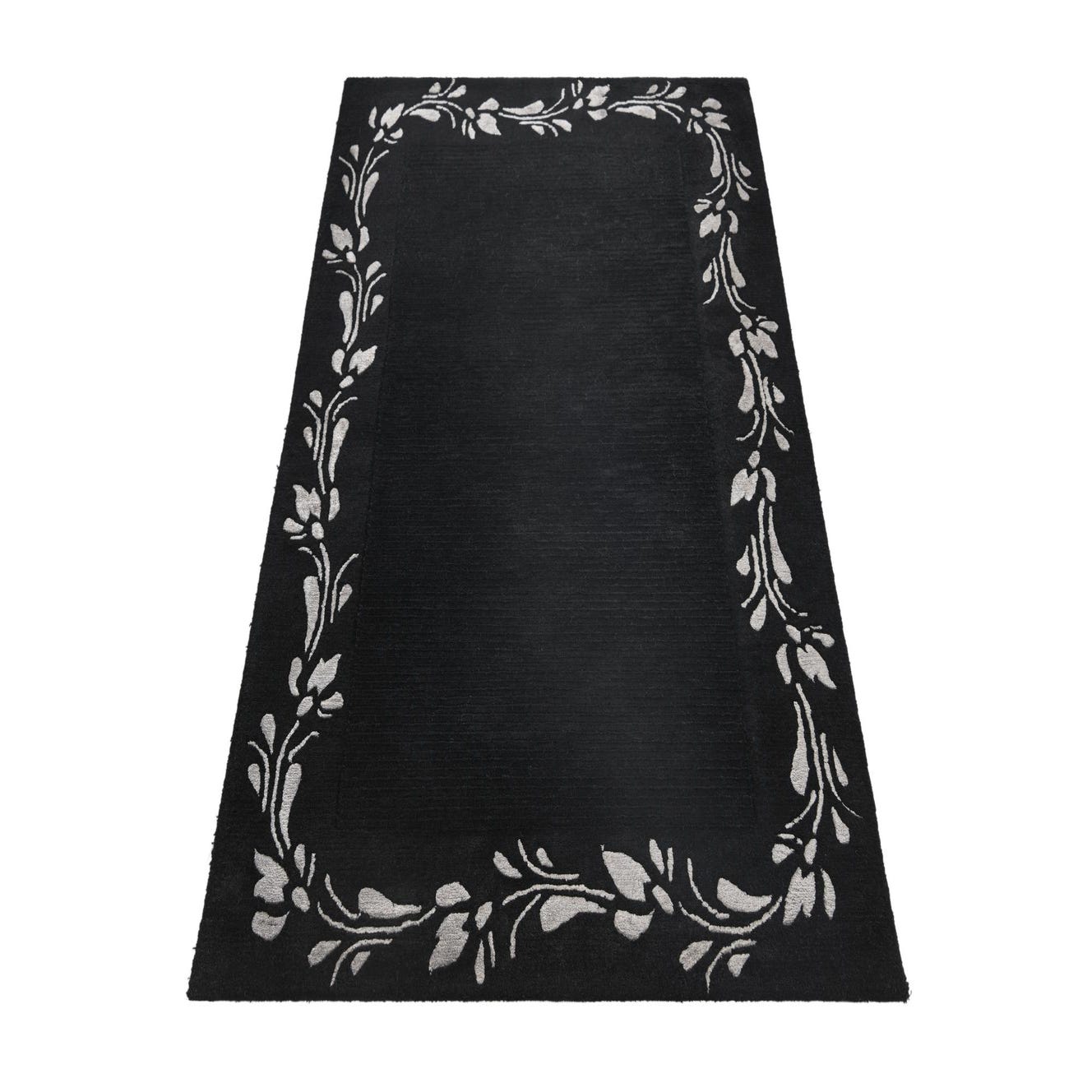 A 3x5 rectangular black wool rug with a high pile and a light grey modern floral border pattern.