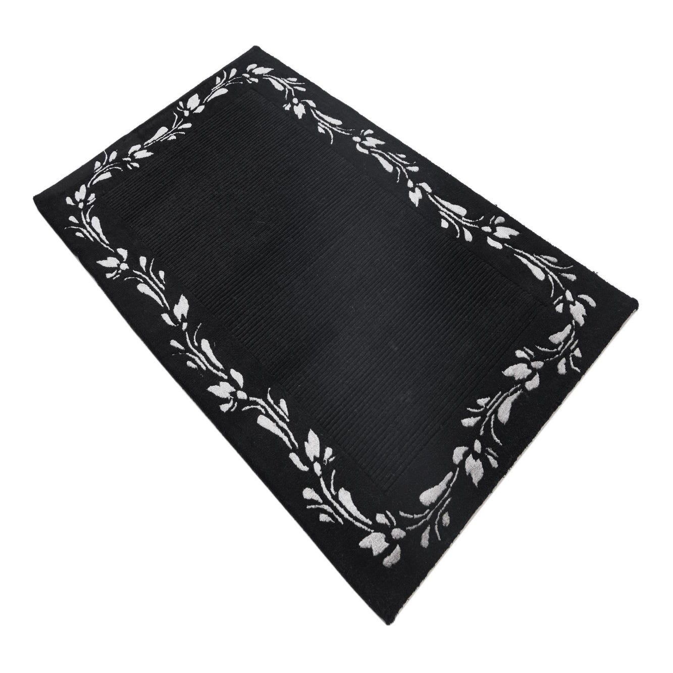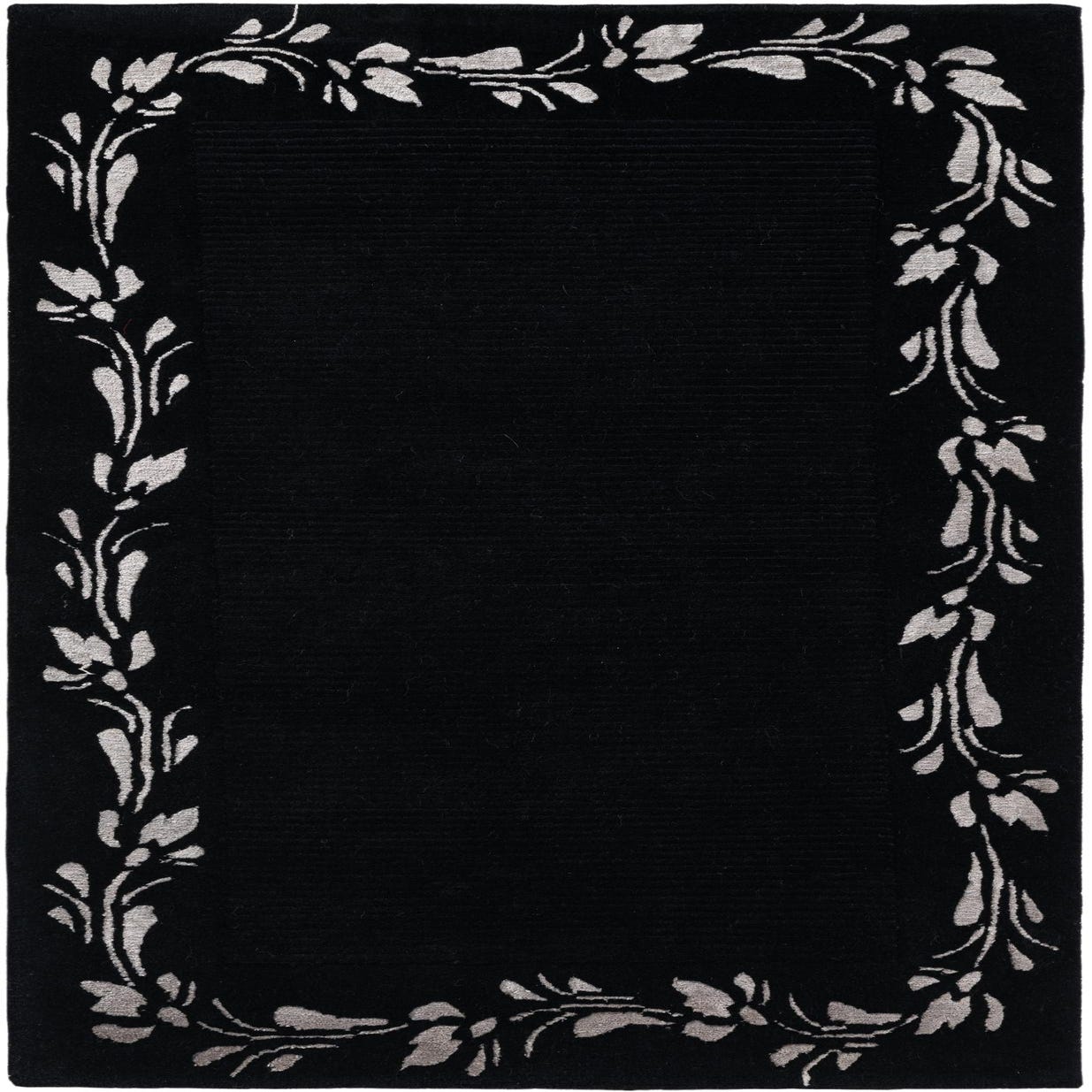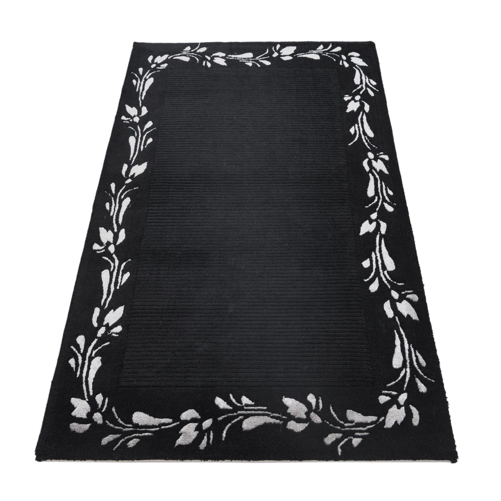 A 3x5 rectangular black wool rug with an elegant light gray floral vine border, adding a touch of modern oriental style.